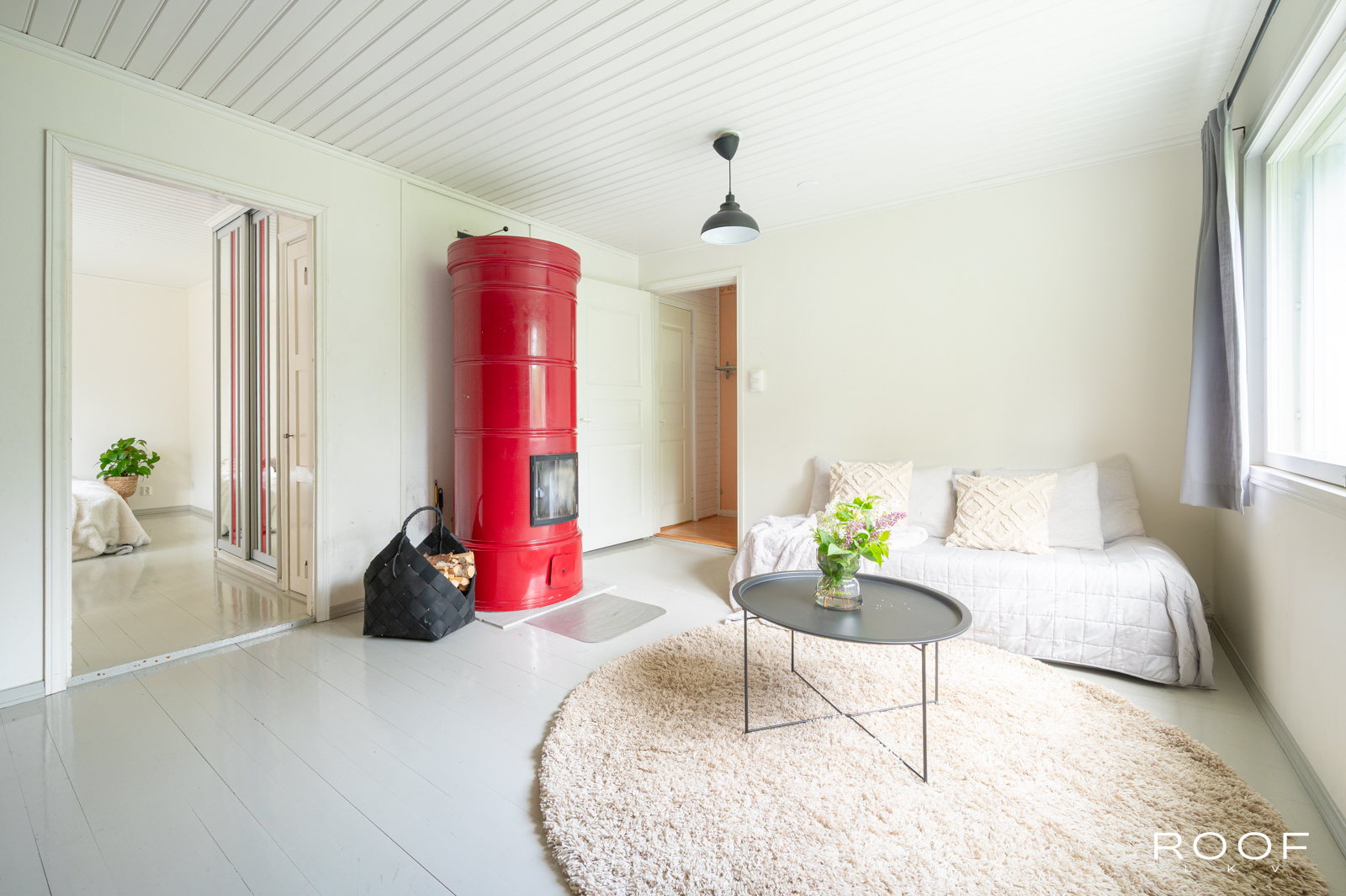 Talo on tiettävästi rakennettu vuonna 1947, ja siinä on kodikas pohjaratkaisu, joka sopii mainiosti yksin tai kaksin asuvalle. Sisääntulo tapahtuu kuistin kautta, josta kuljetaan eteisen läpi tilavaan olohuoneeseen. Katseenvangitsijana toimii suloinen punainen pönttöuuni. Makuuhuoneessa on mukavasti tilaa, ja keittiöön mahtuu hyvin ruokapöytä. Wc ja suihkutila sijaitsevat kätevästi eteisen vieressä.
