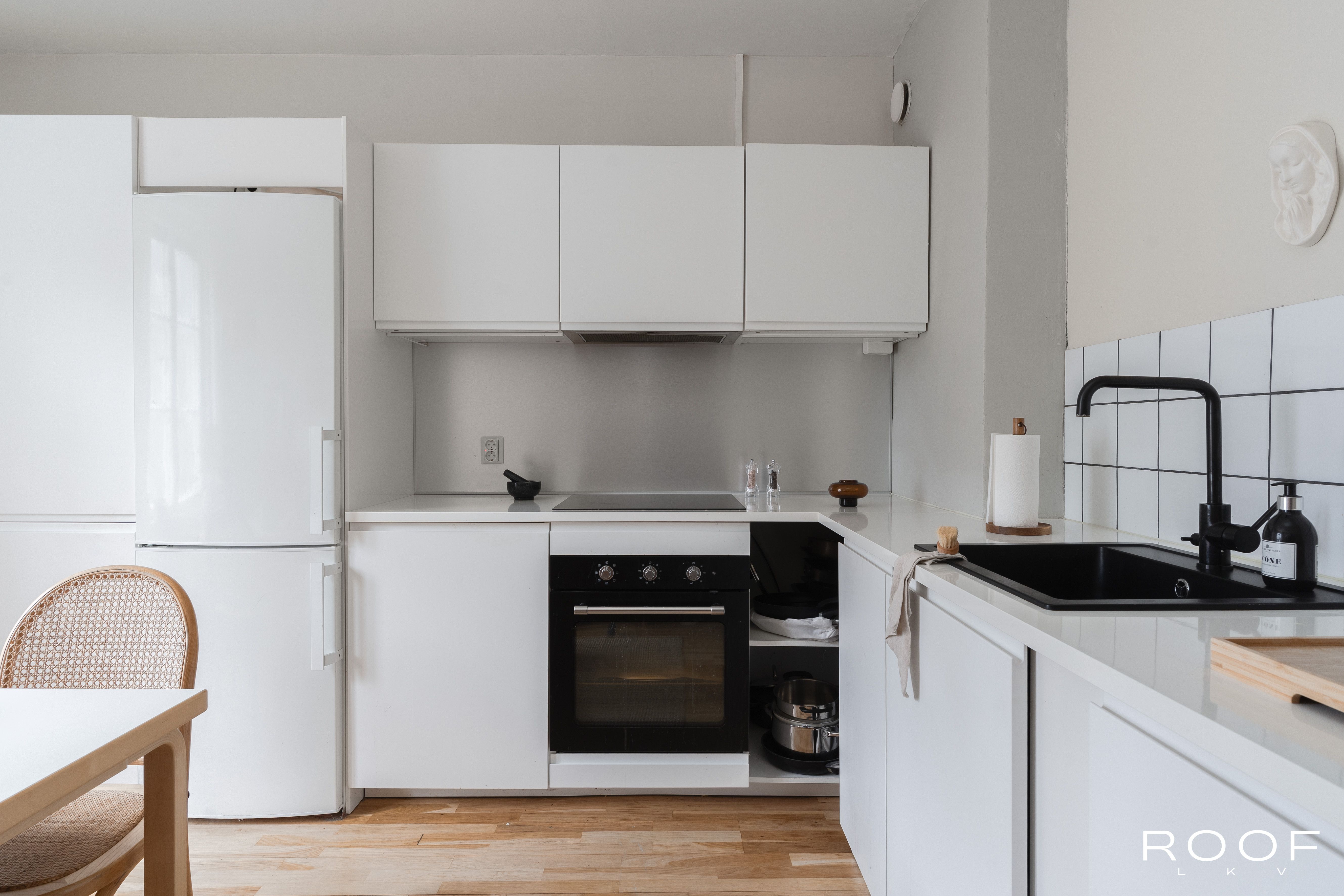 avaruudellaan. Suuret ikkunat tuovat runsaasti luonnonvaloa sisään. Moderni keittiö on varustettu laadukkailla kodinkoneilla seka
