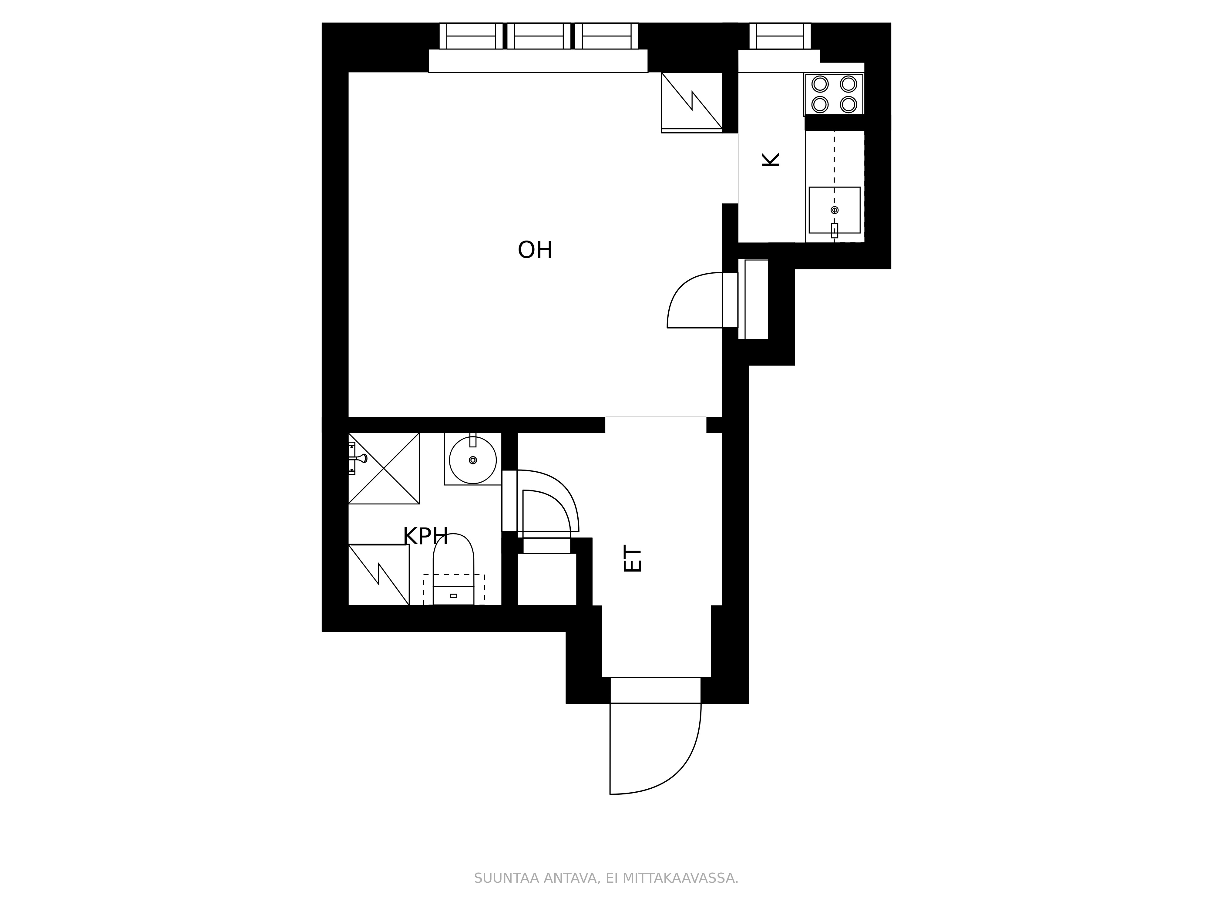 Lattiat keittiössä, olohuoneessa ja makuuhuoneessa ovat parkettia. Keittiö on avoin olohuoneeseen ja sinne on saatu mahtumaan kaikki oleellinen kotikokkausta varten.