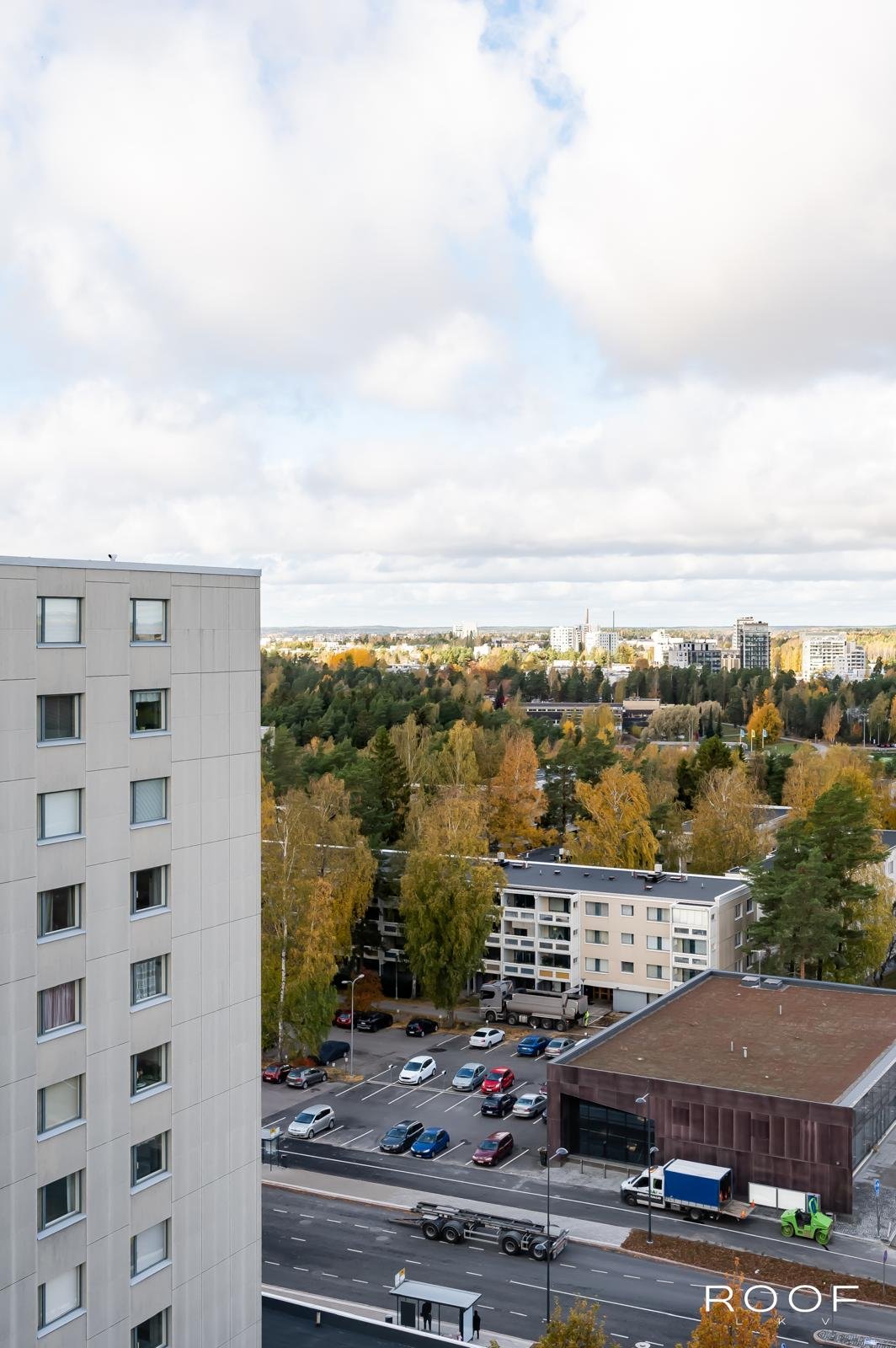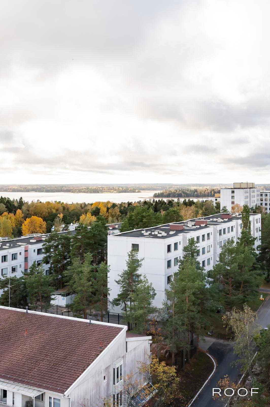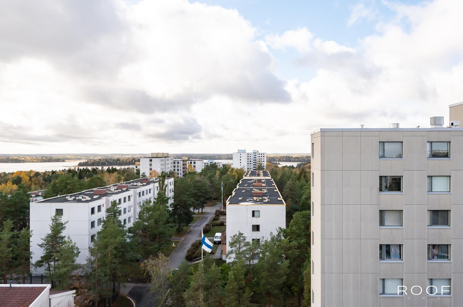 Valoisa ja toimivapohjainen yksiö Soukassa, ylimmässä 10. kerroksessa. Olohuoneen ja keittiön ikkunoista sekä lasitetulta parvekkeelta avautuu osittainen merinäköala ja vehreä kaupunkimaisema.