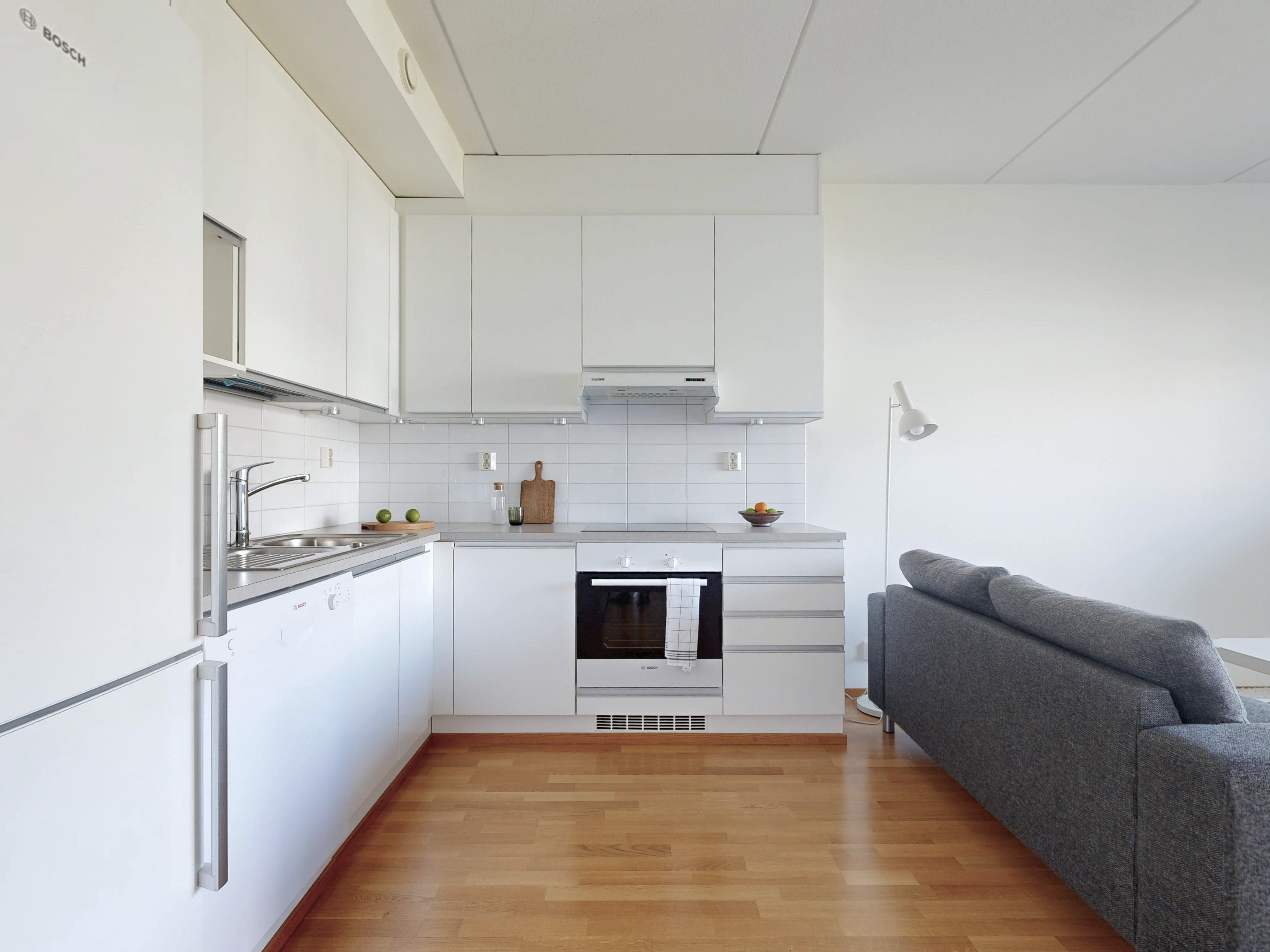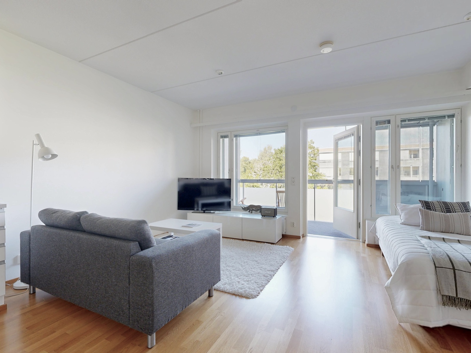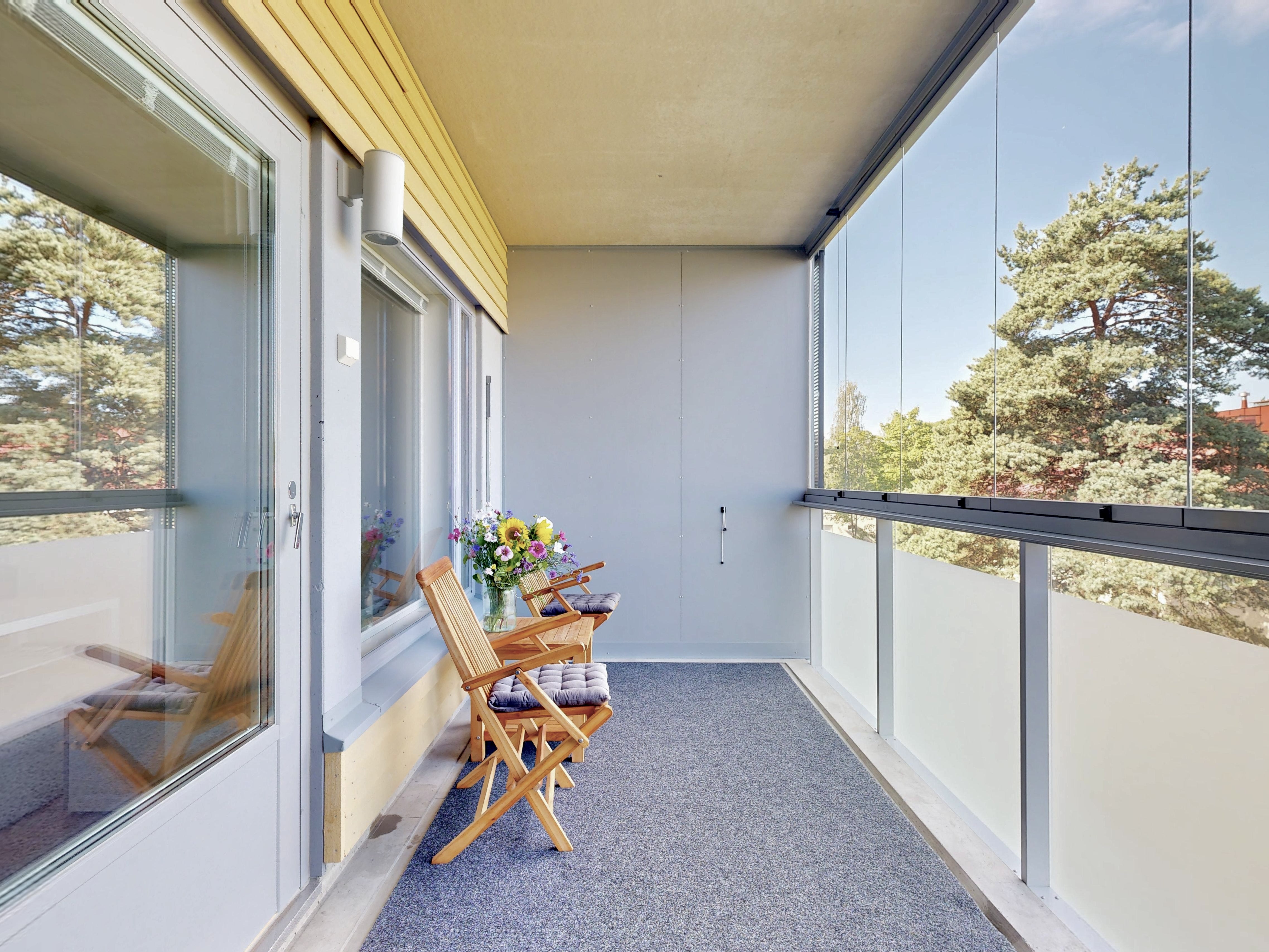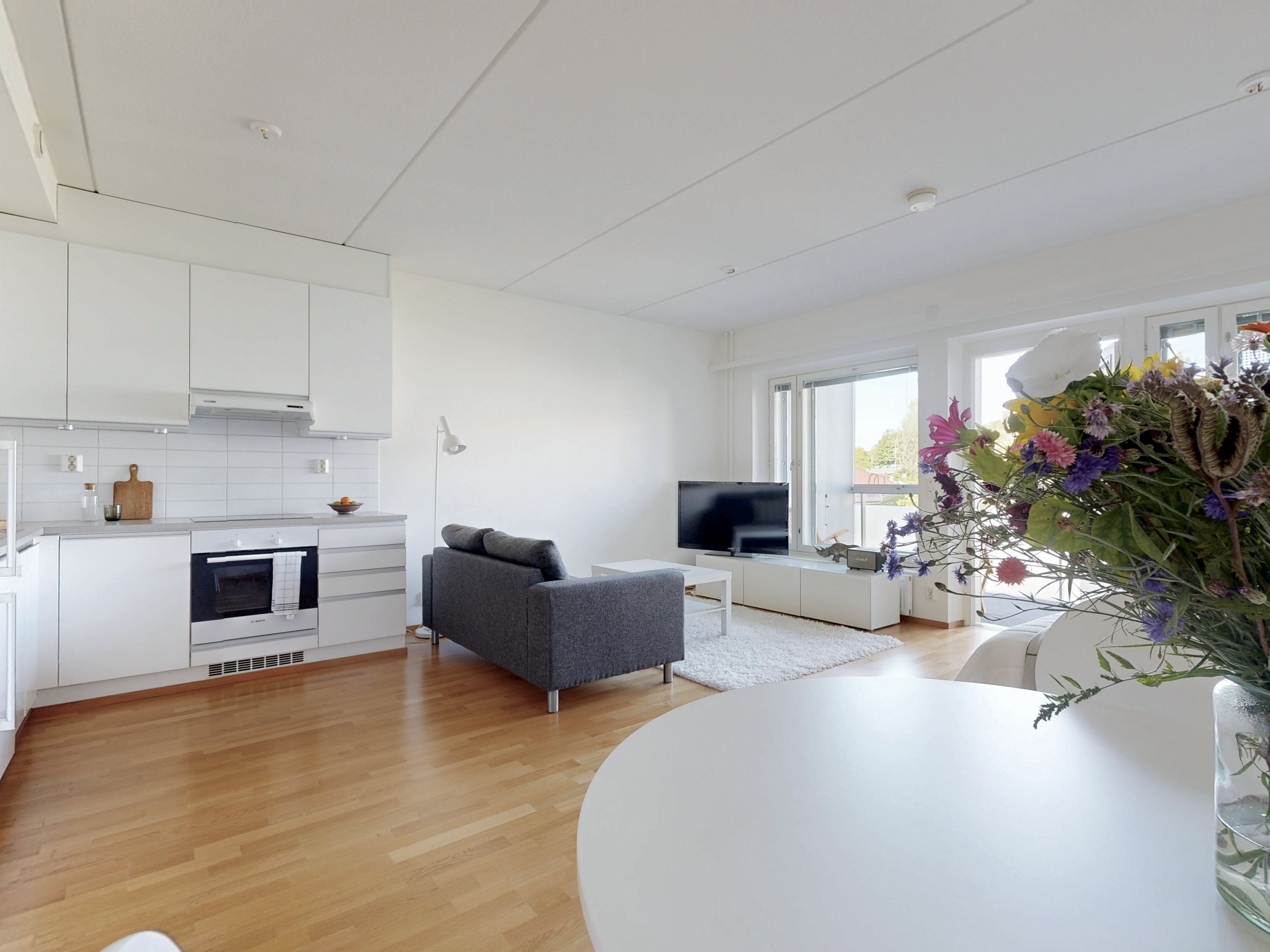 Tässä kodissa hurmaa avara keittiö-olohuoneratkaisu toimii kodin sydämenä, josta käynti lasitetulle parvekkeelle. Keittiössä hyvin säilytys ja laskutilaa. Olohuoneen vieressä tilaa ruokapöydälle ja parisängylle. Säilytystilaa eteisessä olevissa kaapeissa. Tilava kylpyhuone, johon mahtuu pyykinpesukone.