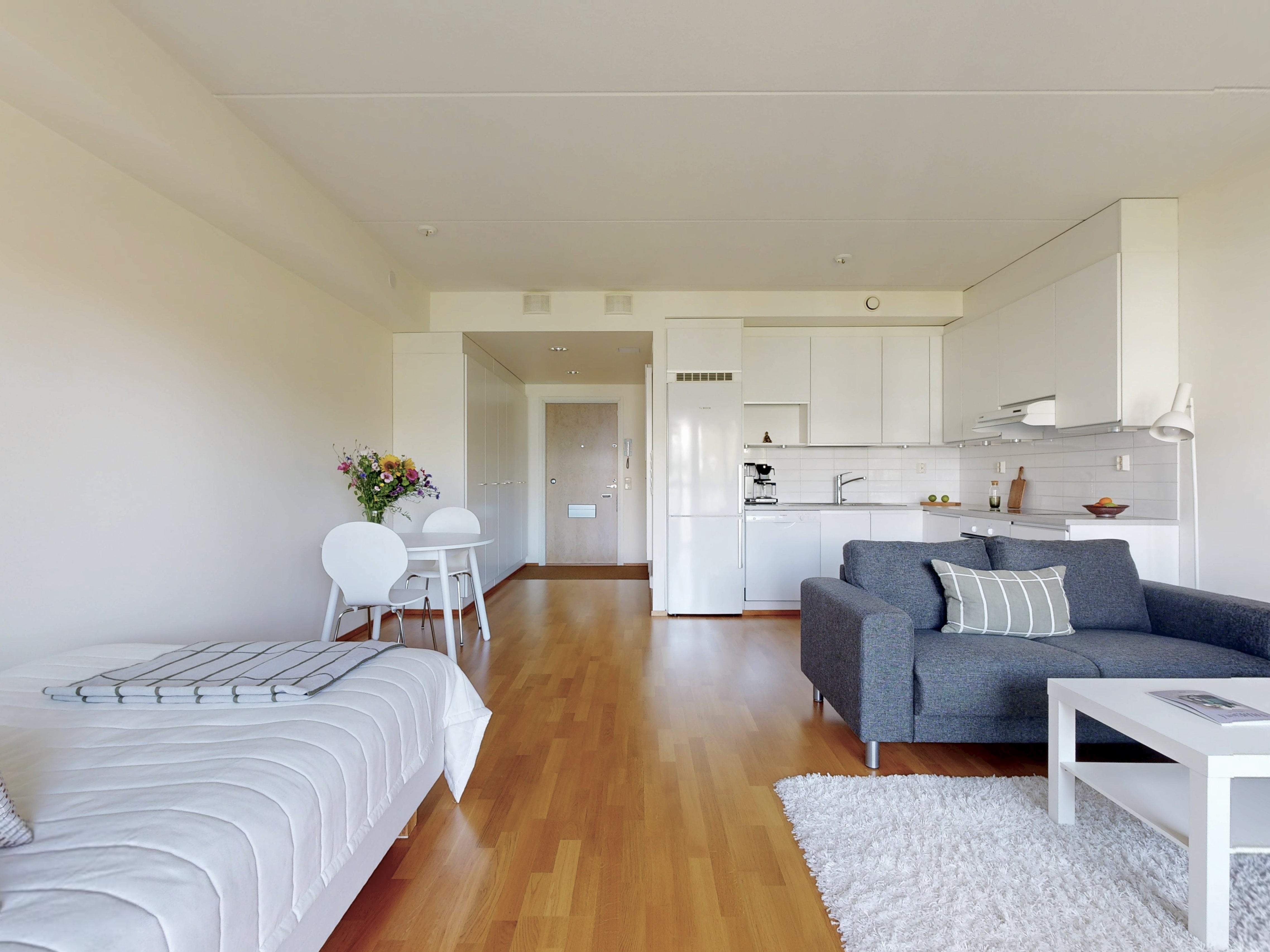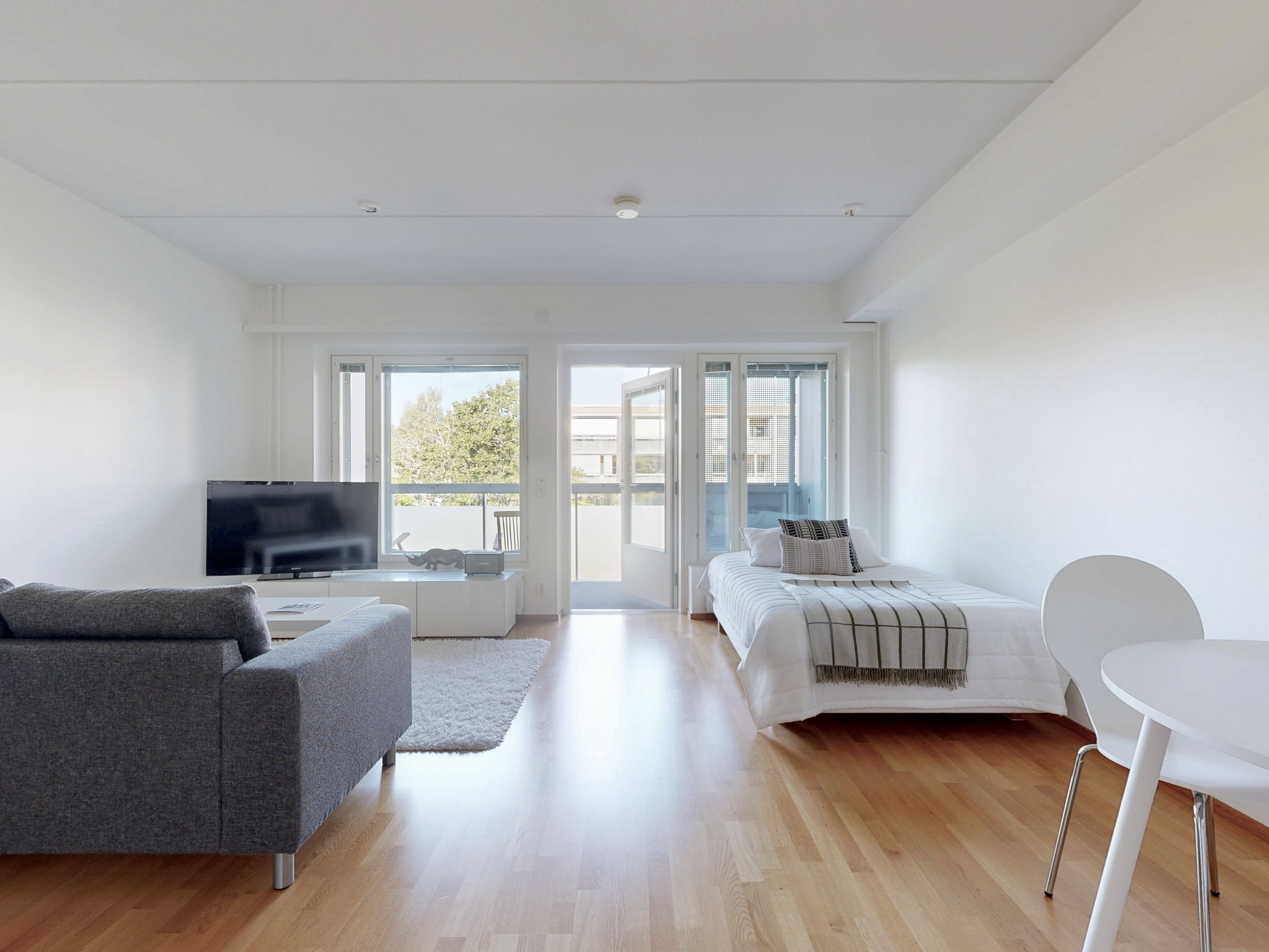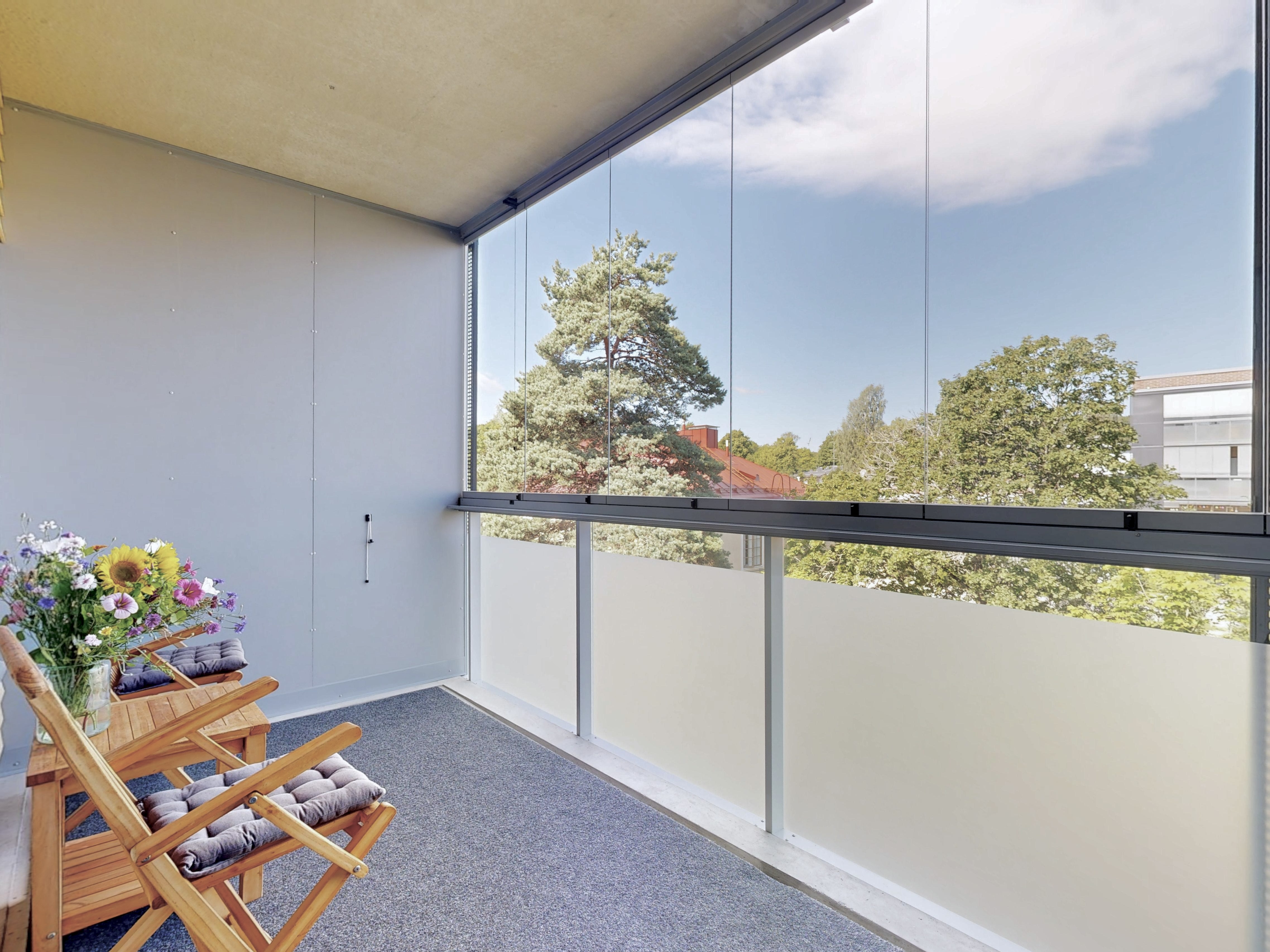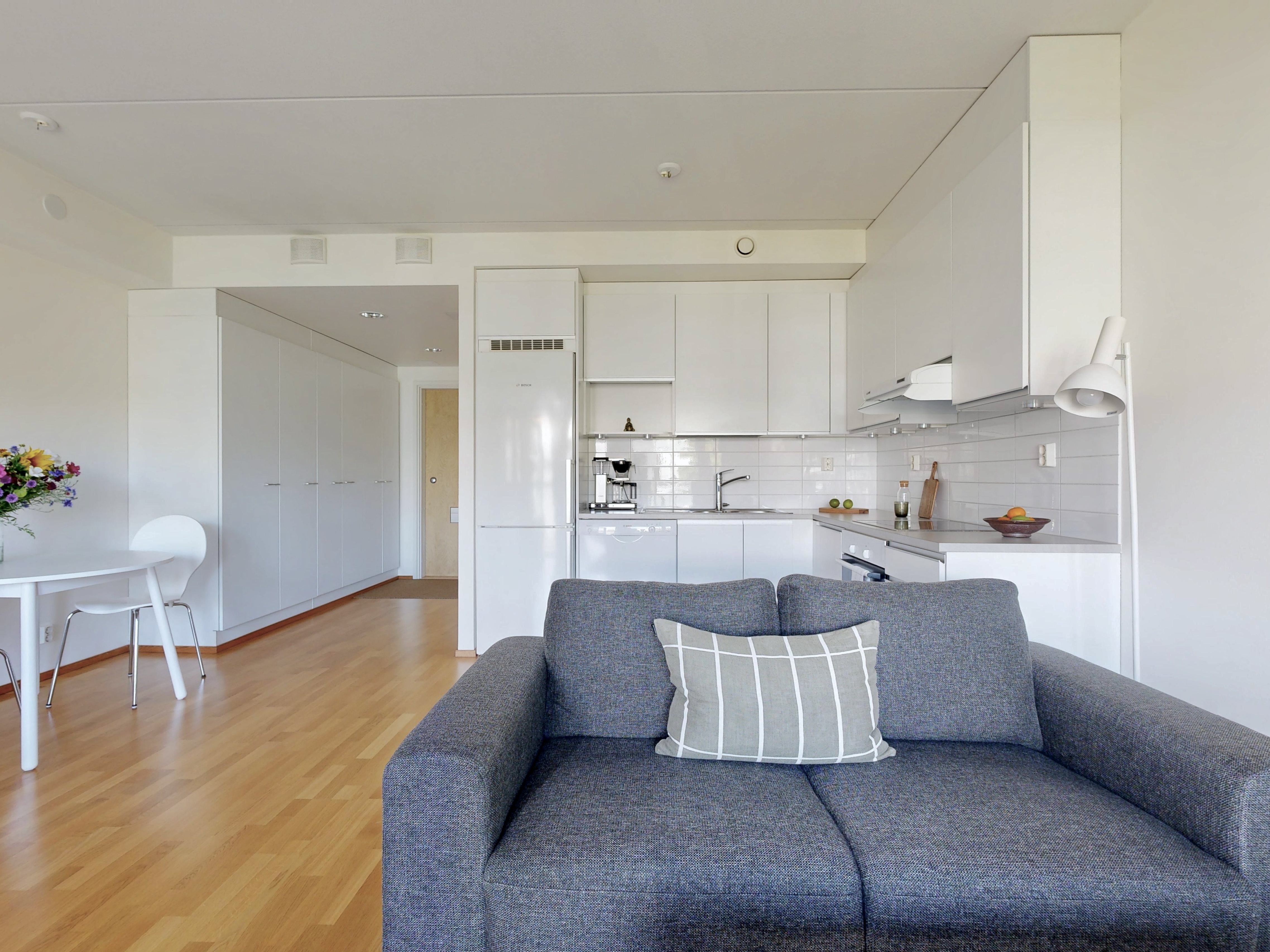 Tässä kodissa hurmaa avara keittiö-olohuoneratkaisu toimii kodin sydämenä, josta käynti lasitetulle parvekkeelle. Keittiössä hyvin säilytys ja laskutilaa. Olohuoneen vieressä tilaa ruokapöydälle ja parisängylle. Säilytystilaa eteisessä olevissa kaapeissa. Tilava kylpyhuone, johon mahtuu pyykinpesukone.