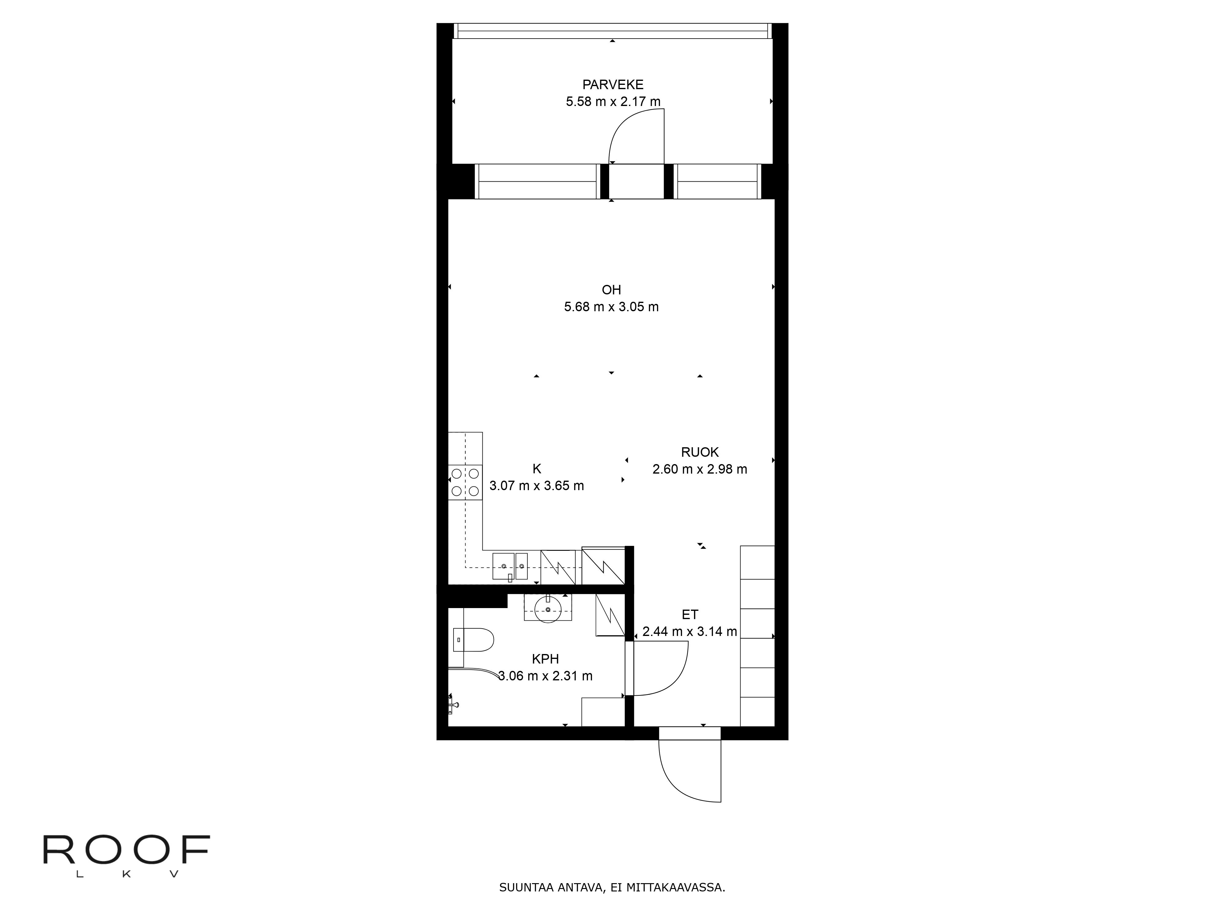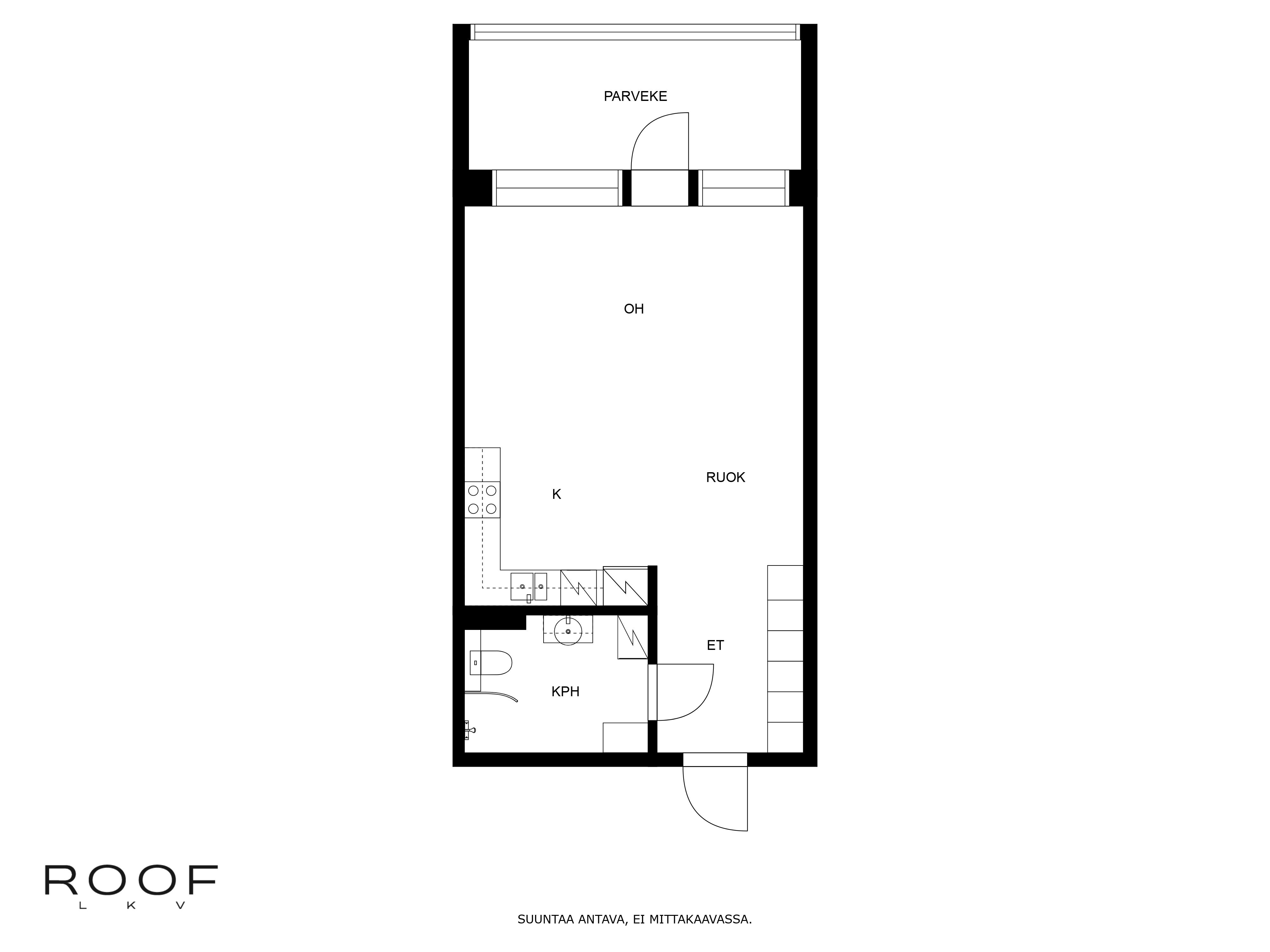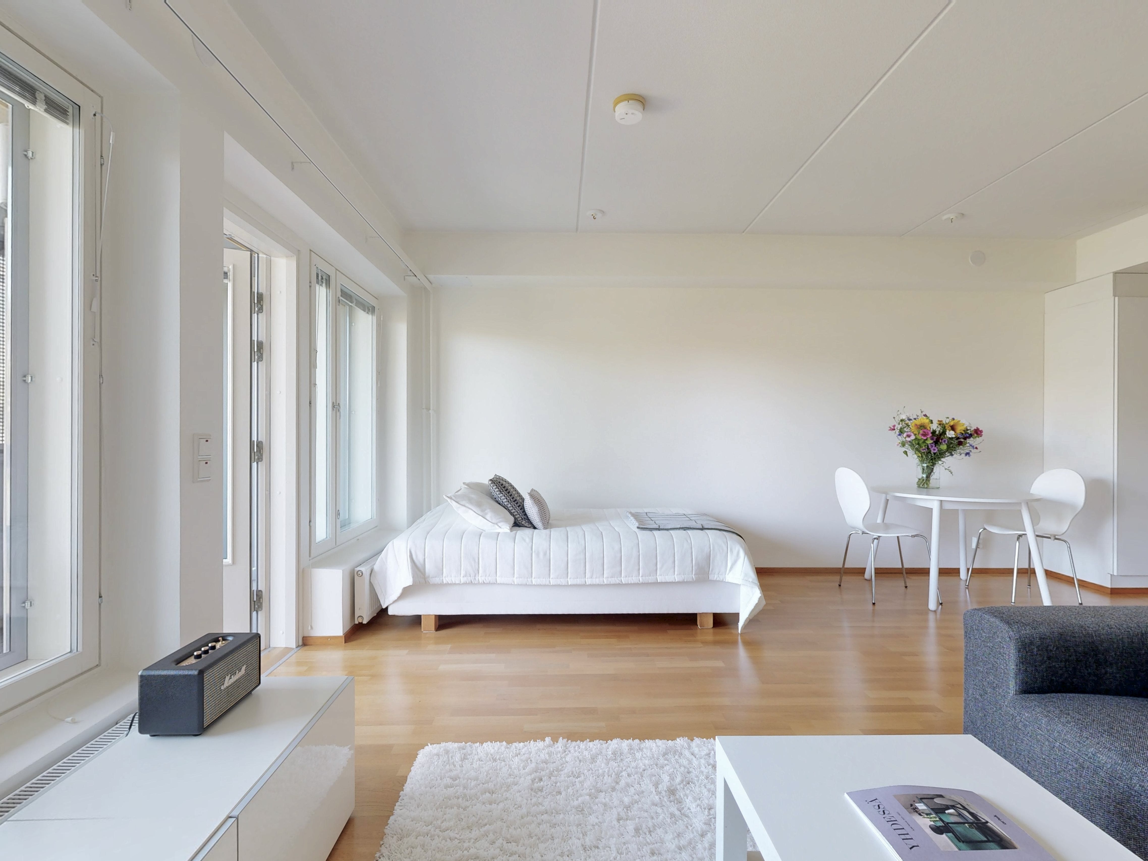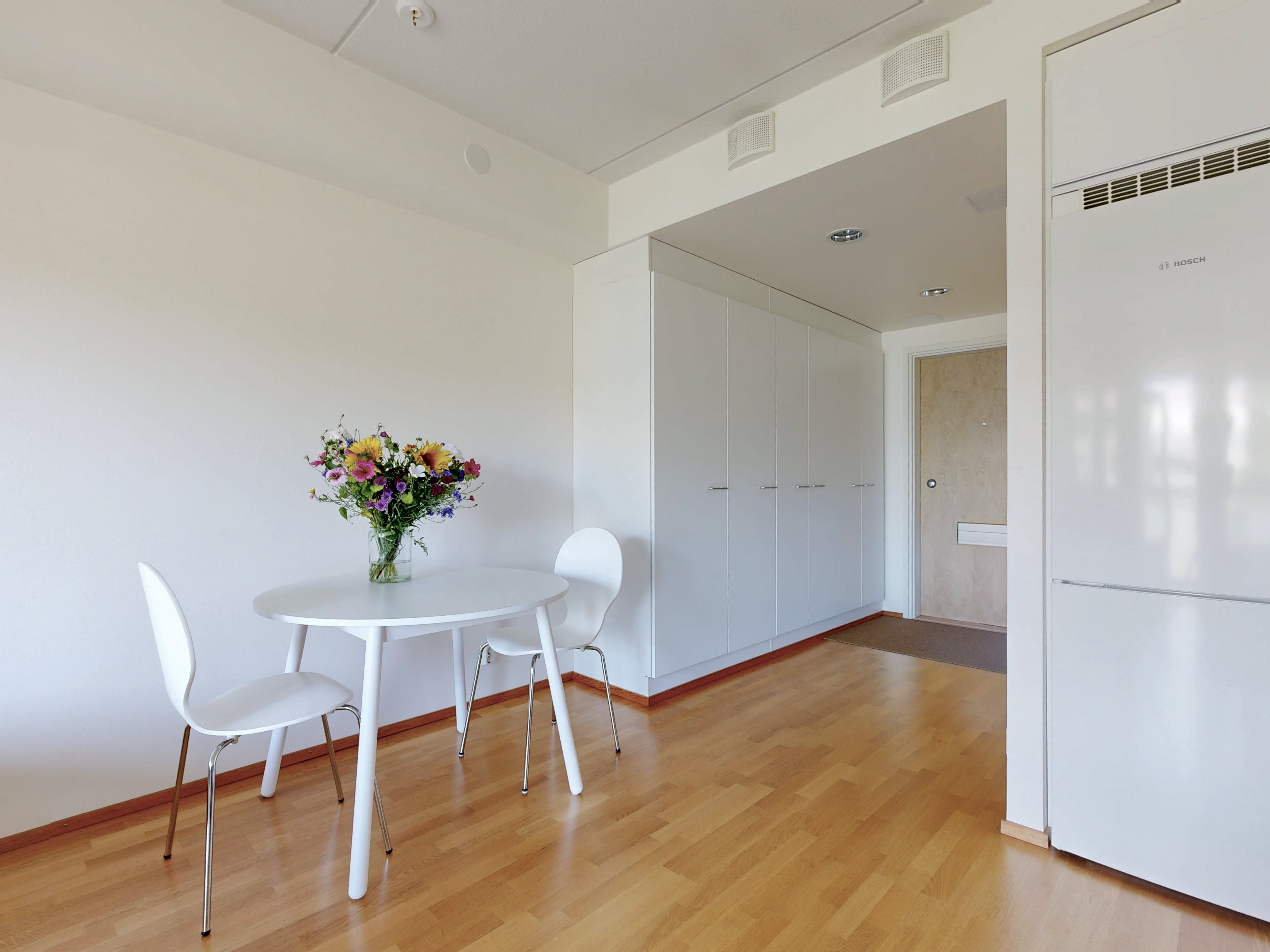 Tässä kodissa hurmaa avara keittiö-olohuoneratkaisu toimii kodin sydämenä, josta käynti lasitetulle parvekkeelle. Keittiössä hyvin säilytys ja laskutilaa. Olohuoneen vieressä tilaa ruokapöydälle ja parisängylle. Säilytystilaa eteisessä olevissa kaapeissa. Tilava kylpyhuone, johon mahtuu pyykinpesukone.