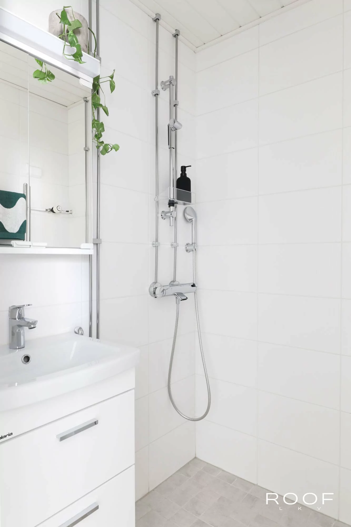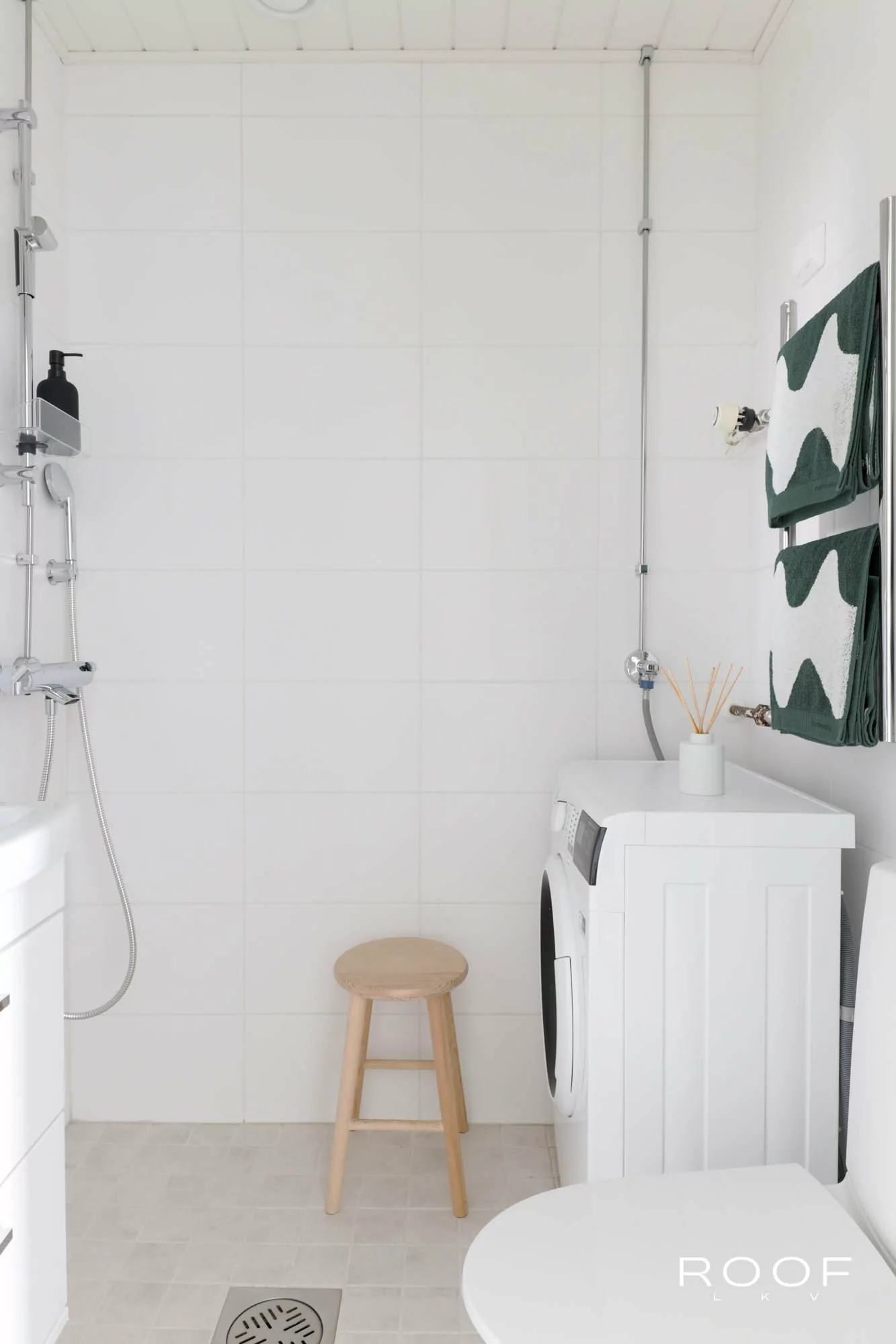 Kylpyhuone on uusittu samaan hillittyyn ja harmoniseen tyyliin kuin muutkin pinnat, eikä mitään tarvitse tehdä valmiiksi tullessaan.