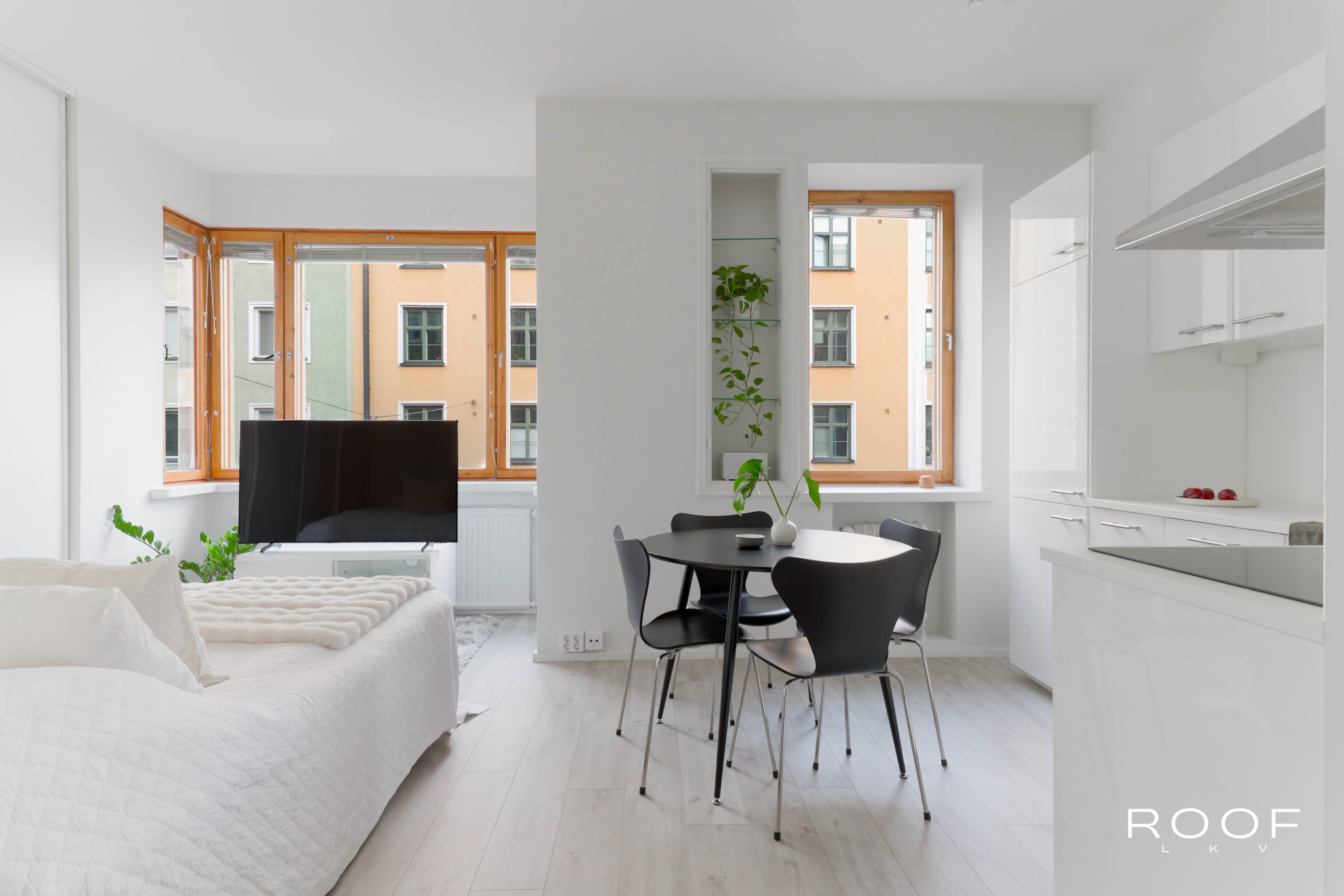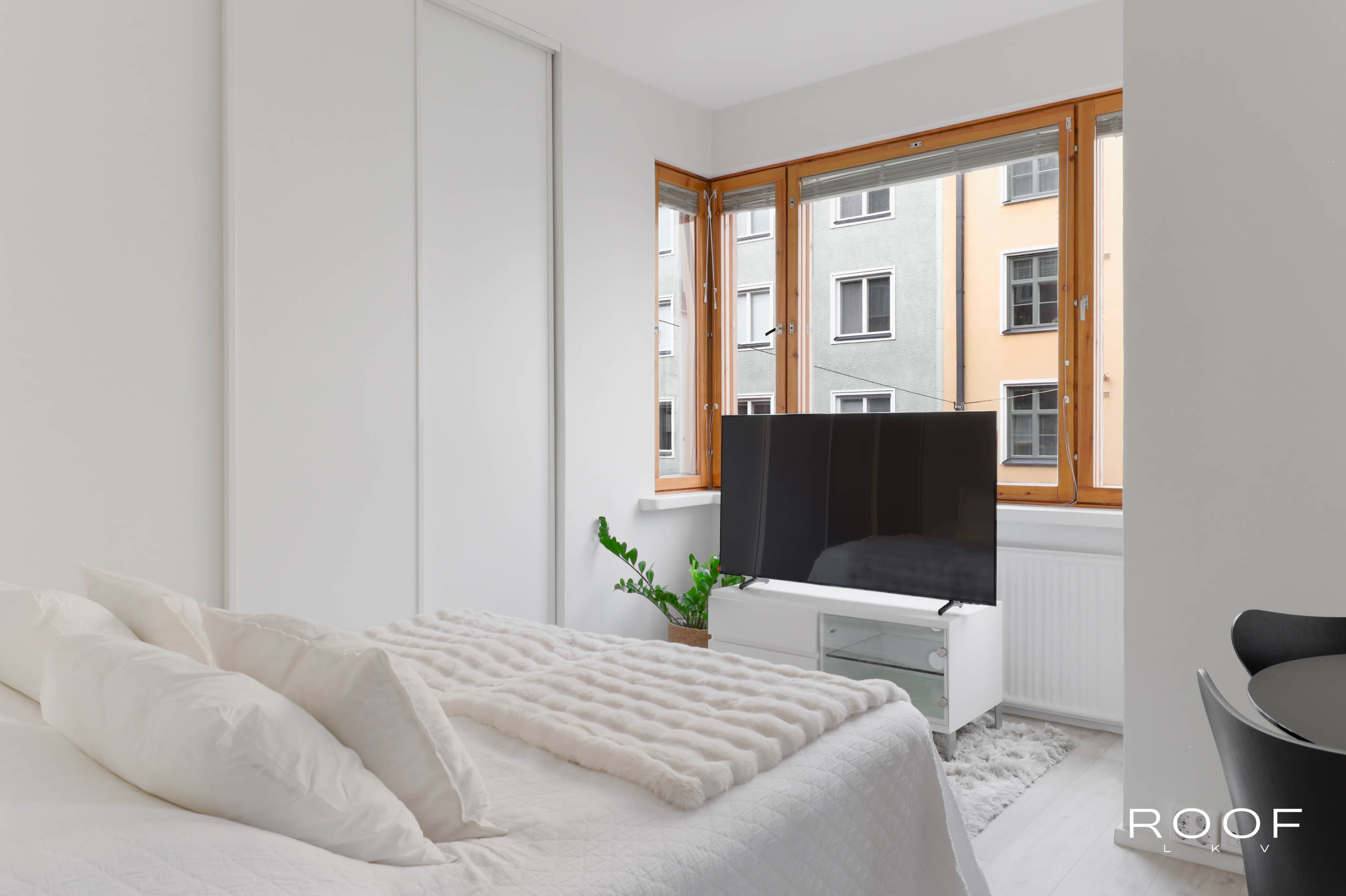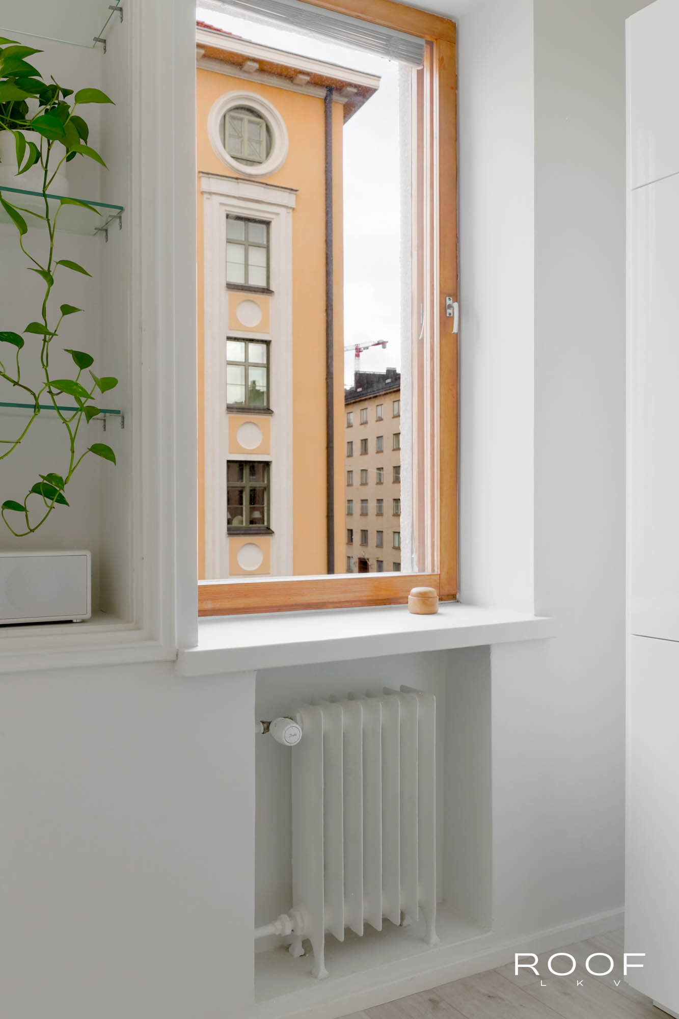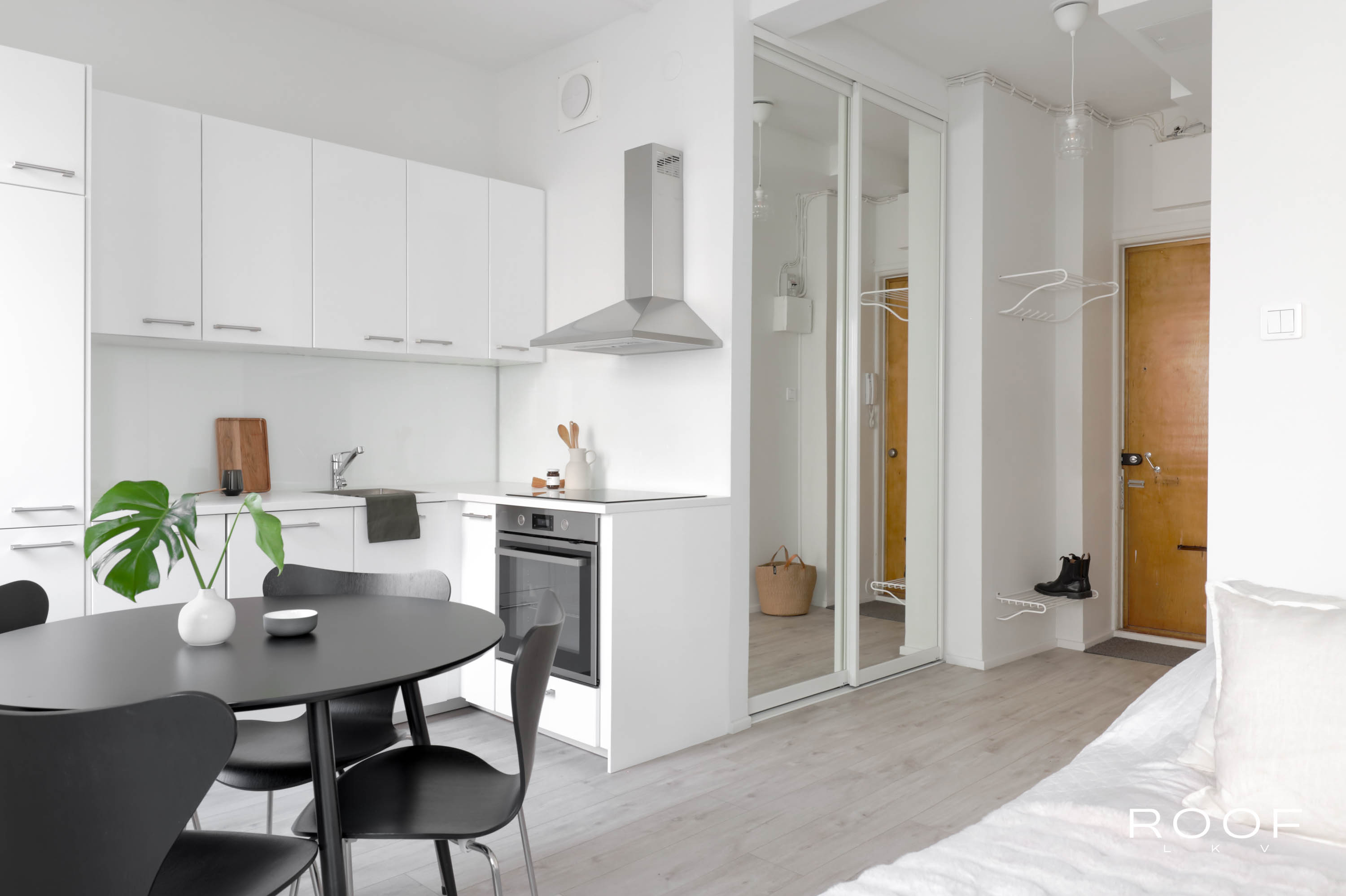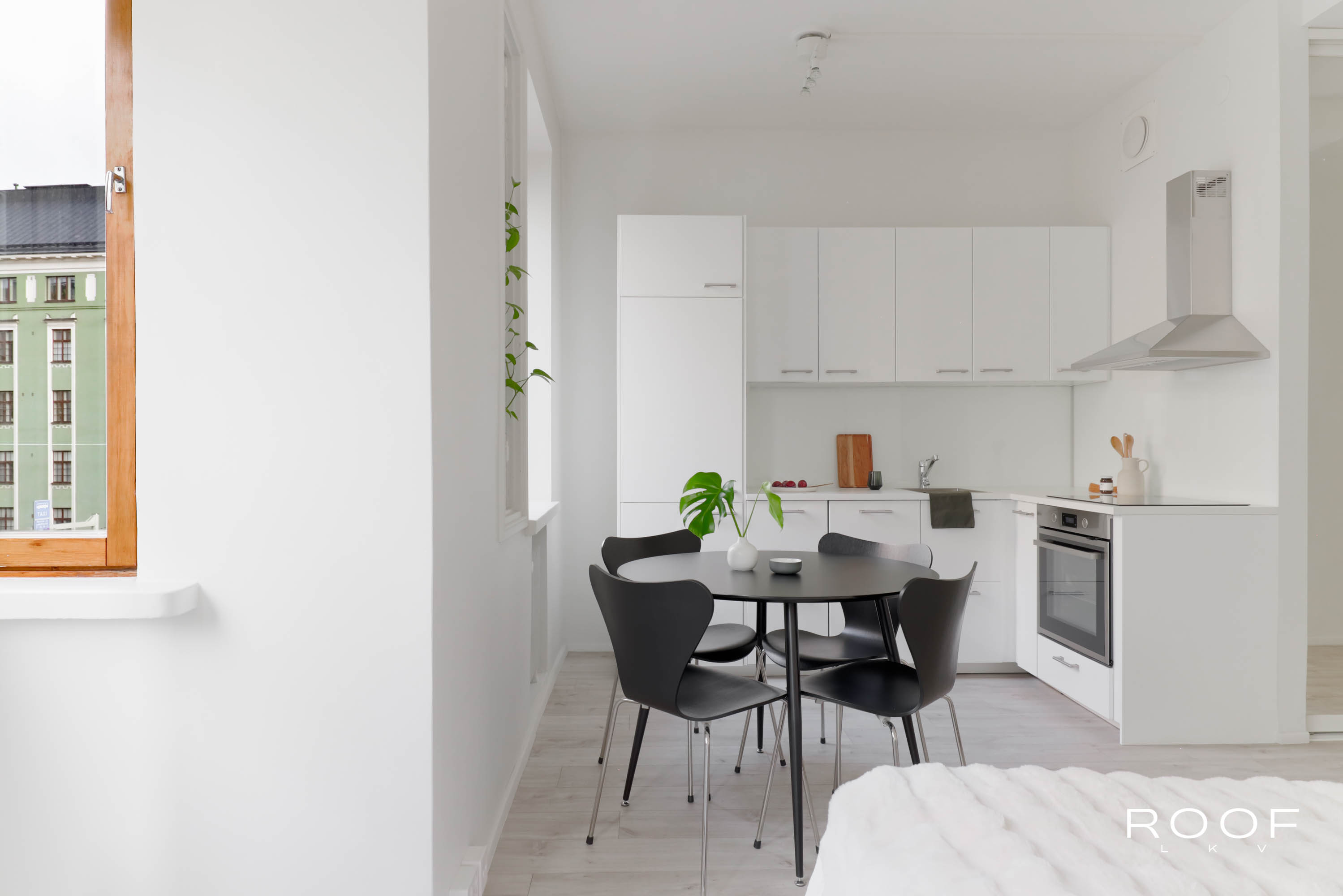 Tämä 27 m²:n yksiö Töölön Ruusankadulla on pari vuotta sitten valmistuneen remontin jäljiltä muuttovalmis ja kauniin vaaleasävyinen. Huoneen korkea huonekorkeus ja erkkeri leveine ikkunalautoineen tuovat tilaan ilmavuutta ja vanhan talon arvokkuutta. Seinään upotettu kaappi lasihyllyineen yhdistää tyylikkäästi talon alkuperäistä henkeä ja nykyaikaista viimeistelyä, ja säilytystilaa on pieneen kokoon nähden poikkeuksellisen paljon.