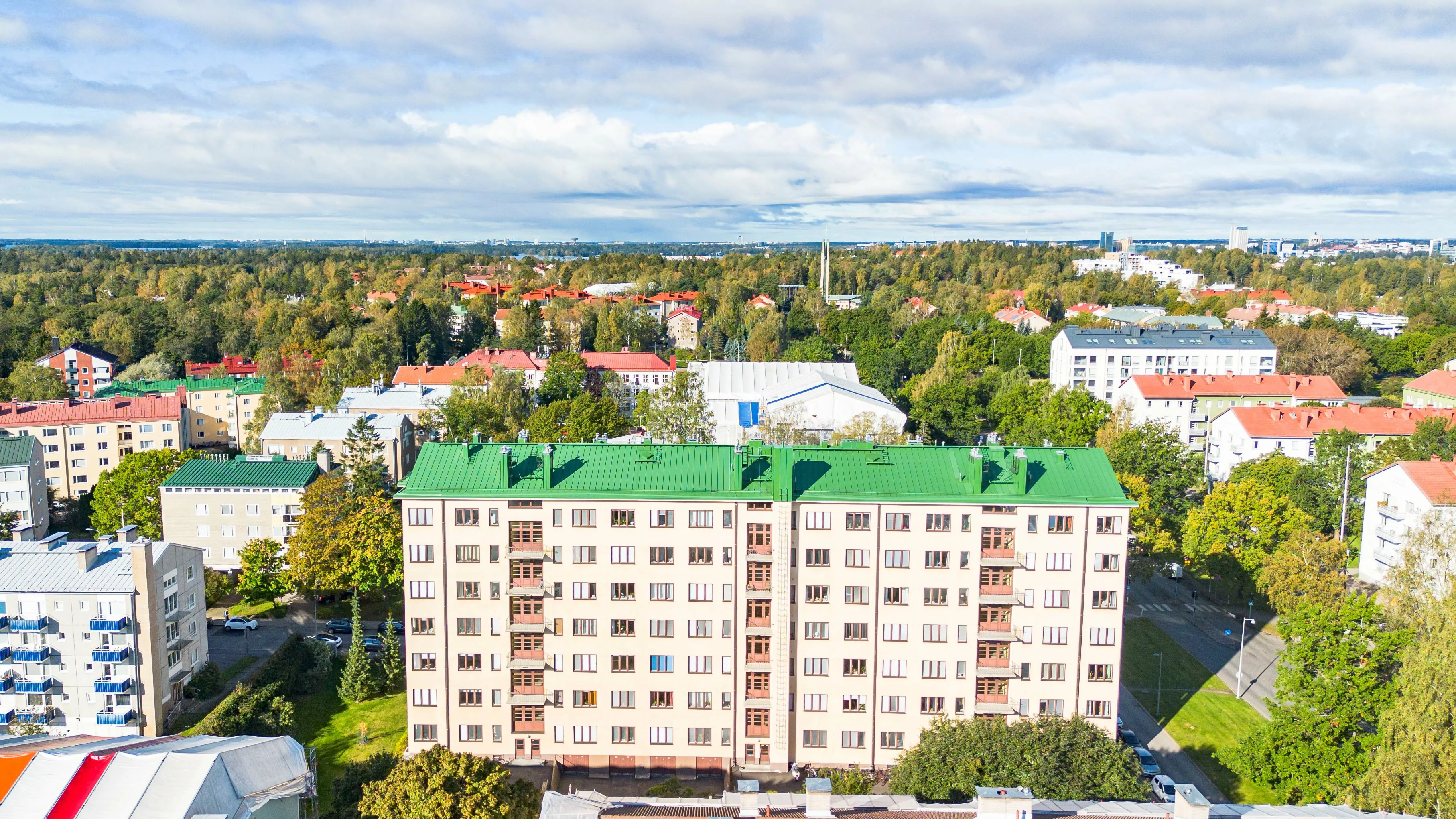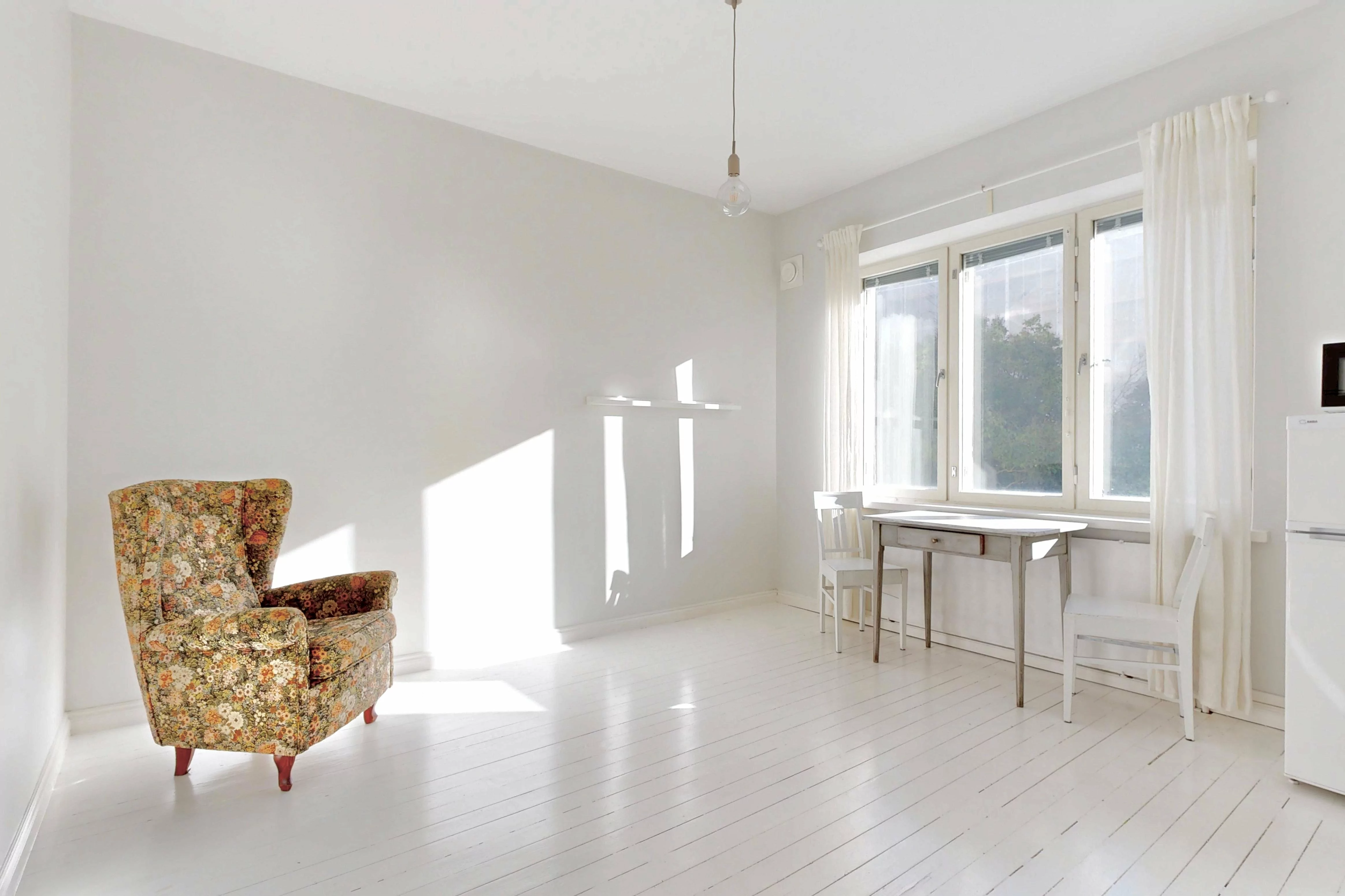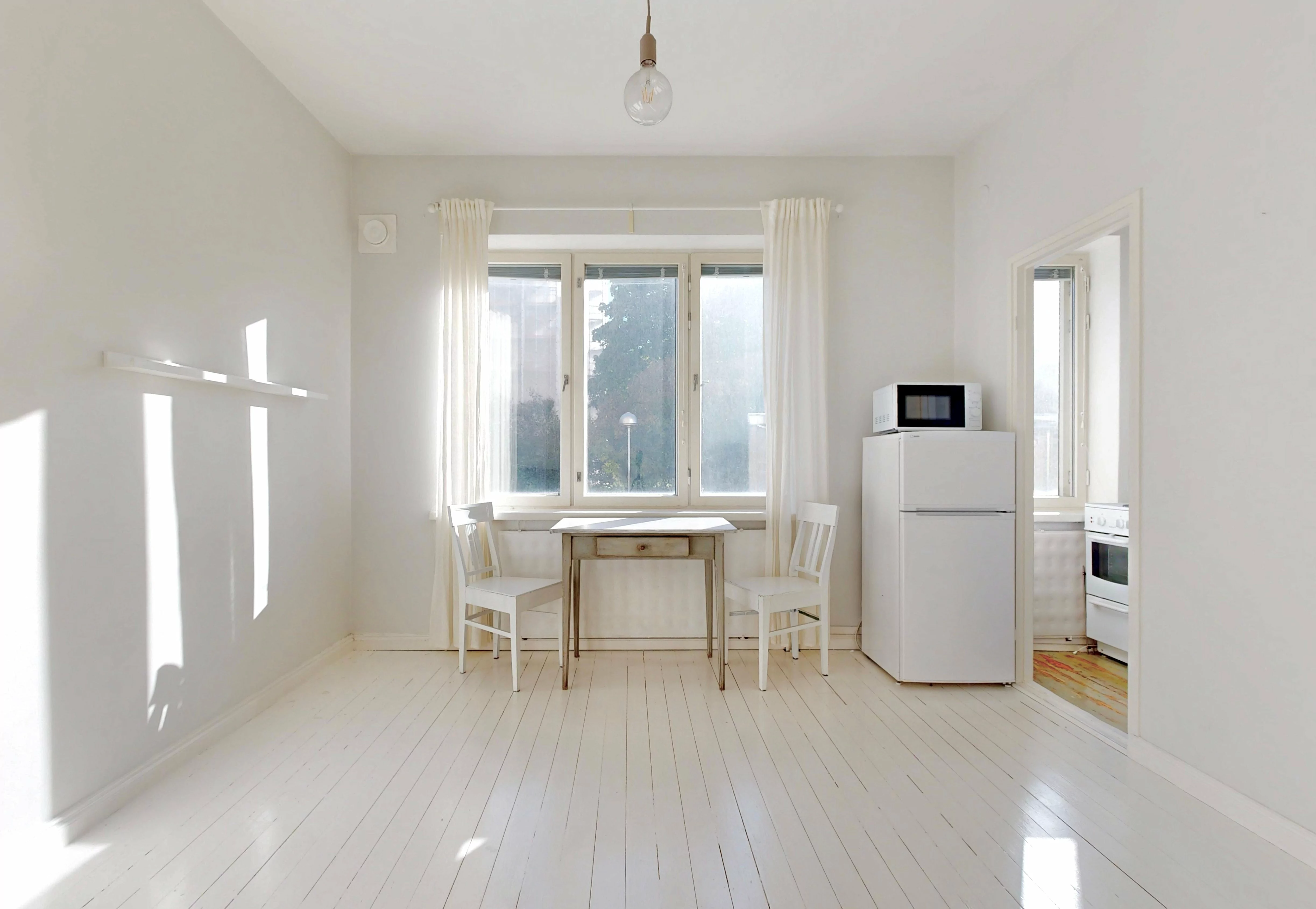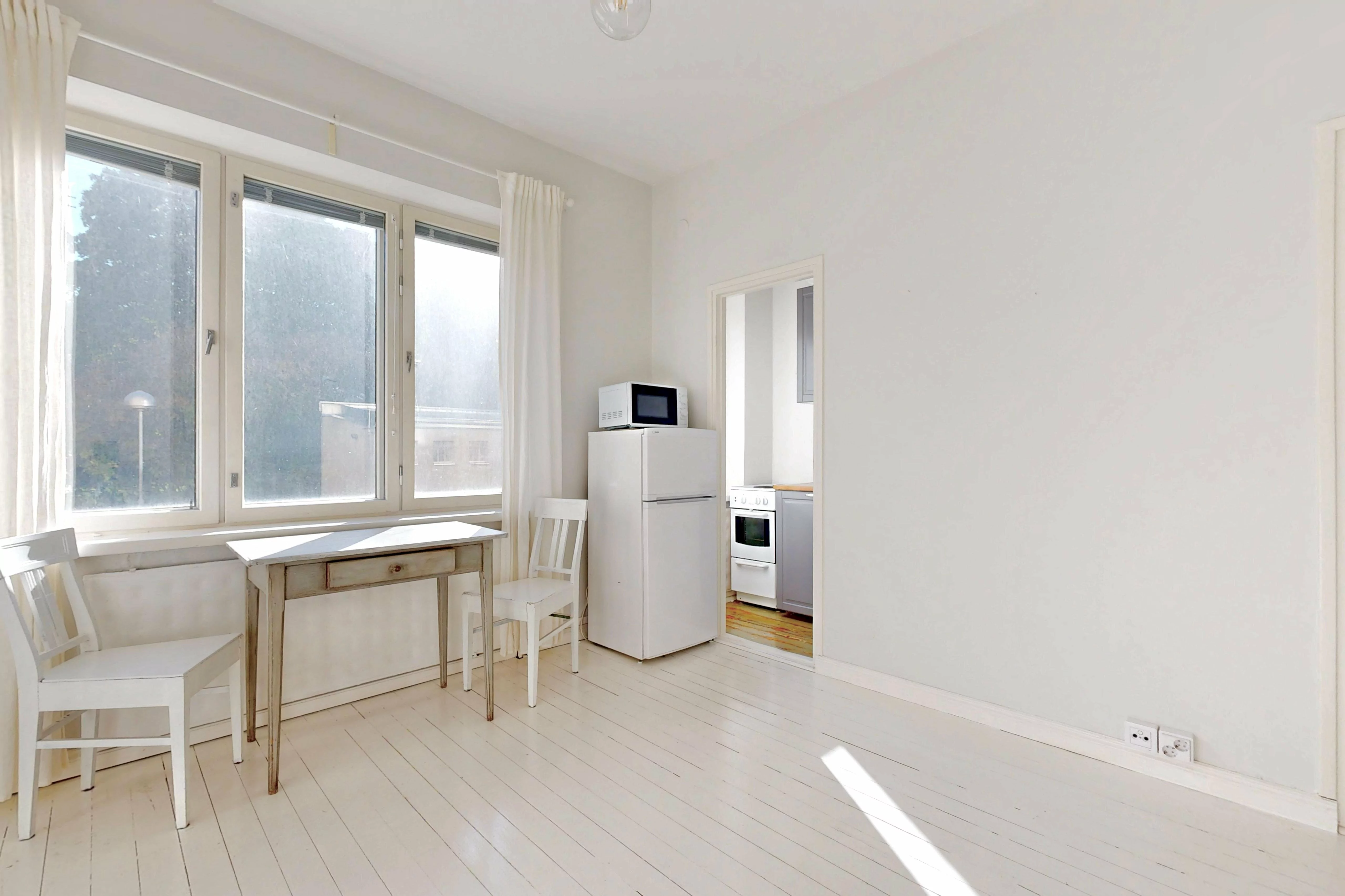 Ensimmäisen kerroksen kompakti yksiö ja näkymät yhtiön sisäpihalle. Keittiö on kätevästi keittokomerona, jolloin varsinaiseen huoneeseen jää tilaa niin sängylle, ruokapöydälle kuin säilytykselle. Asunnon lautalattia lisää kodikkuutta ja tunnelmaa. Kylpyhuone on remontoitu putkiremontissa. Taloyhtiössä löytyy pesutupa.