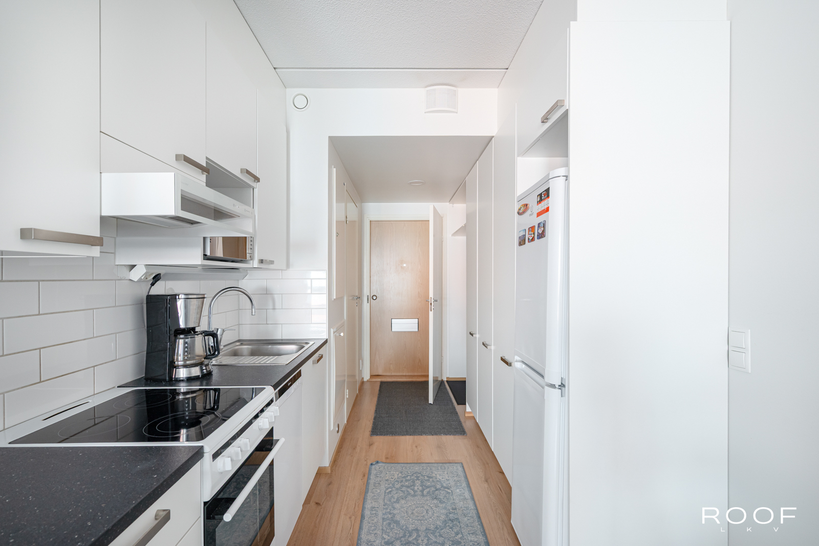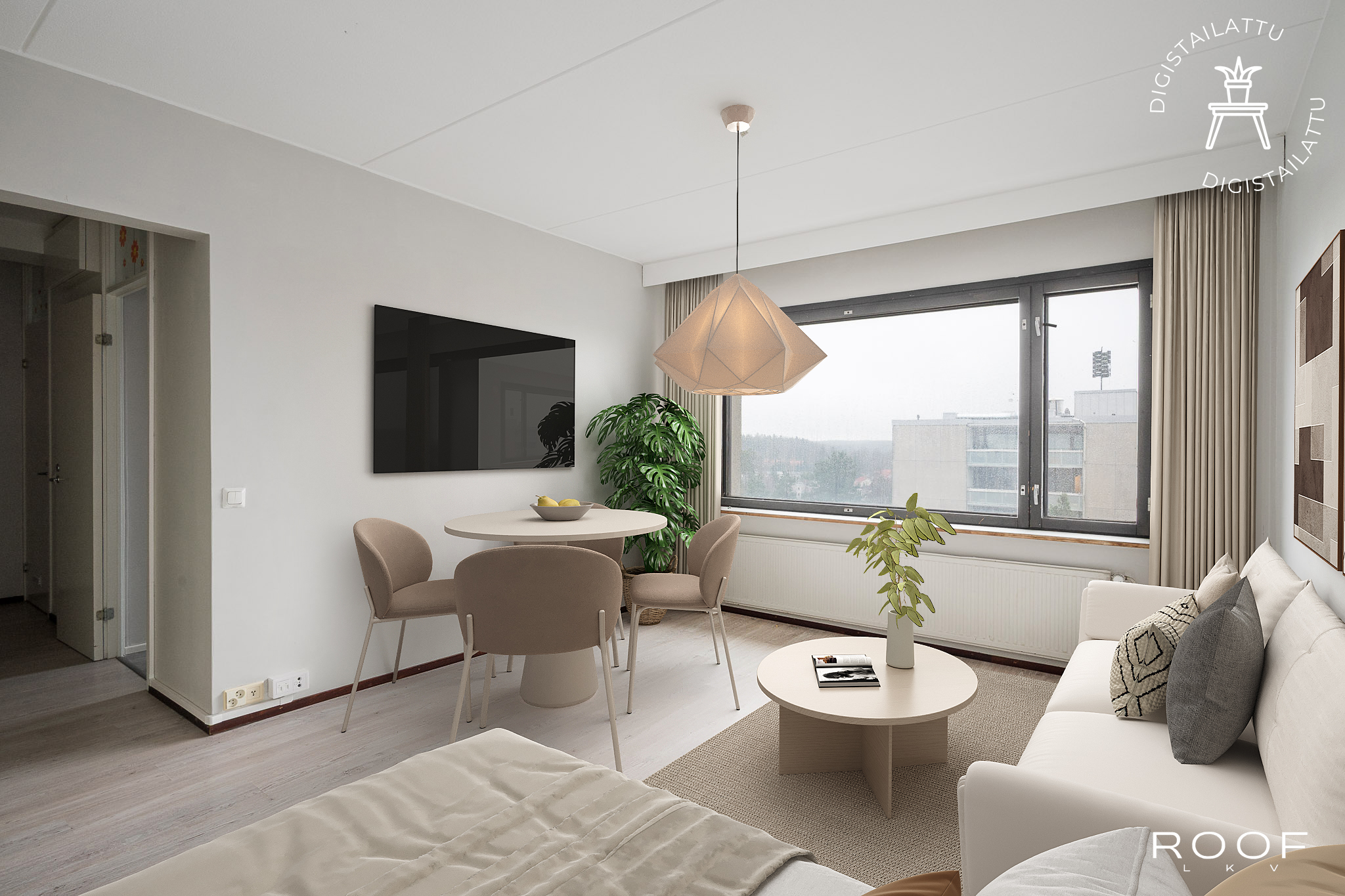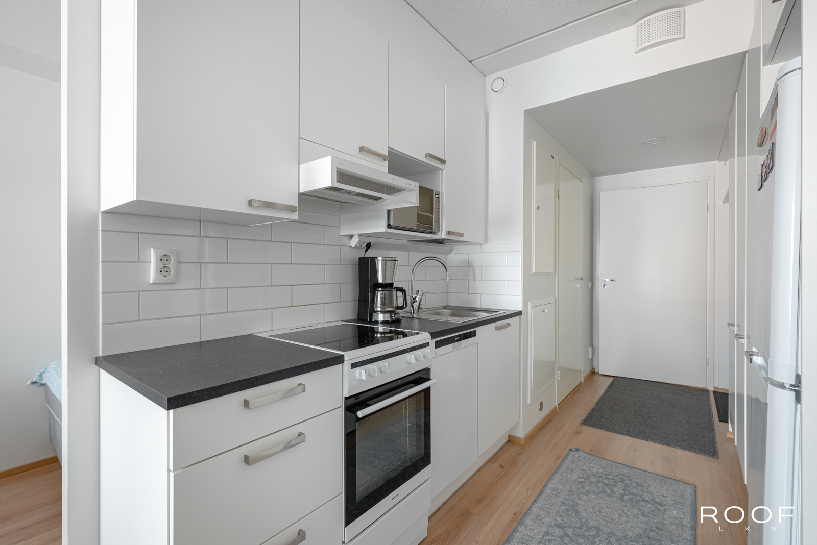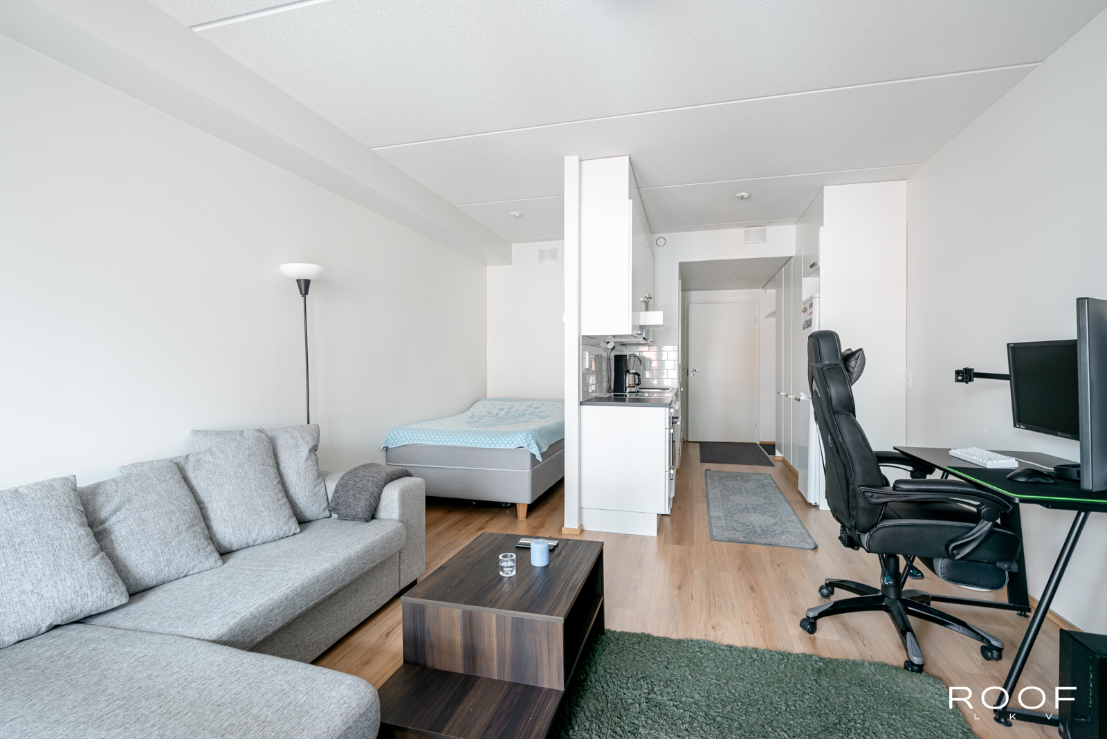 Espoon Keskuksessa vuonna 2018 valmistunut moderni kerrostaloyksiö. Tämä neljännen kerroksen asunto tarjoaa toimivan pohjaratkaisun. Suuret ikkunat ja lasitettu parveke tuovat runsaasti luonnonvaloa.