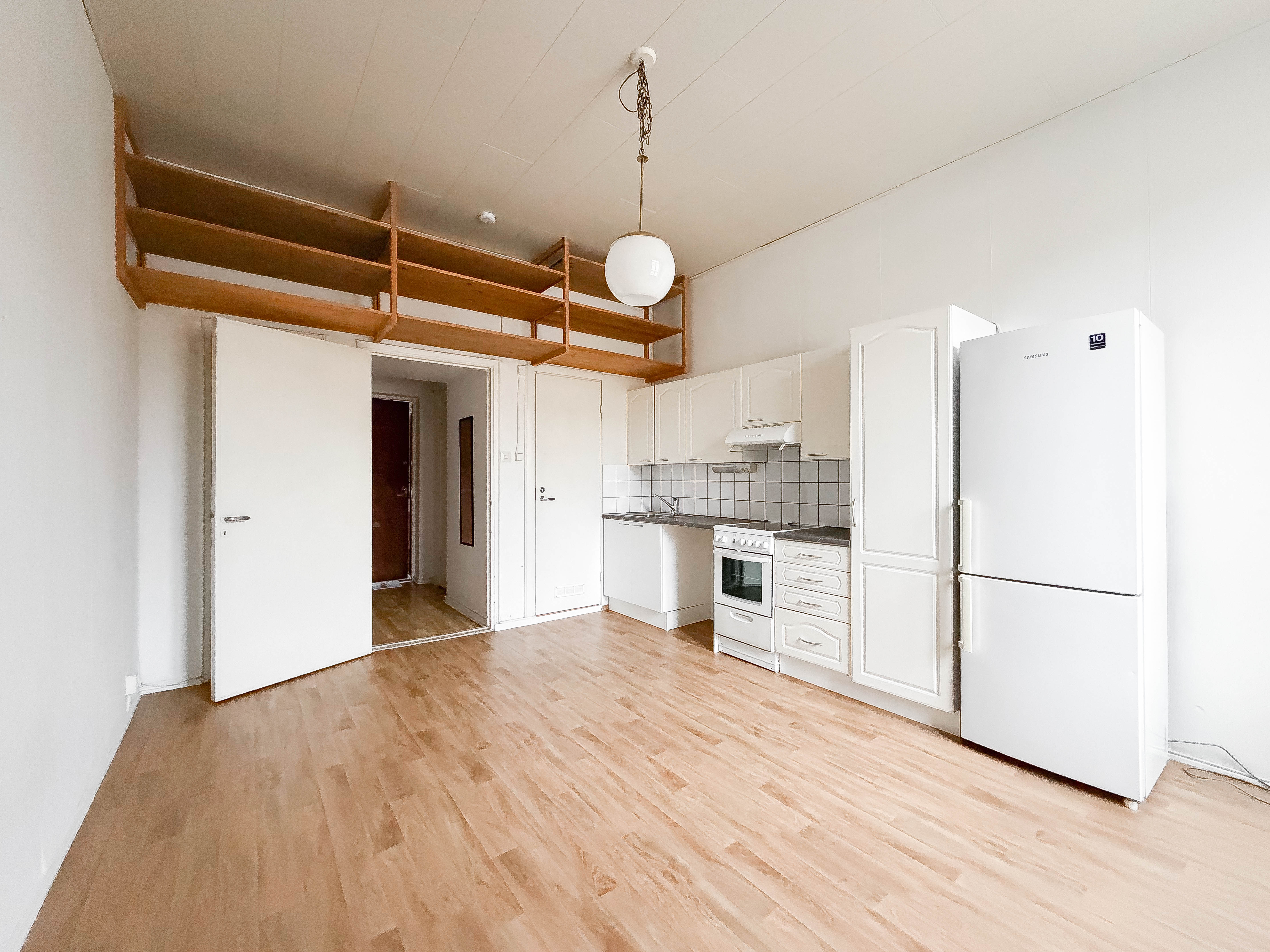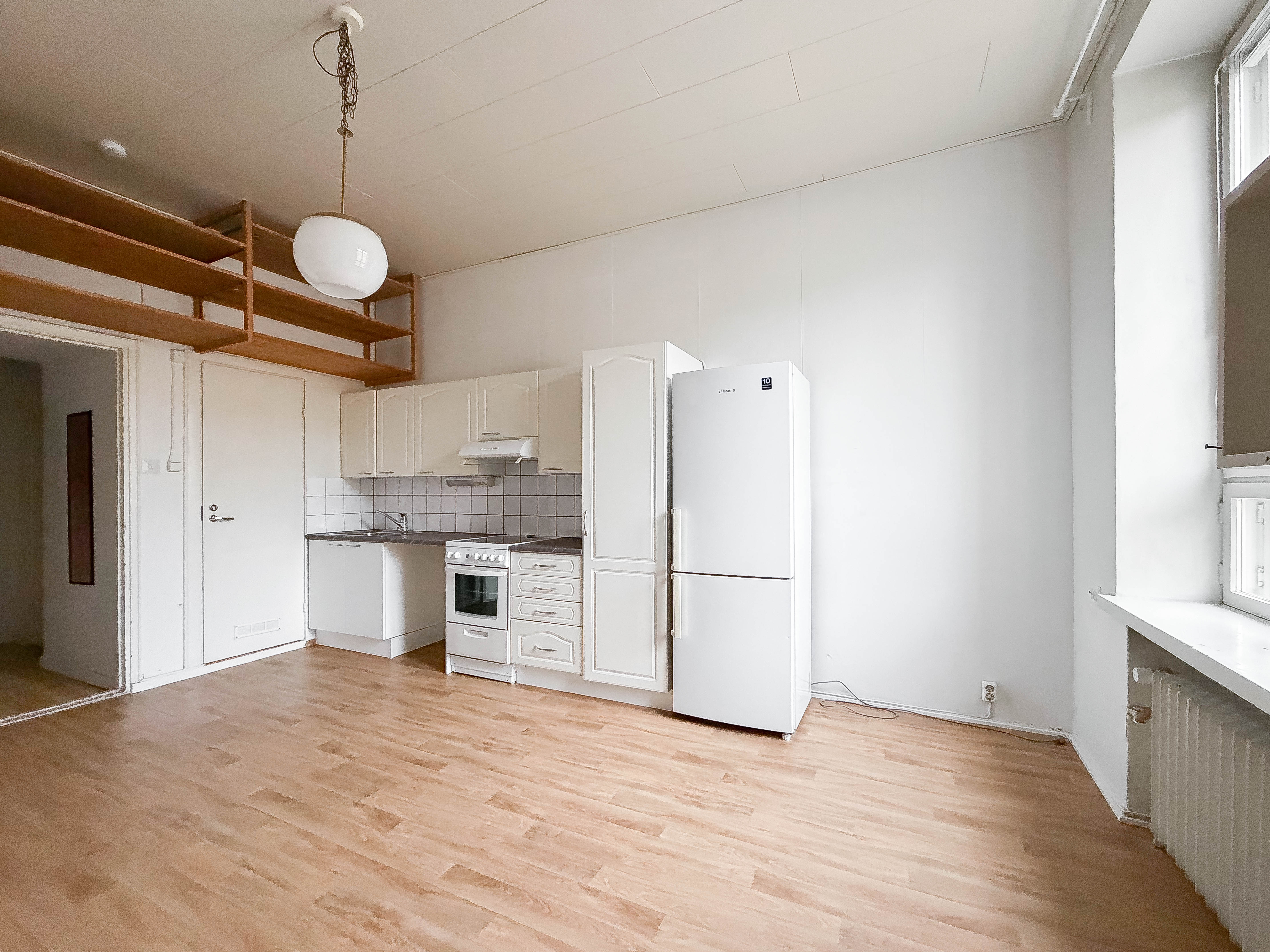 Tämä koti on toimiva kokonaisuus ja tarjoaa loistavan sijainnin kaupunkiasumiseen. Avarassa huoneessa on hyvin tilaa niin sängylle kuin vaikka opiskelu/työpisteelle. Avokeittiössä on mukavasti kaappitilaa. Suuri ikkuna luo vanhan kivitalon tunnelmaa. Asunnossa erillinen kylpyhuone ja wc ja kylpyhuoneesta löytyy pyykinpesukoneliitäntä sekä pesukone. Neutraali värimaailma antaa oivan pohjan sisustukselle!