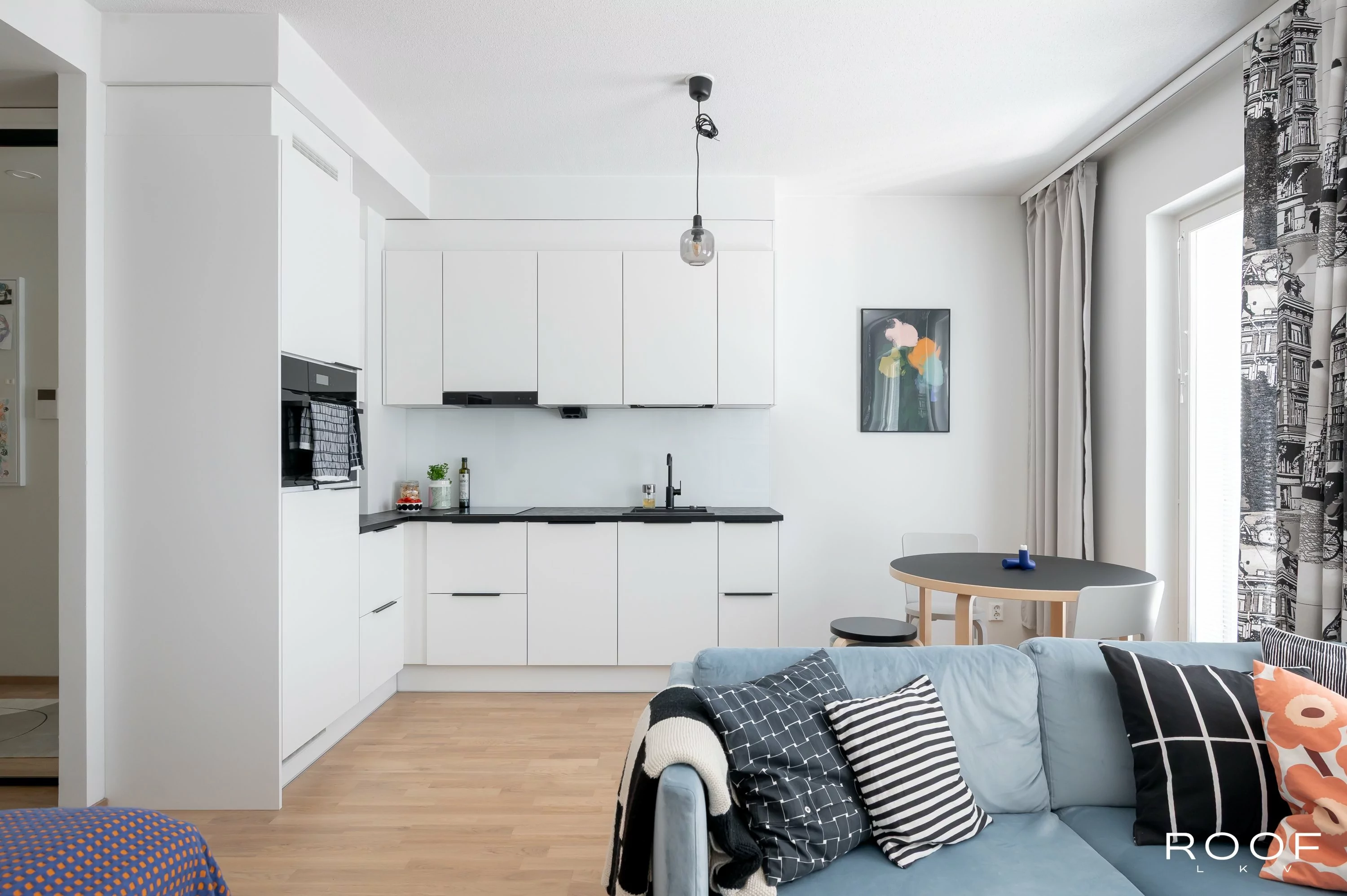 Keittiö hurmaa modernilla ilmeellään ja mustilla yksityiskohdillaan, kuten tyylikkäällä pöytätasolla, altaalla ja hanalla. Integroidut kodinkoneet sulautuvat siististi kokonaisuuteen ja tekevät arjesta sujuvaa.