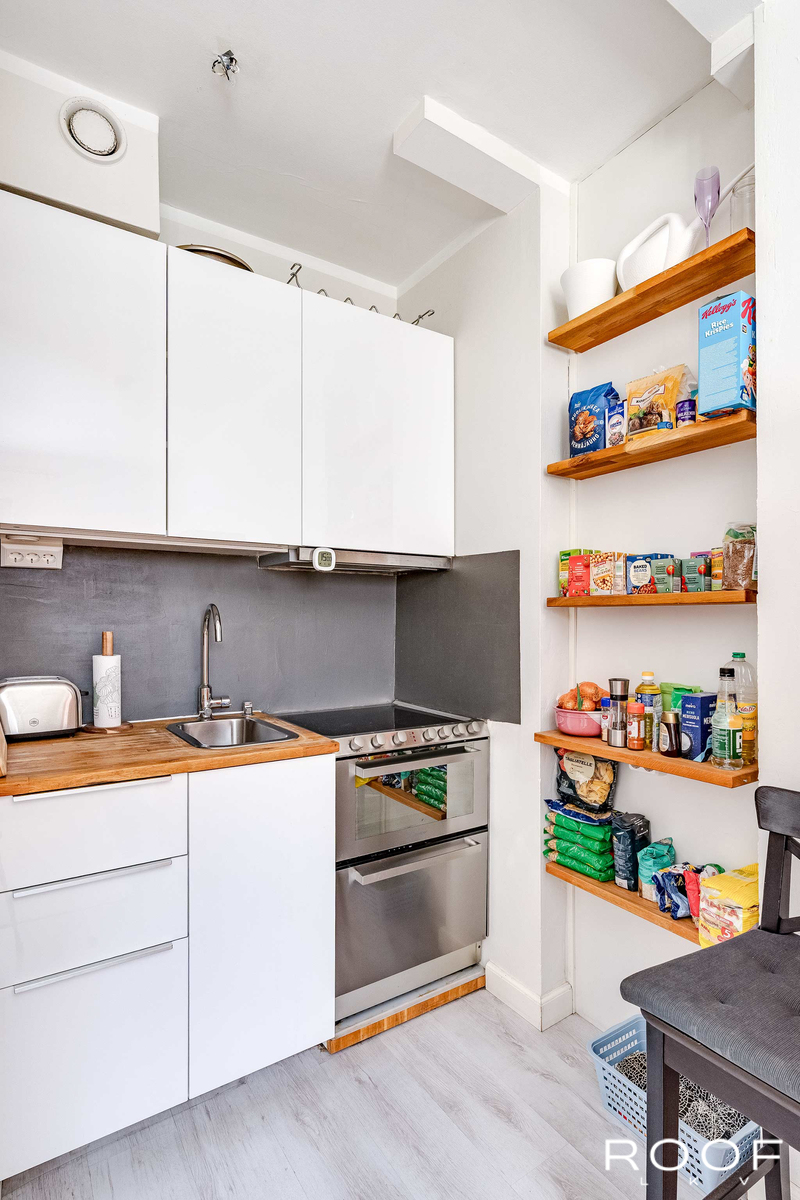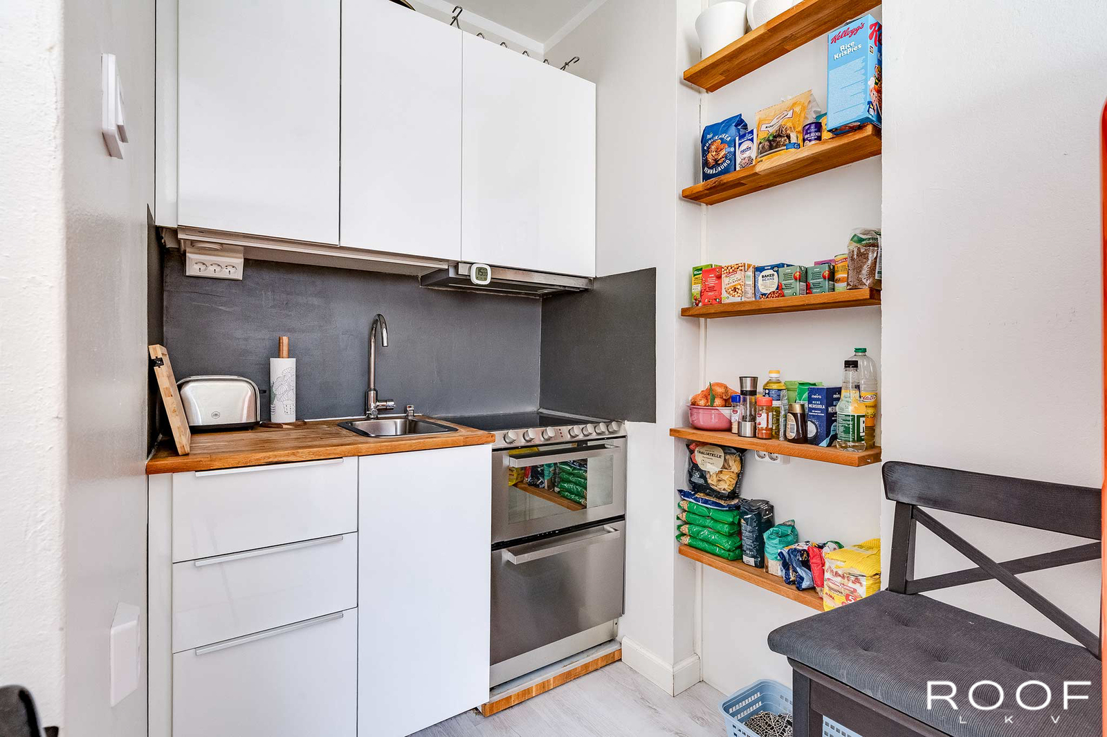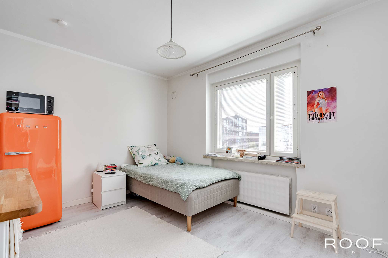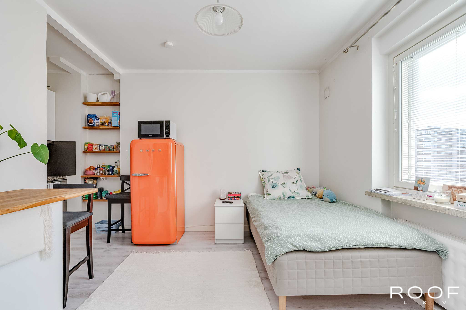 Sen ylimmästä, neljännestä kerroksesta löytyy näppärä yksiö, Siitä löytyy kaikki tarvittava kaupunkiasumiseen. Näyttävä SMEGin jääkaappi kerää kivasti huomiota ja lieden alaosasto löytyy yllättäen astianpesukone. Myös pyykinpesukone löytyy kaappiin piilotettuna.