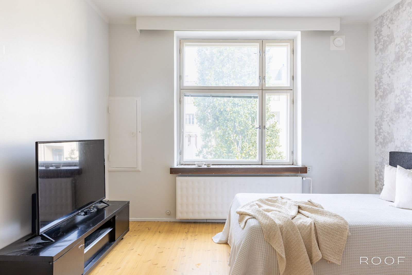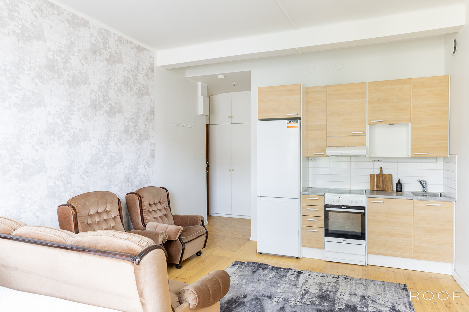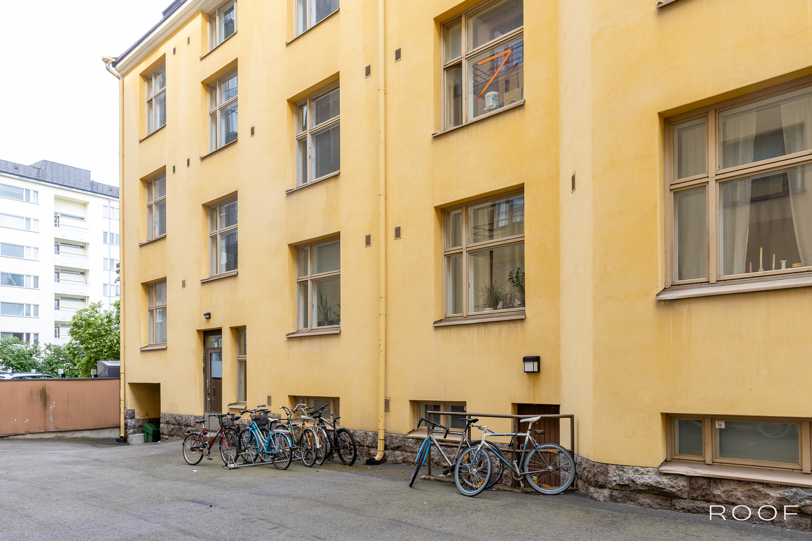Asunto avautuu sisäpihan suuntaan, mikä tekee tunnelmasta rauhallisen kaupungin vilinästä huolimatta. Yksiön perinteiset materiaalit ja selkeä pohjaratkaisu luovat viihtyisän arjen perustan.