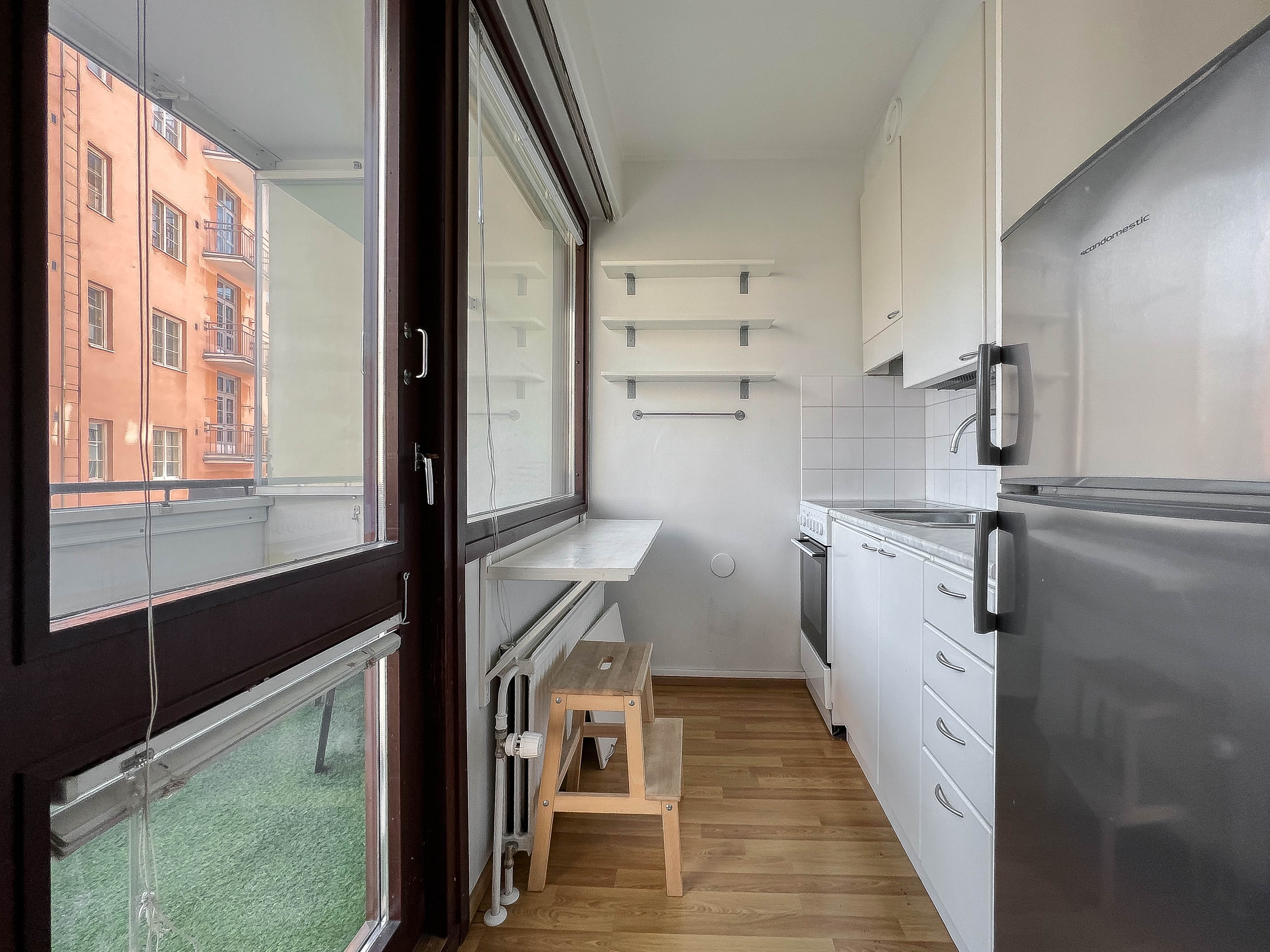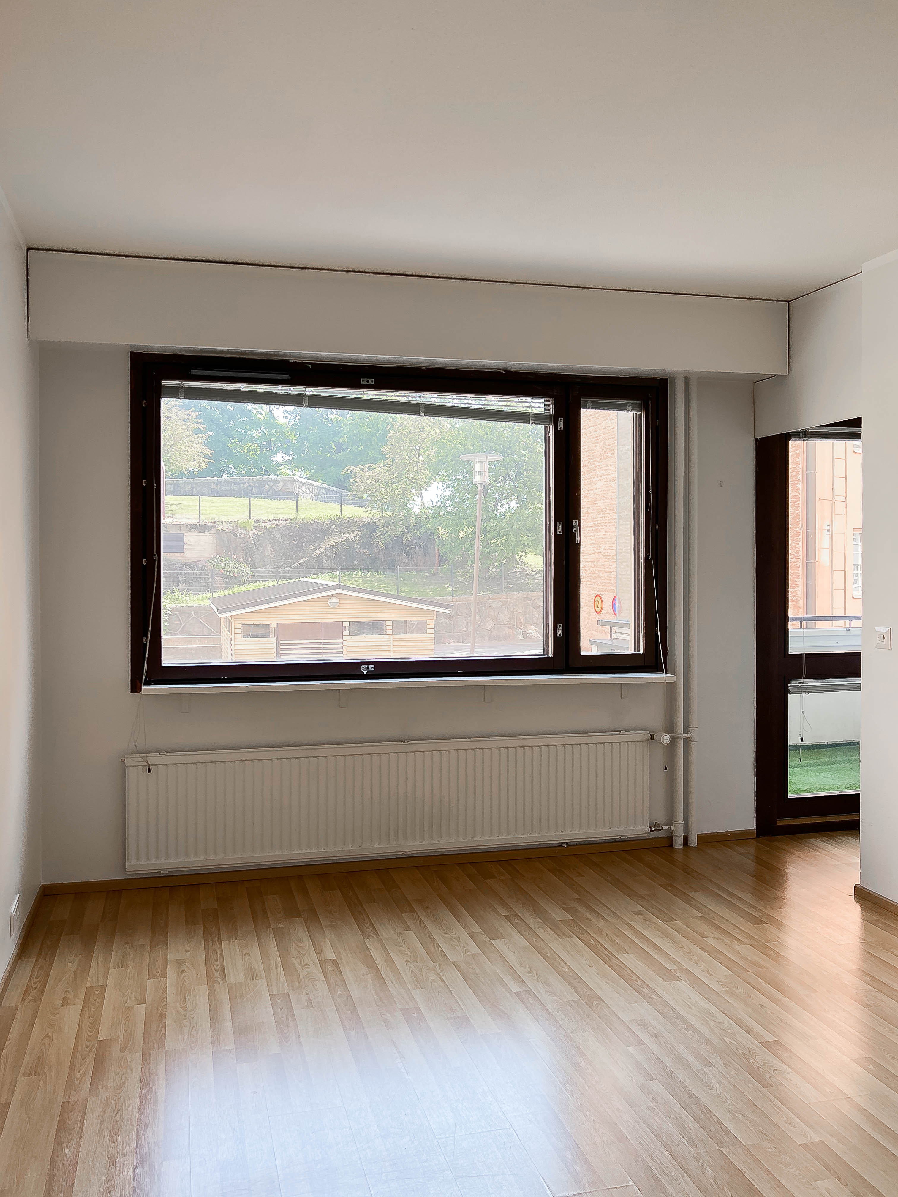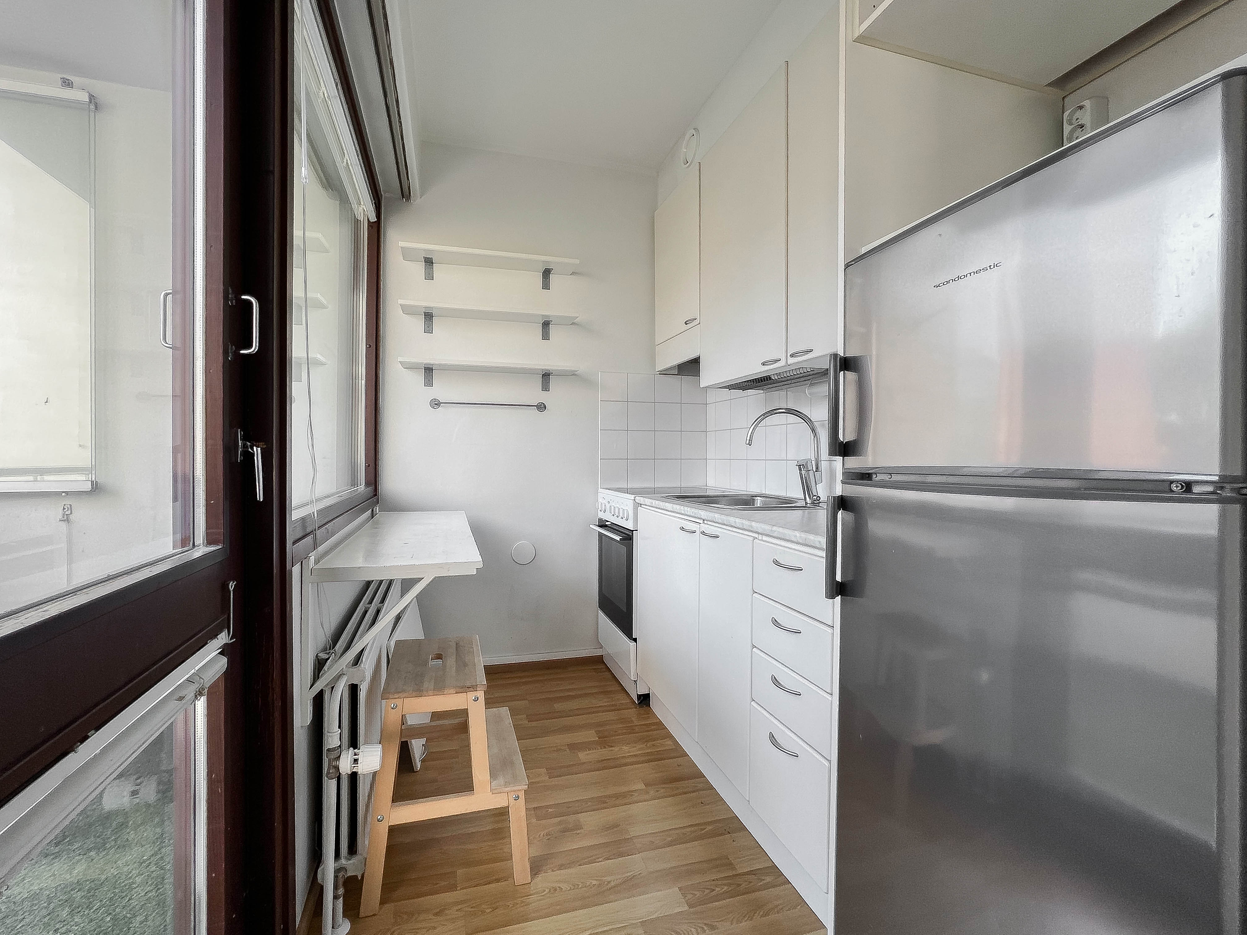 Tämä koti pitää sisällään toimivan ja avaran pohjaratkaisun. Tilavassa huoneessa on hyvin tilaa niin sängylle kuin oleskeluun. Ikkunallinen keittokomero on hyvänkokoinen ja siellä on mukavasti kaapistoja. Eteisestä on kulku laatoitettuun kylpyhuoneeseen, joka on varustettu pyykinpesukoneliitännällä. Kokonaisuuden kruunaa lasitettu parveke, joten säästä pystyt nauttimaan kotoa käsin. Tästä asunnosta loihdit helposti mieleisen kotisi!