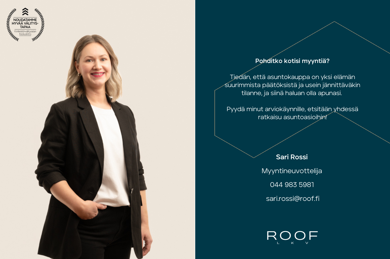 Harkitsetko asuntosi myyntiä? Varaa minulta maksuton arviokäynti, kerron samalla markkinatilanteesta, palveluistani ja tehokkaasta Roof-välityskonseptista. Suunnitellaan yhdessä seuraavat askeleet!