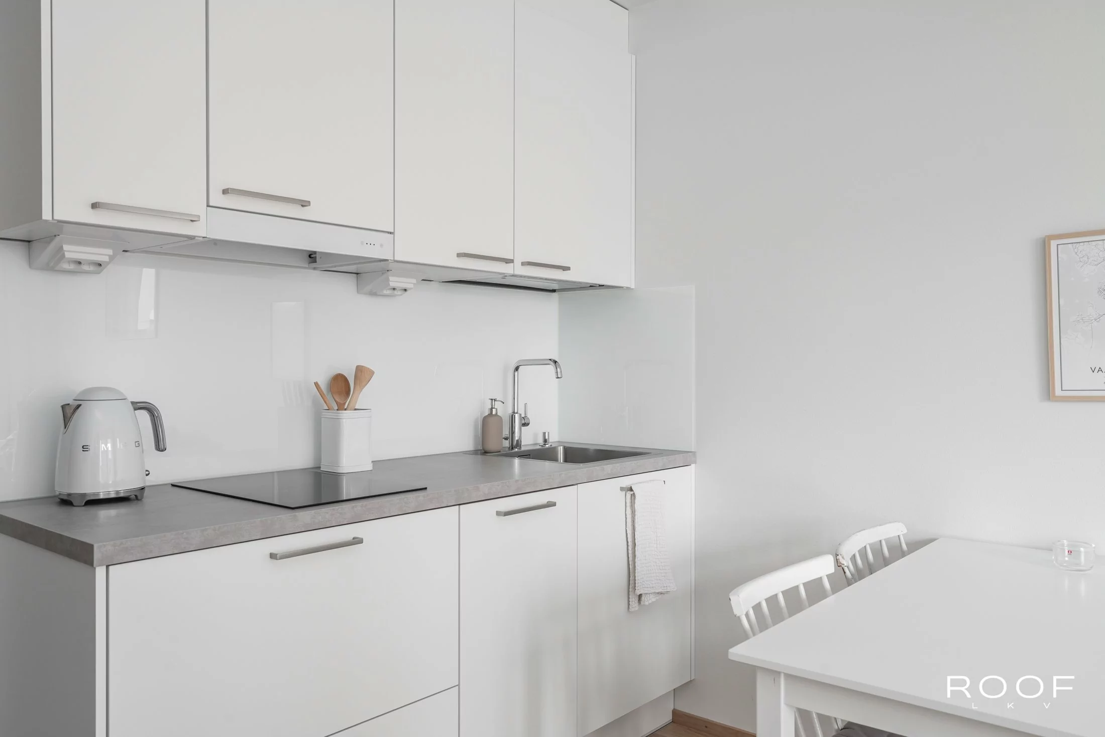 Huoneistossa on riittävästi tilaa niin sängylle, sohvalle kuin ruokapöydällekin. Keittiö sijoittuu kahdelle seinälle, joten säilytystilaa on myös riittävästi. Korkea huonekorkeus ja iso ikkuna takaavat valoisuuden ja avaruuden tunnun.