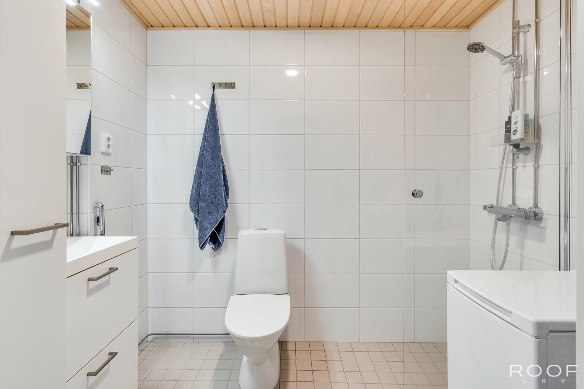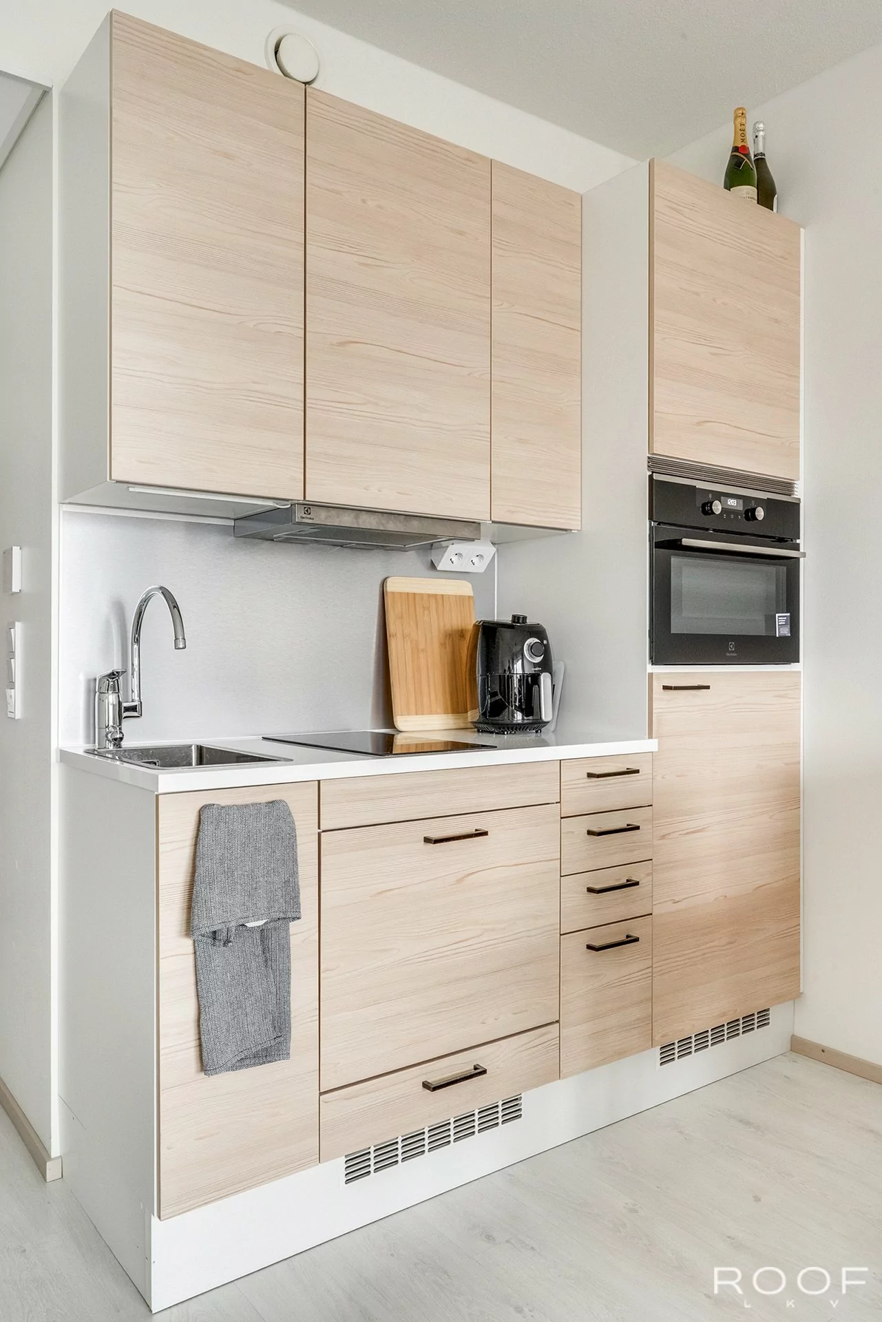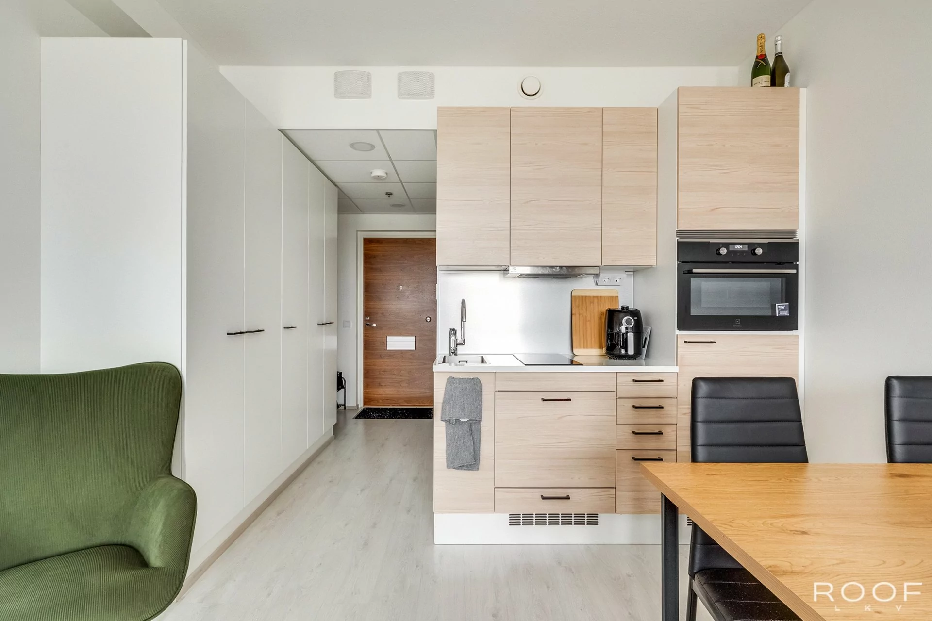 Keittiön varustus: jääkaappi/pakastin (pakastinlokero), induktioliesi, liesituuletin, integroitu uuni mikroaaltouuni, astianpesukone.