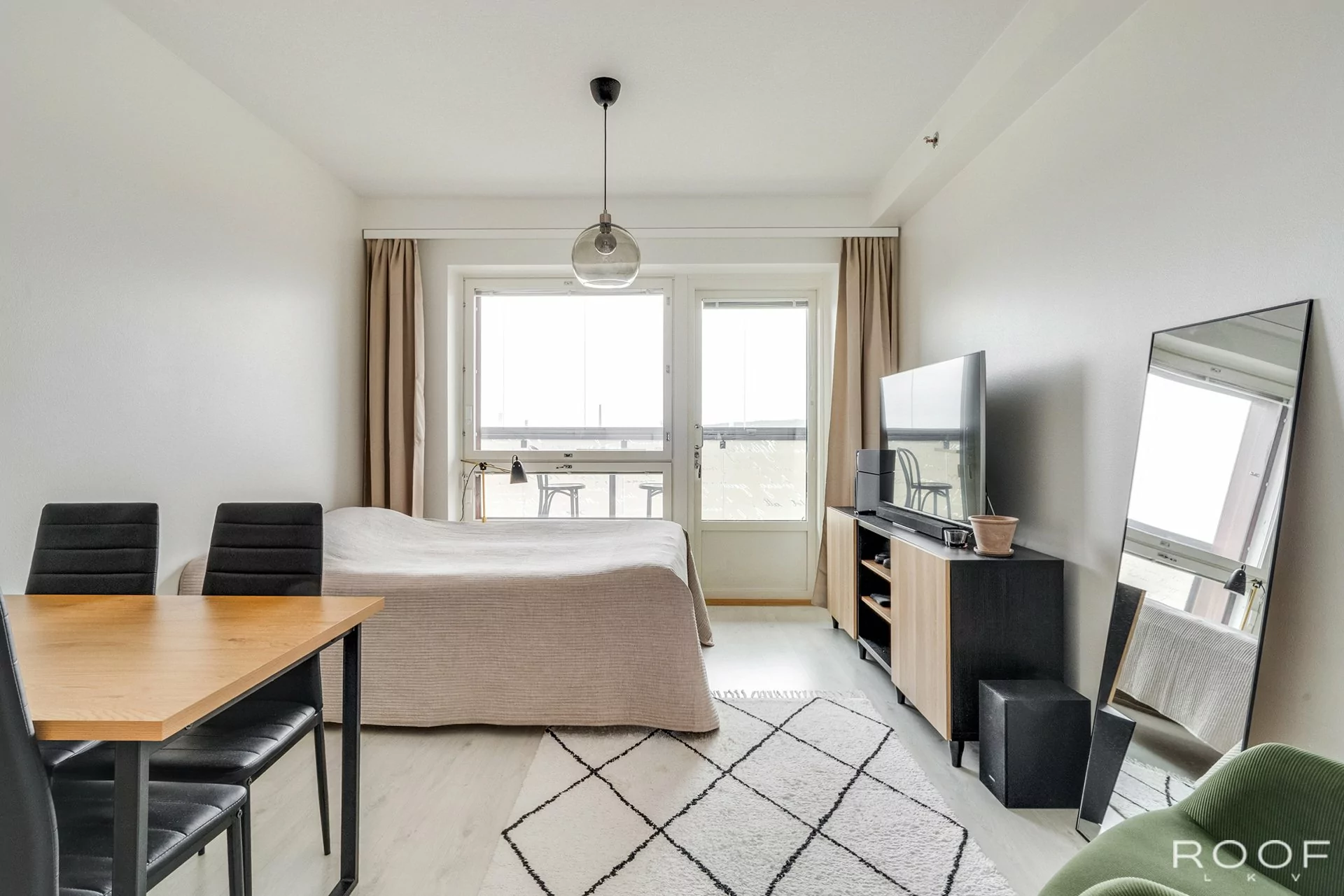 Asunnon pohjaratkaisu täyttää tämän päivän asumisen toiveet, mm. keittiön yhdistyessä olohuoneeseen, jonne mahtuu hyvin sohva tai 4 hengen ruokailuryhmä sekä parivuode.