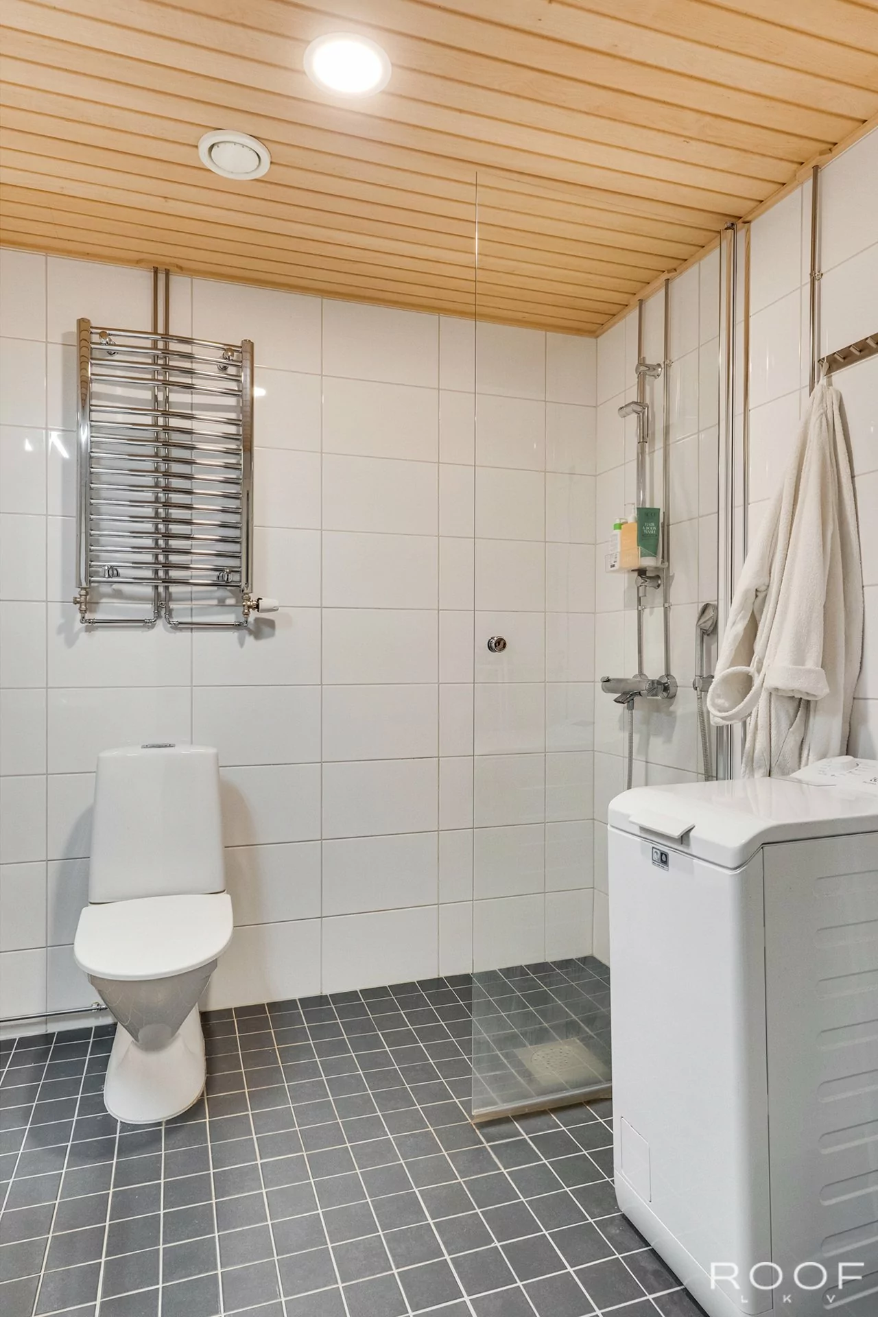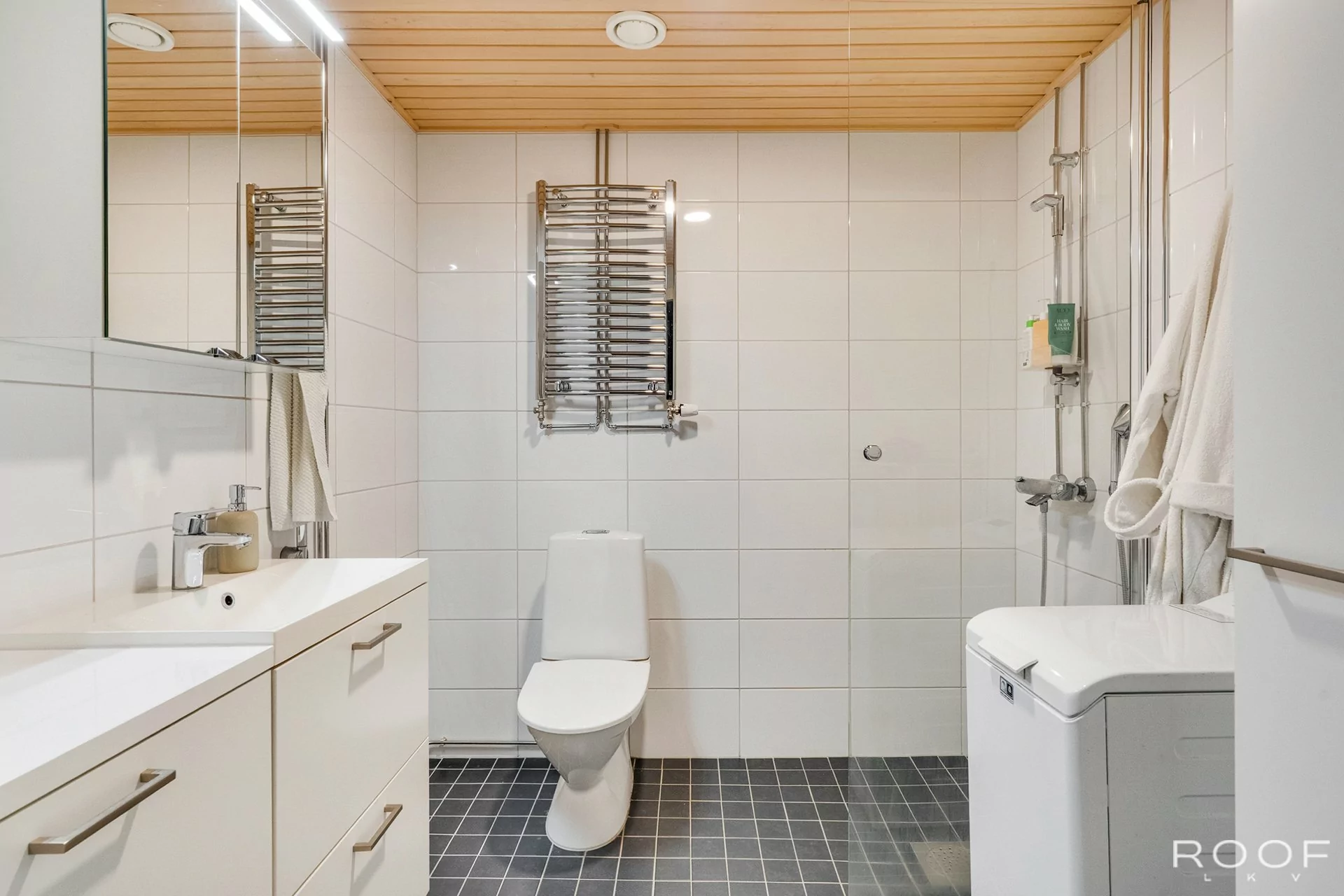 Keittiön varustus: jääkaappi/pakastin (pakastinlokero), induktioliesi, liesituuletin, integroitu uuni mikroaaltouuni, astianpesukone.