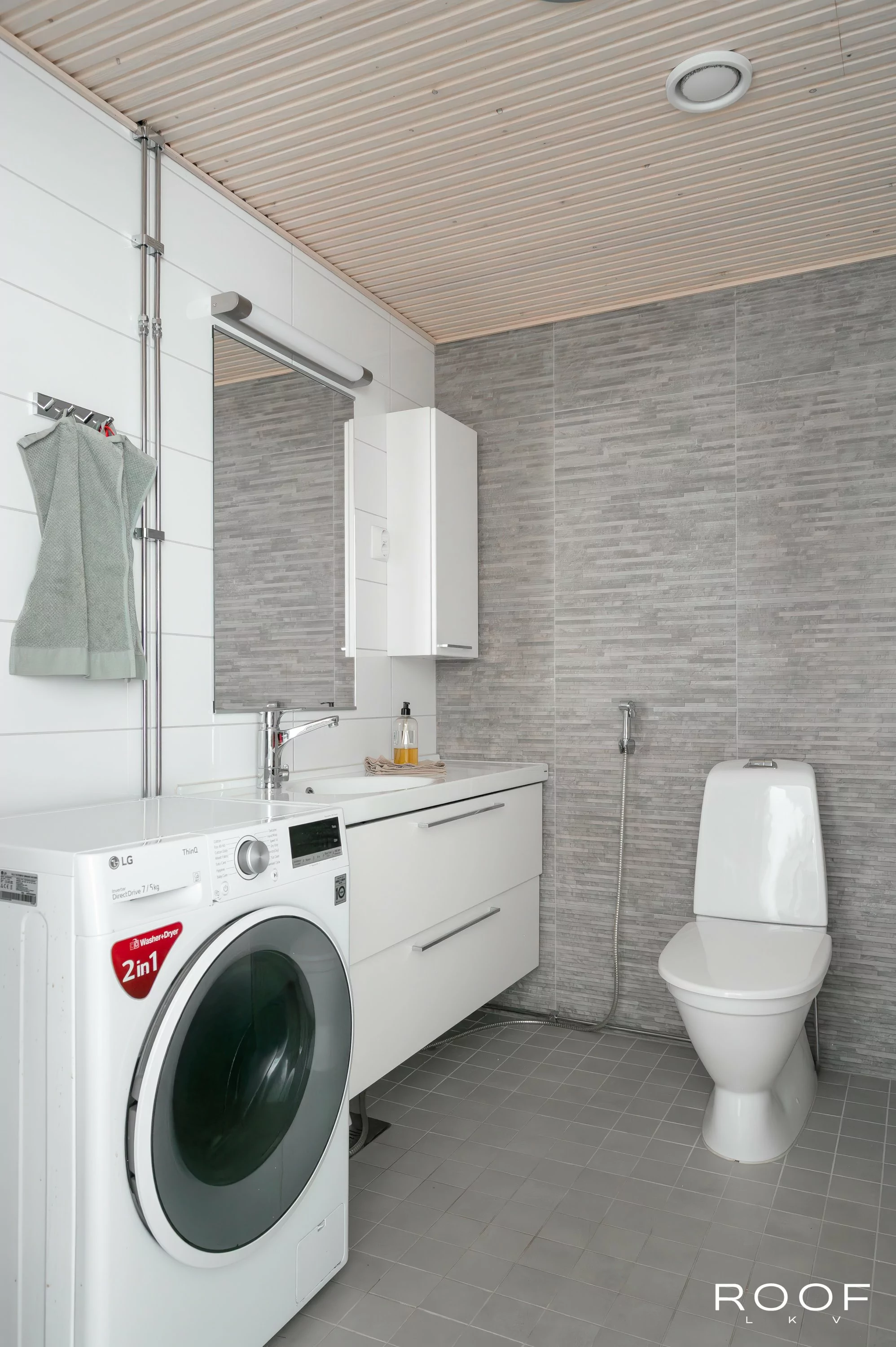 Arkea helpottavat oma sauna sekä erillinen wc, joka on yhdistetty käytännölliseen kodinhoitotilaan – toimiva ratkaisu pyykkihuo...