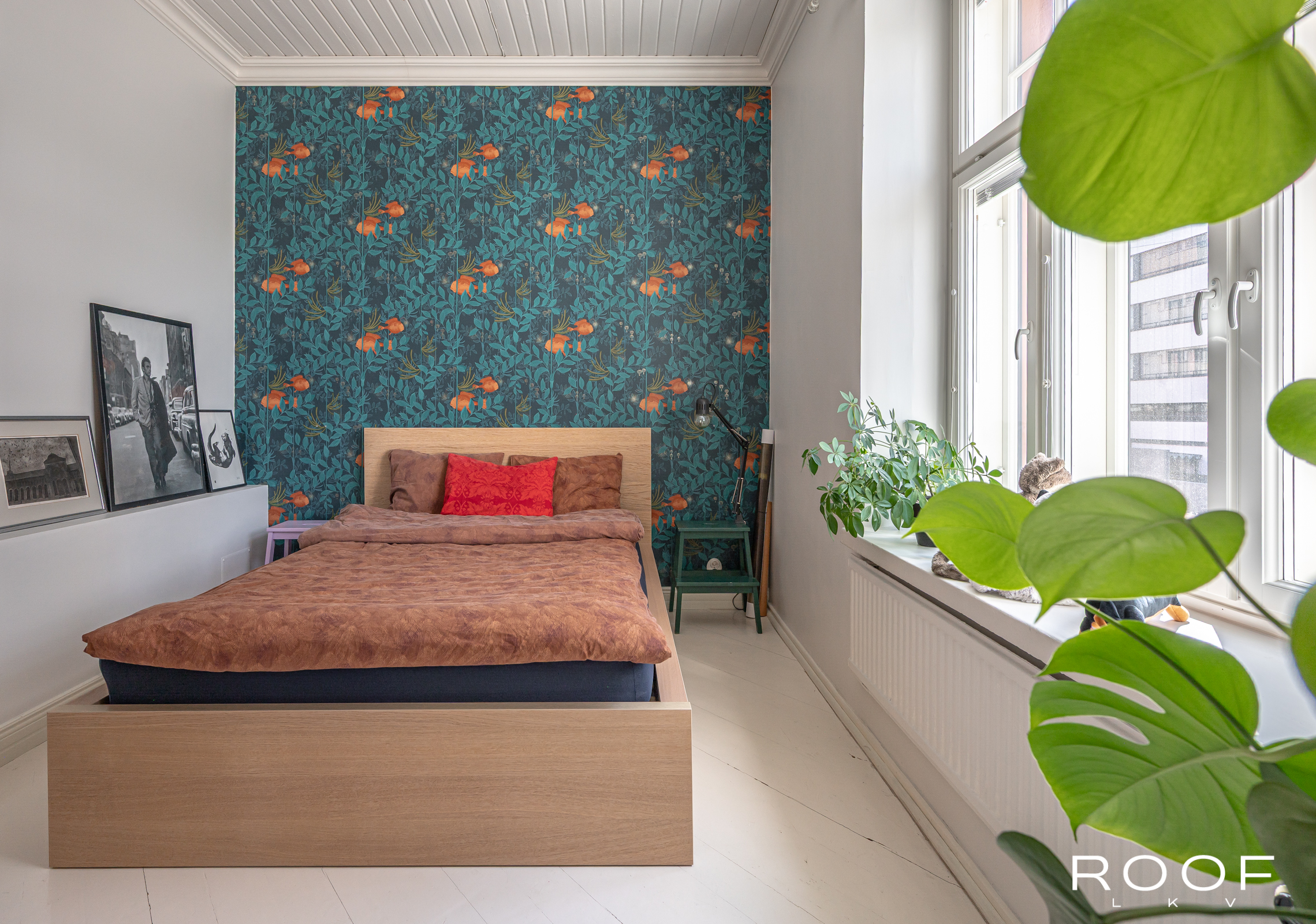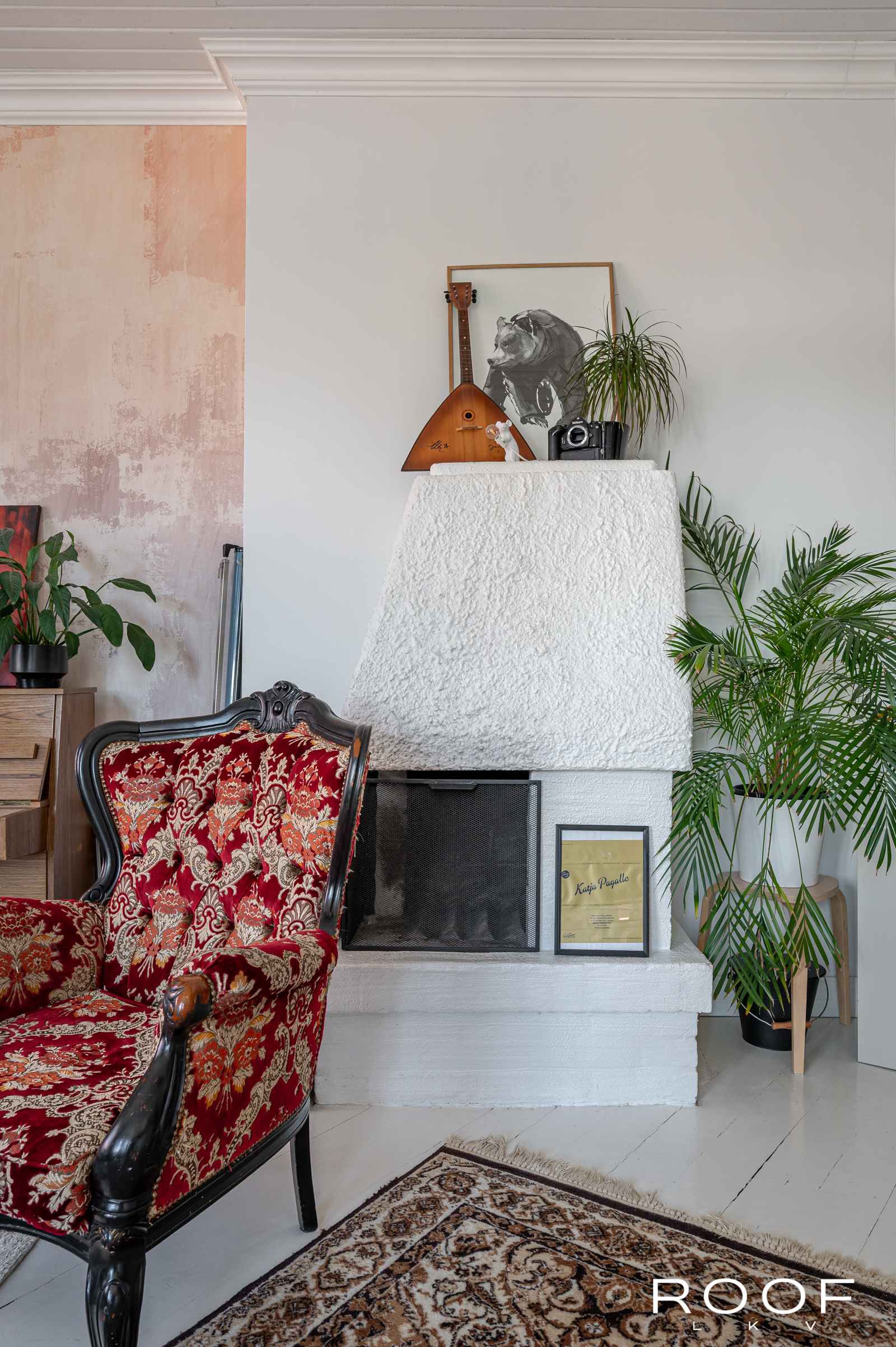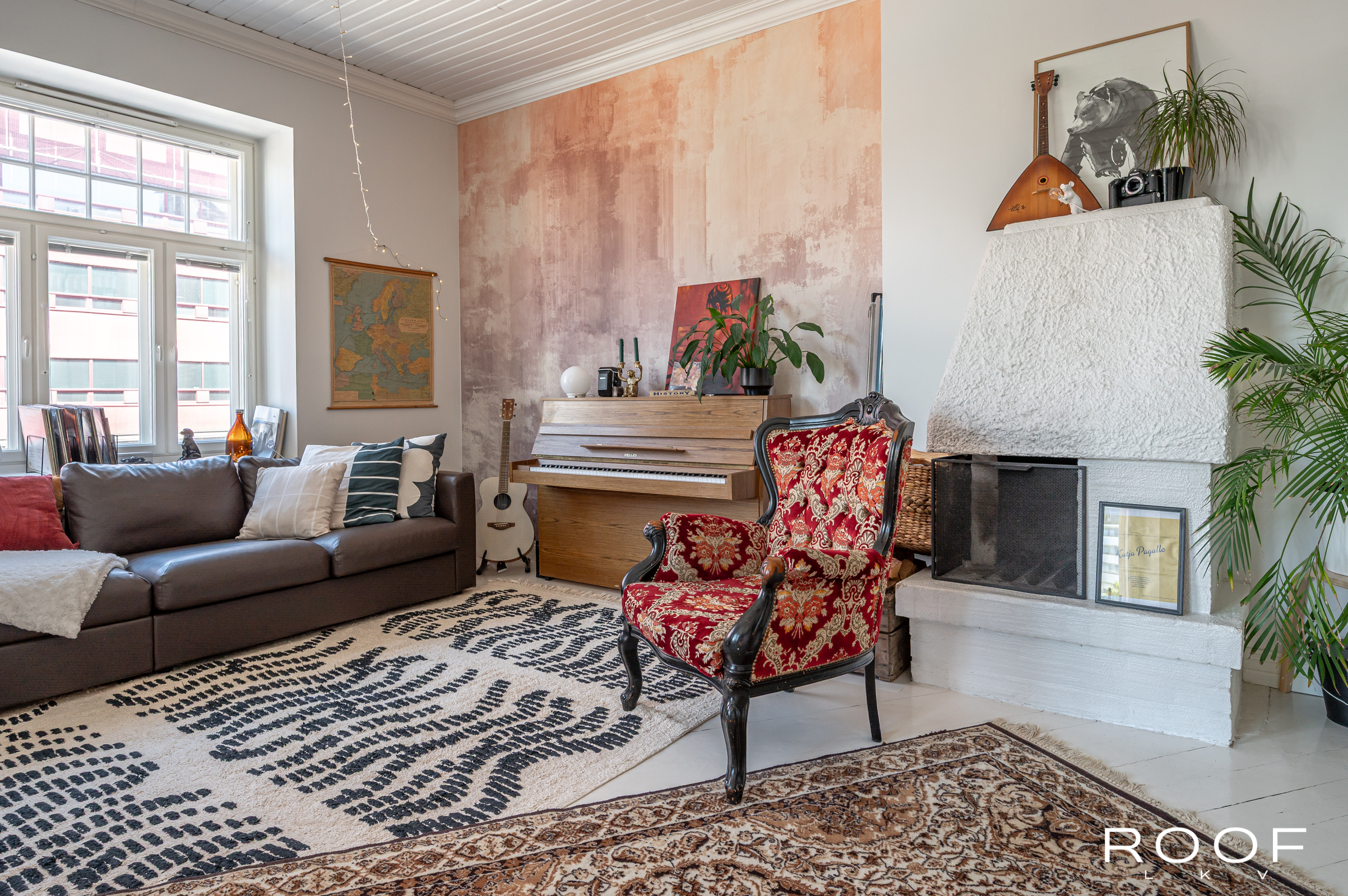 Toisen kerroksen päätyasunto tarjoaa elämistä ilmeikkäällä ja toimivalla pohjaratkaisulla. Värikkäät seinäpinnat, aikakauden tyyliset keittiökalusteet sekä alkuperäinen paneelikatto tekevät kodista persoonallisen ja harkitun kokonaisuuden – kuin pieni taideteos, joka odottaa uutta omistajaa jatkamaan sen tarinaa.