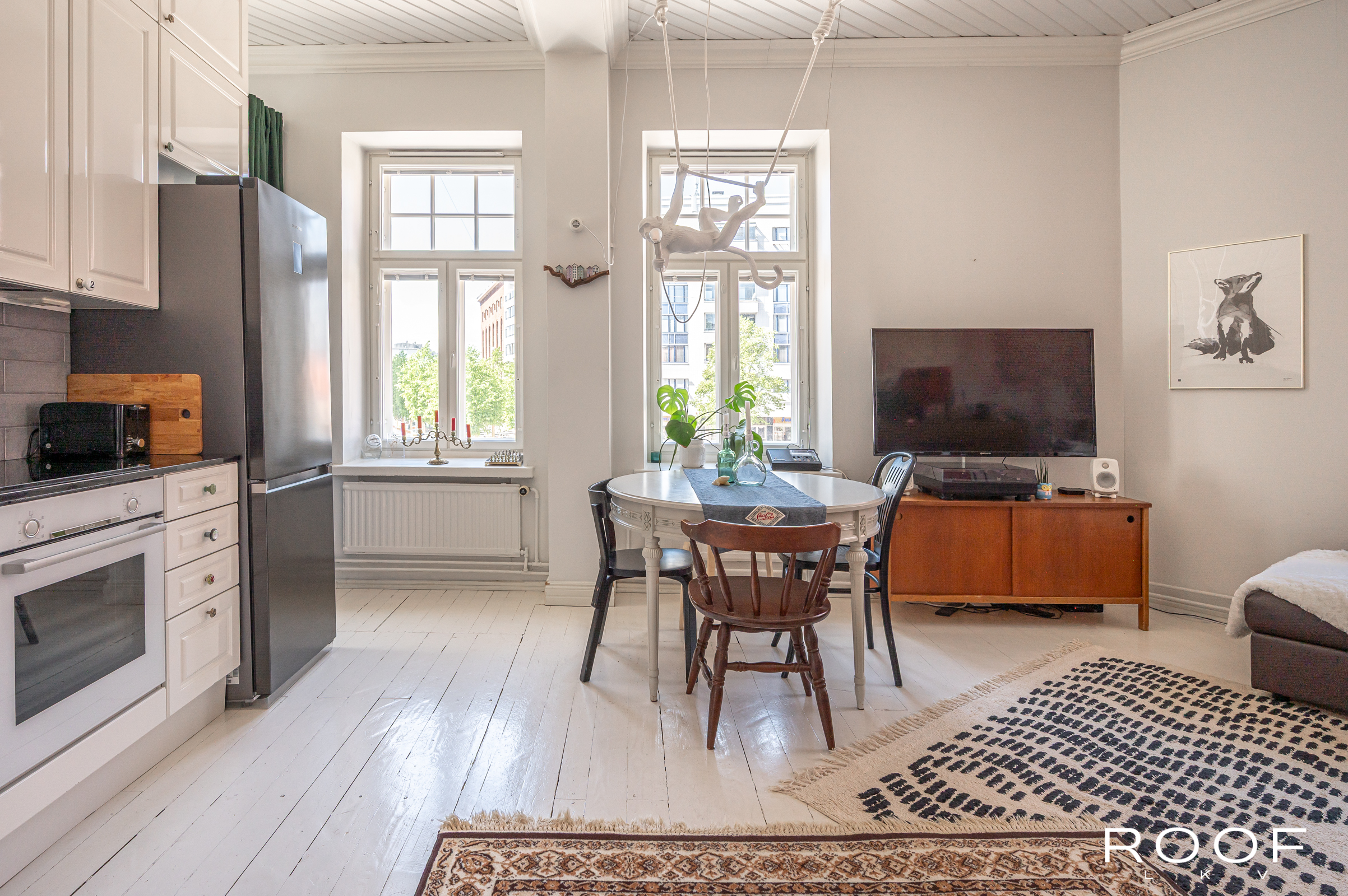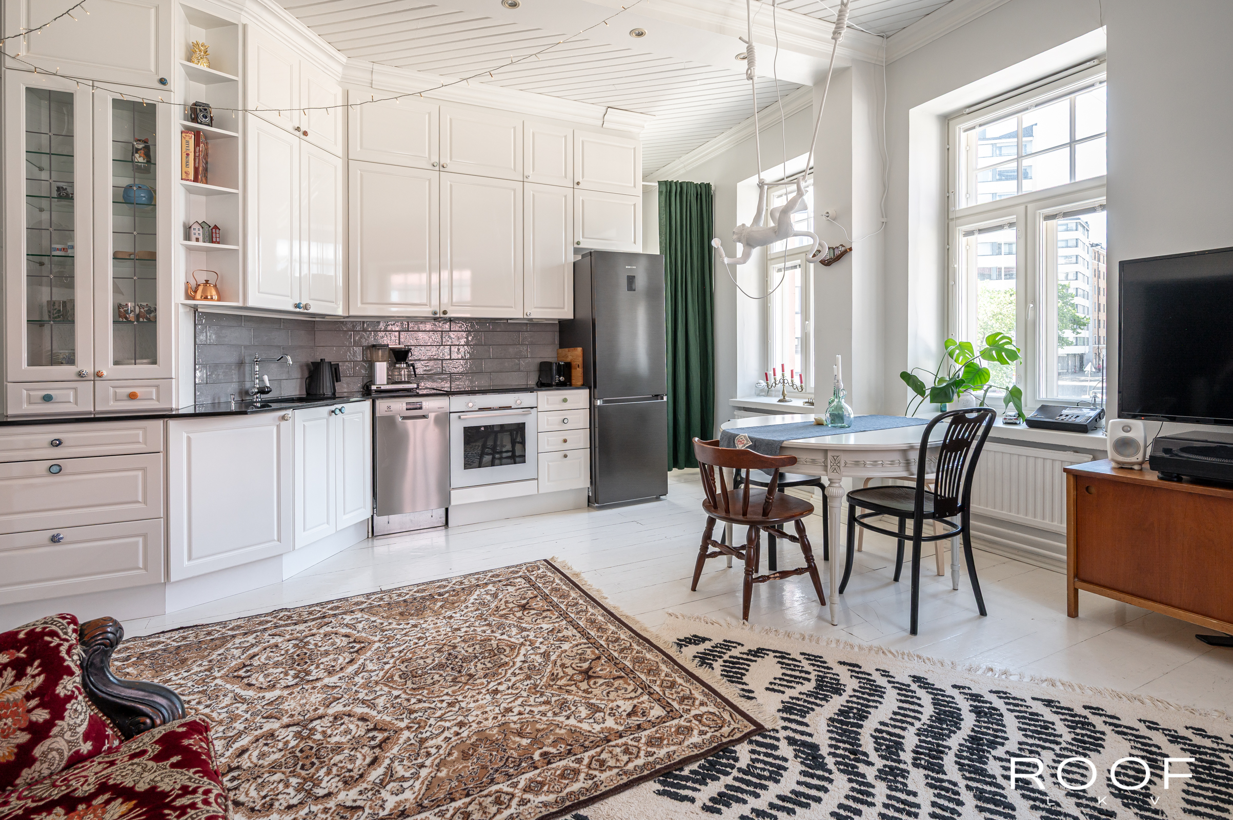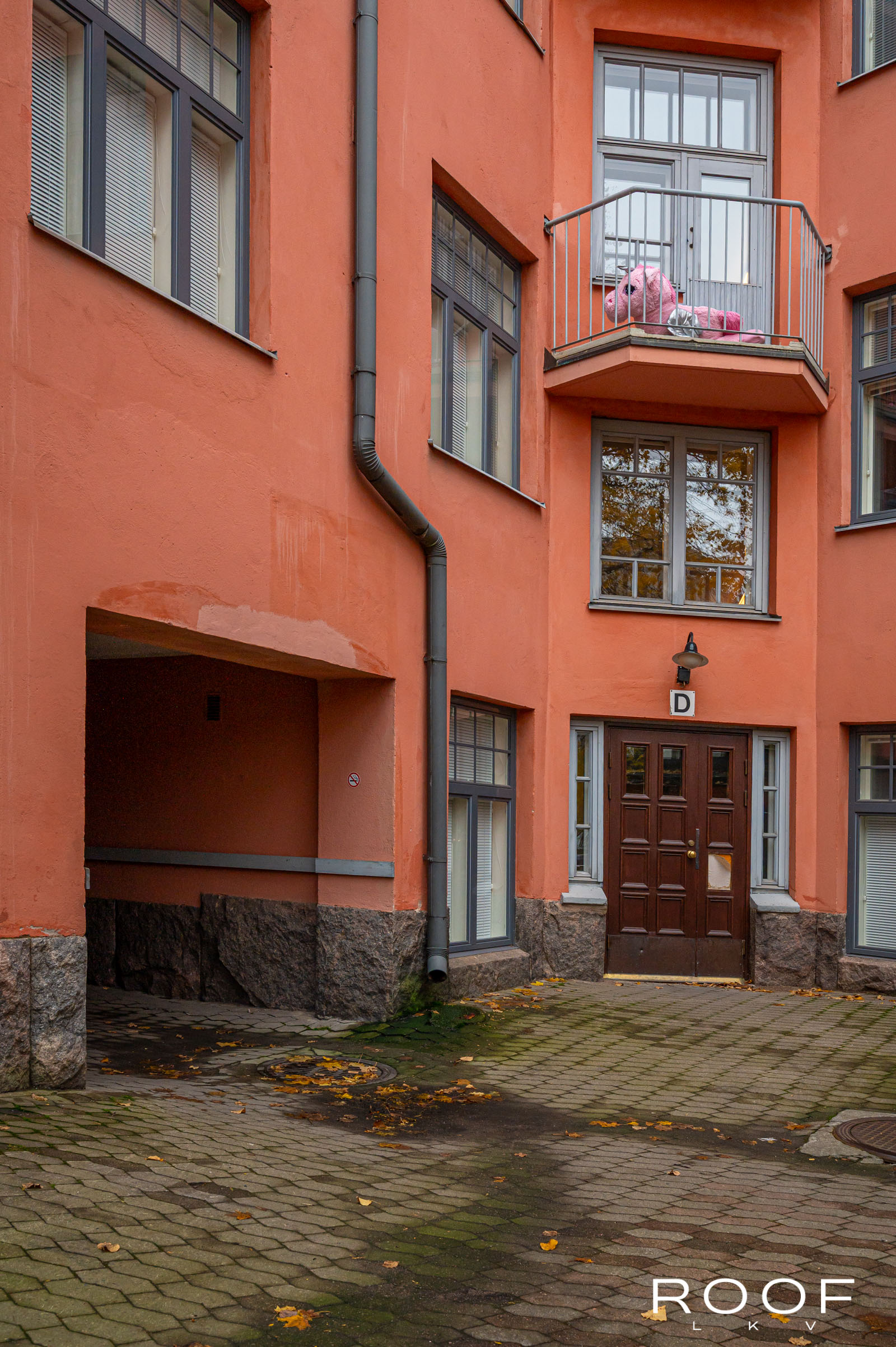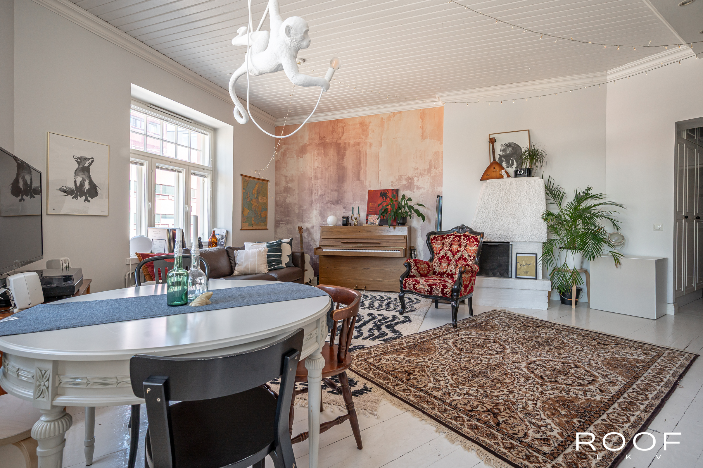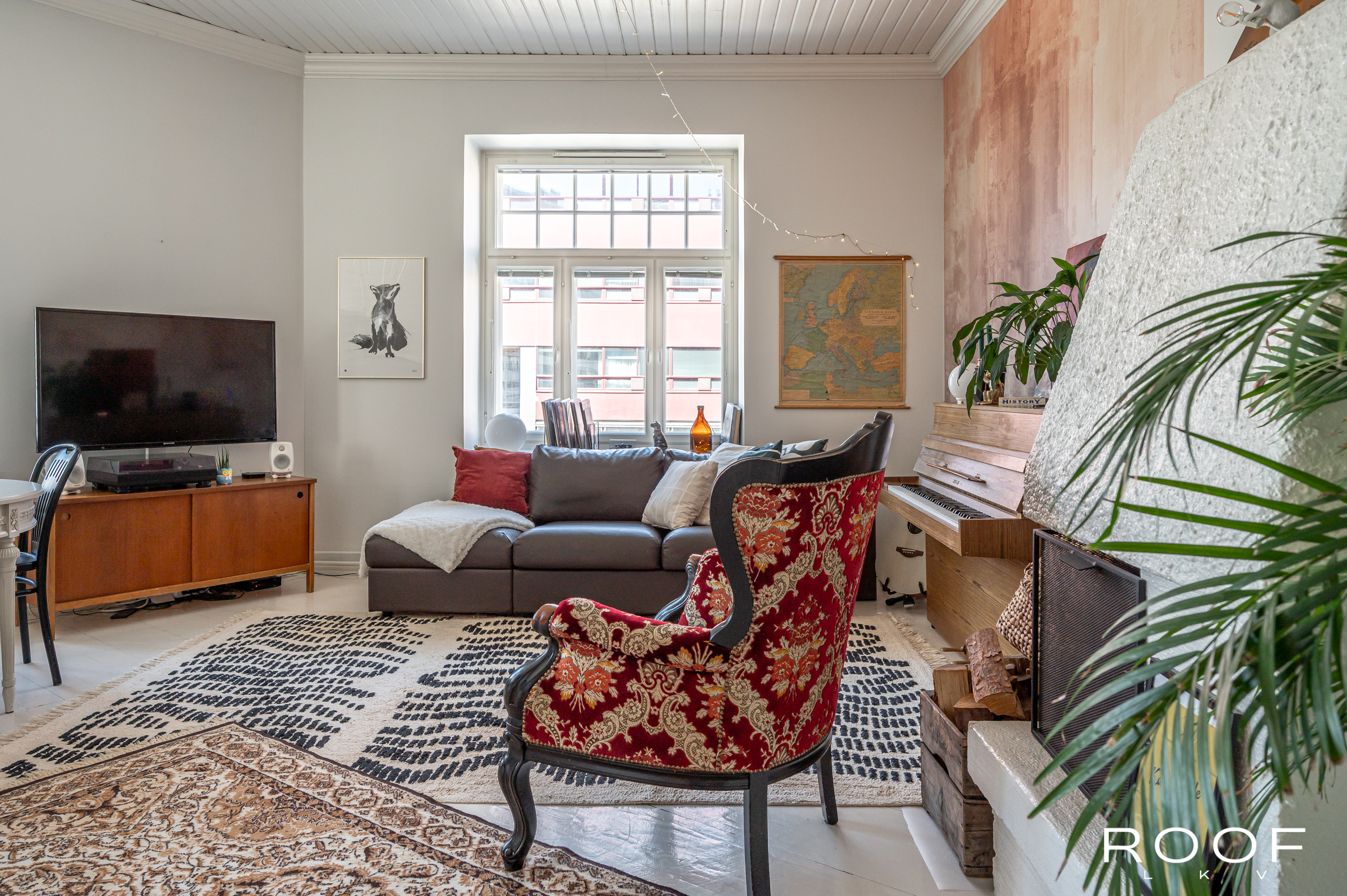Vuonna 1910 valmistuneessa jugendtalossa yhdistyvät aikakauden arvokas tunnelma ja yksityiskohtien taidokas käsityö. Korkeat huoneet, alkuperäiset maalatut puulattiat ja koristeelliset yksityiskohdat luovat asuntoon ainutlaatuisen hengen. Suuret ikkunat kahteen ilmansuuntaan päästävät valon tulvimaan tiloihin, ja kylminä kuukausina kodin sydämeksi nousee tunnelmallinen takka.