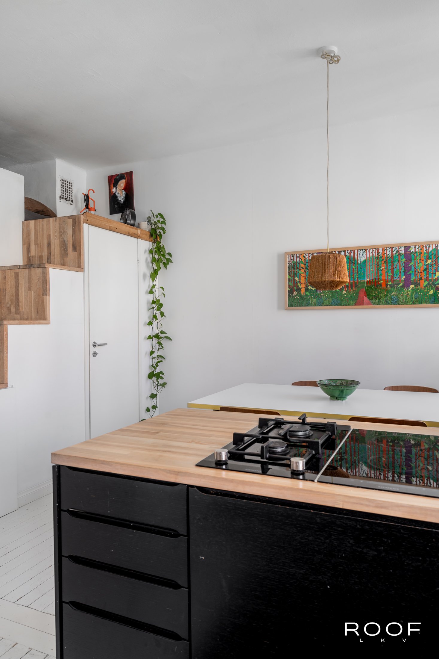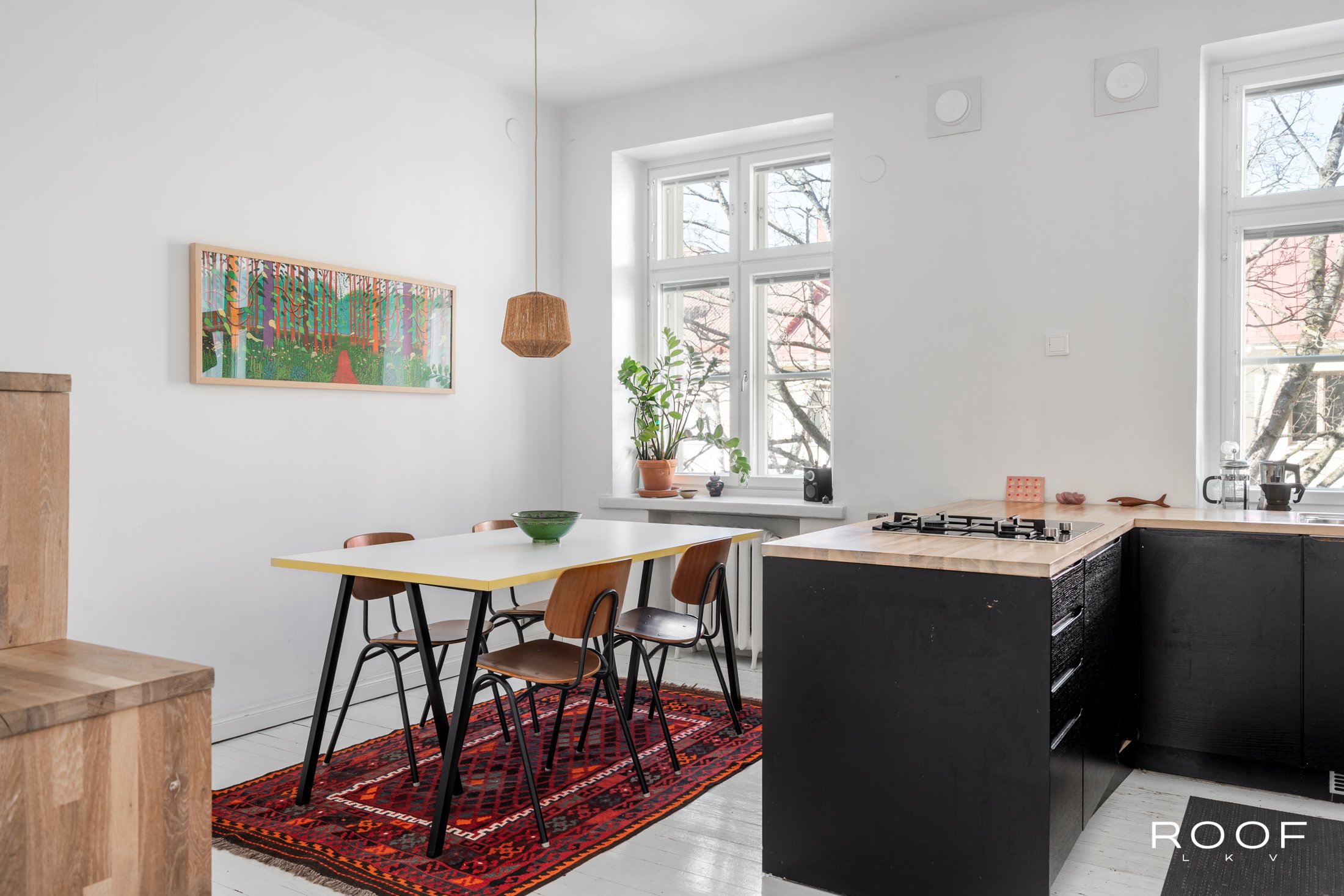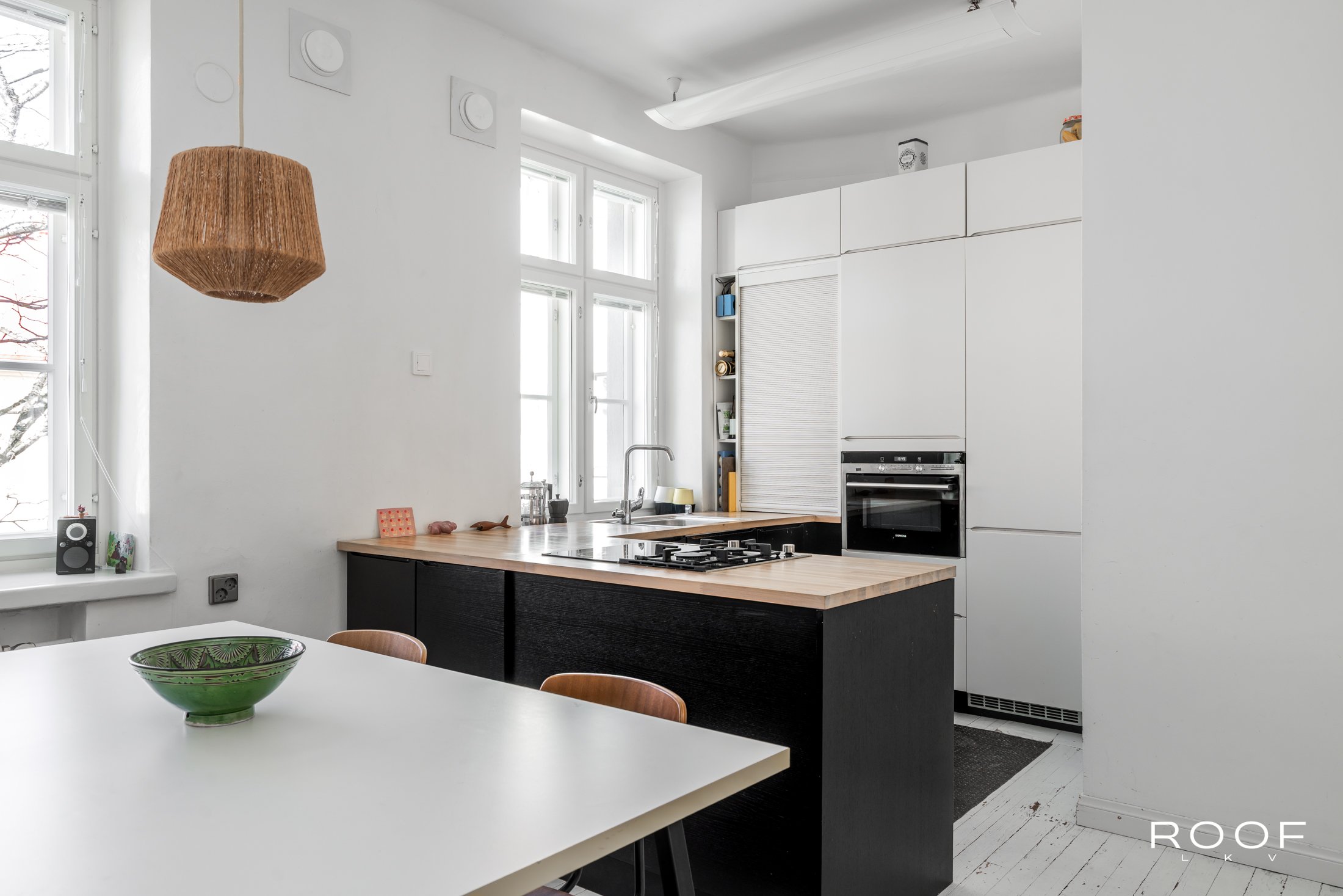 Asunnon vaalea sävymaailma, lauta lattiat ja leveät ikkunalaudat tuovat tilaan ilmavuutta ja persoonallista ilmettä. Lisäksi asunnosta löytyy suuri parvi, jonne johtaa leveät portaat....