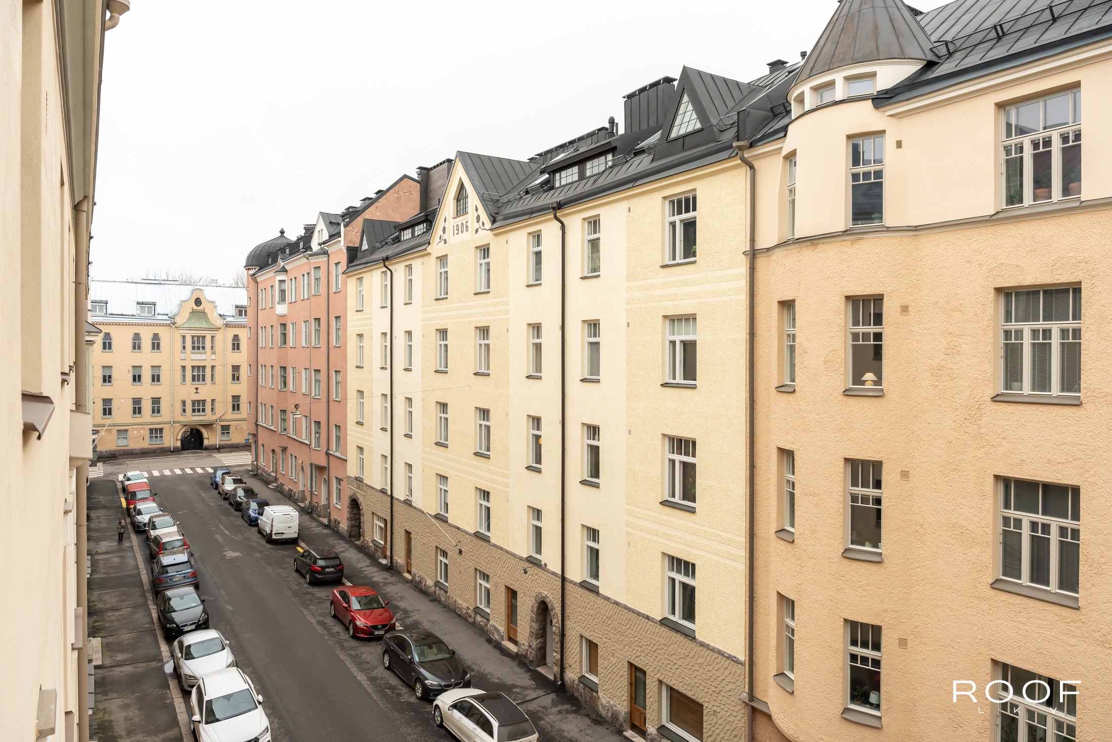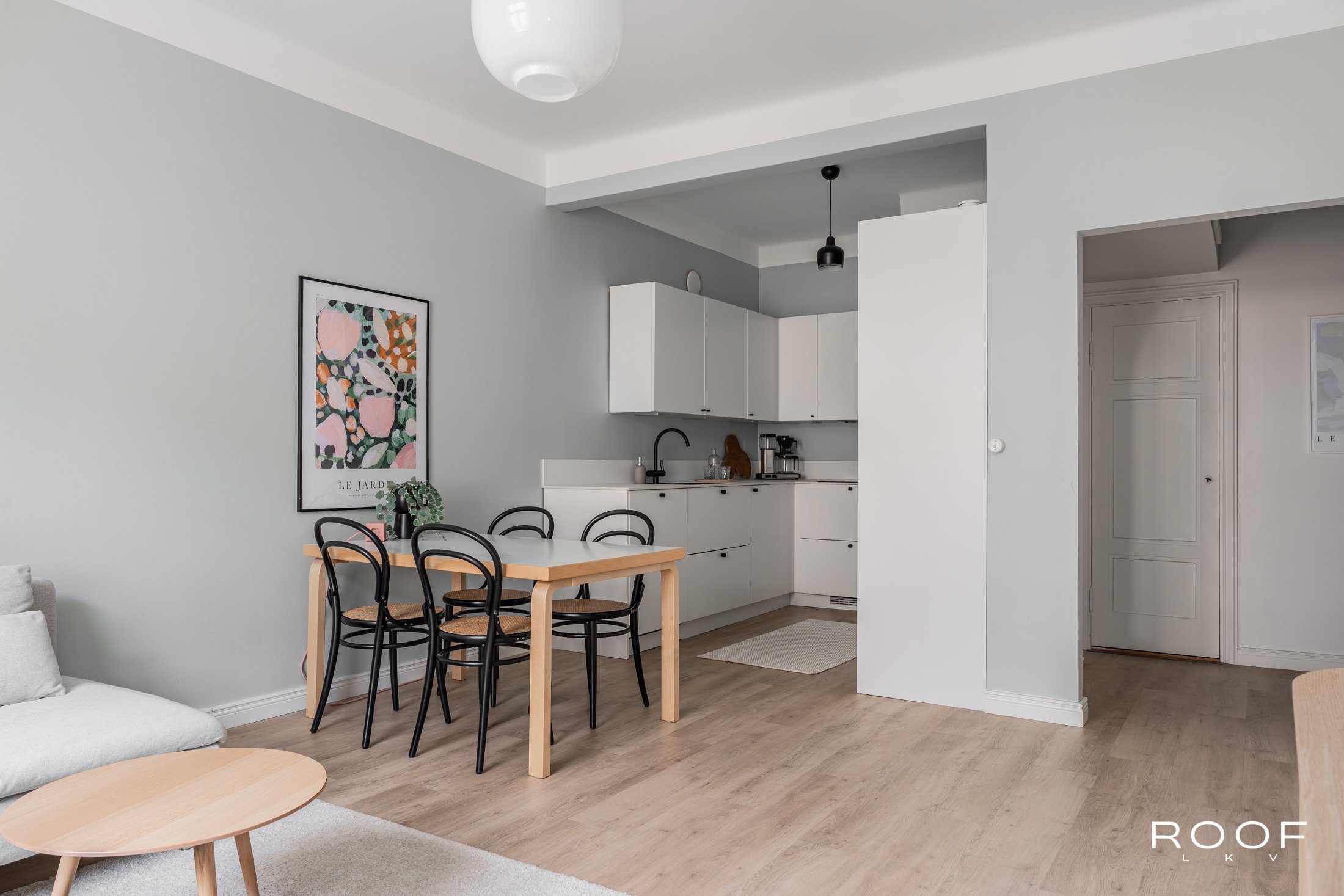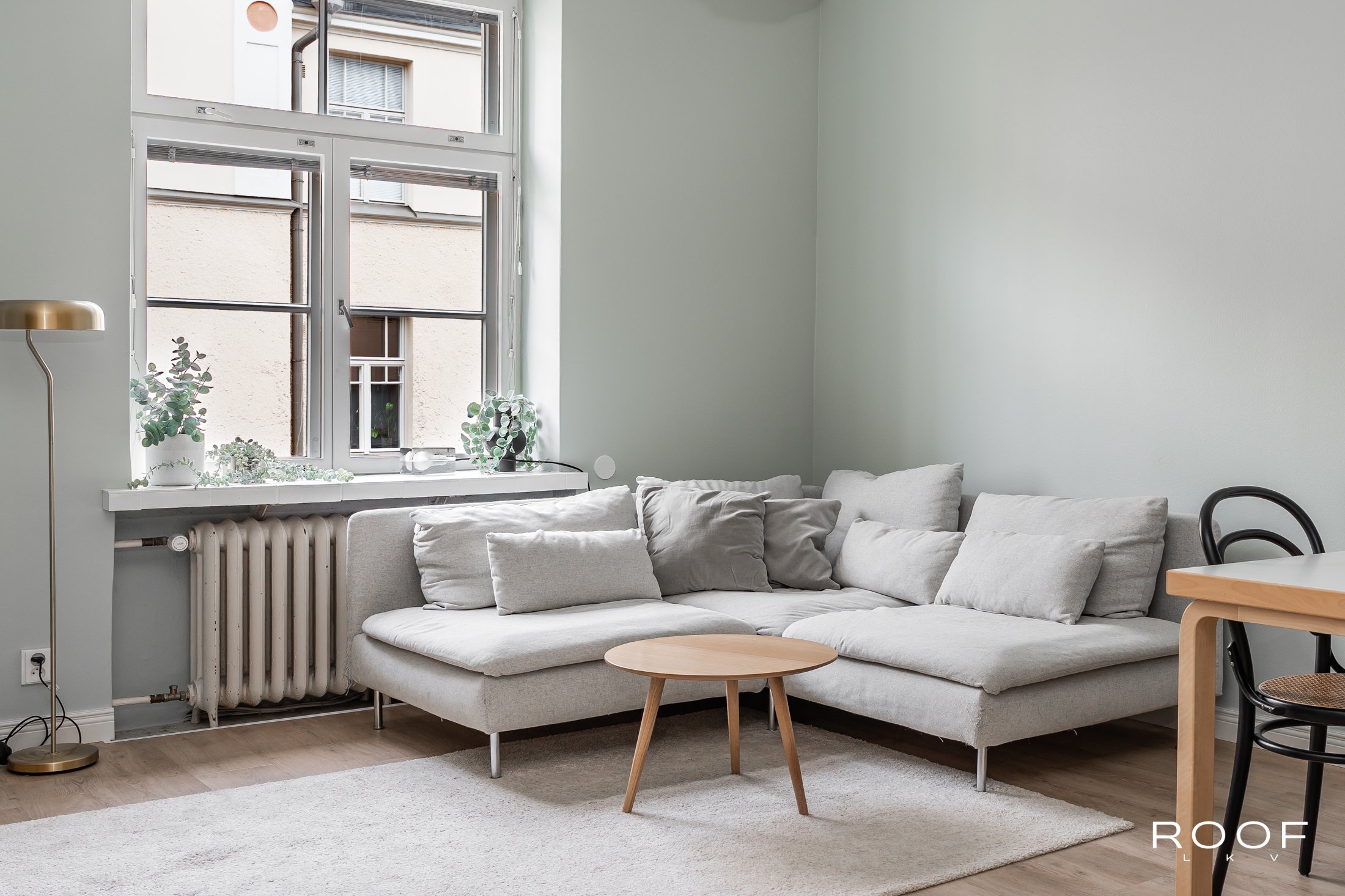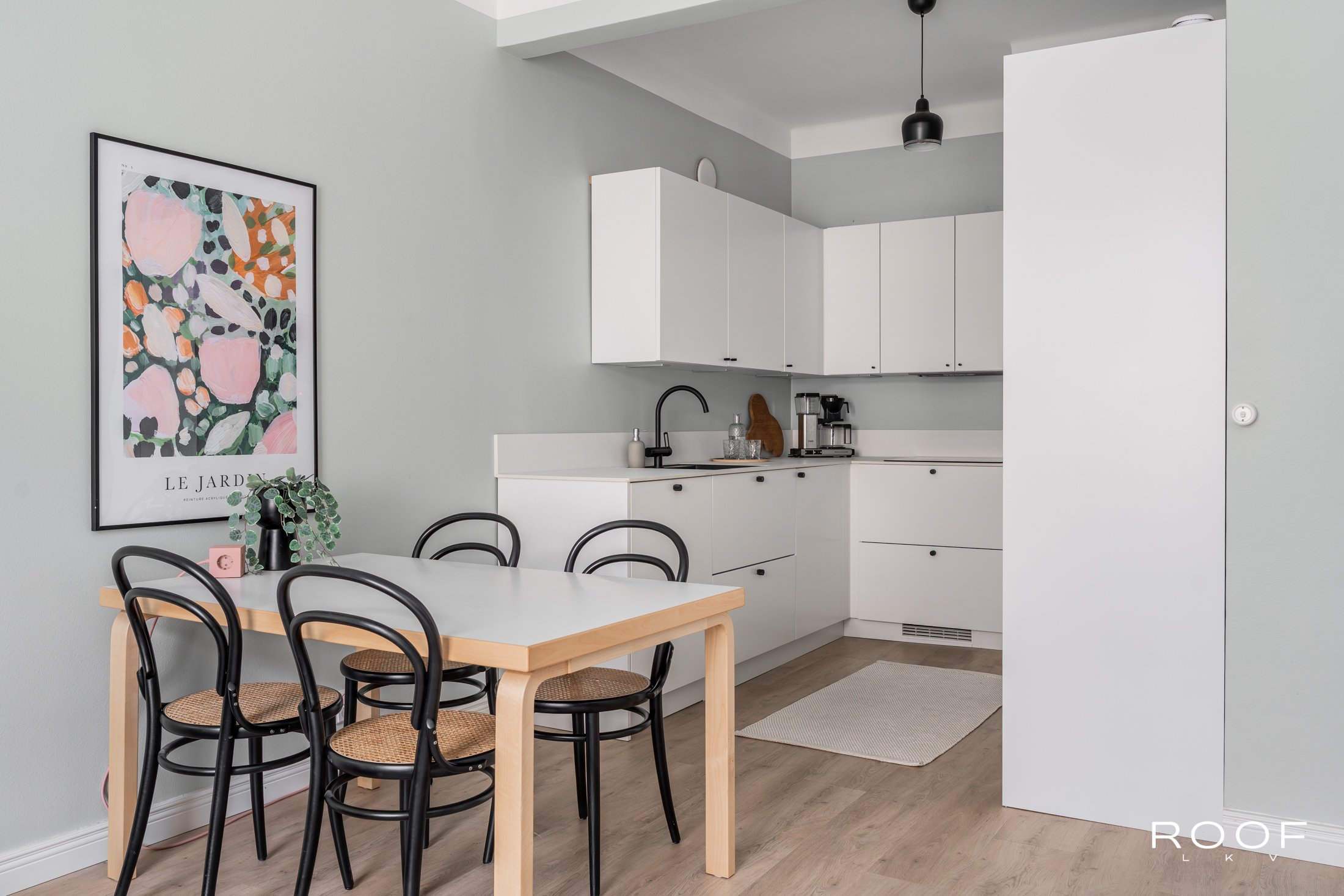Huoneisto on remontoitu muutama vuosi sitten ja viimeistelty moderniin, ajattomaan ilmeeseen. Pohjaratkaisu on selkeä ja neliöt on hyödynnetty tehokkaasti, mikä tekee tiloista käytännölliset ja helposti kalustettavat. Korkeat huoneet ja syvät ikkunalaudat tuovat kotiin Jugend-arkkitehtuurin tunnistettavaa charmia ja ...