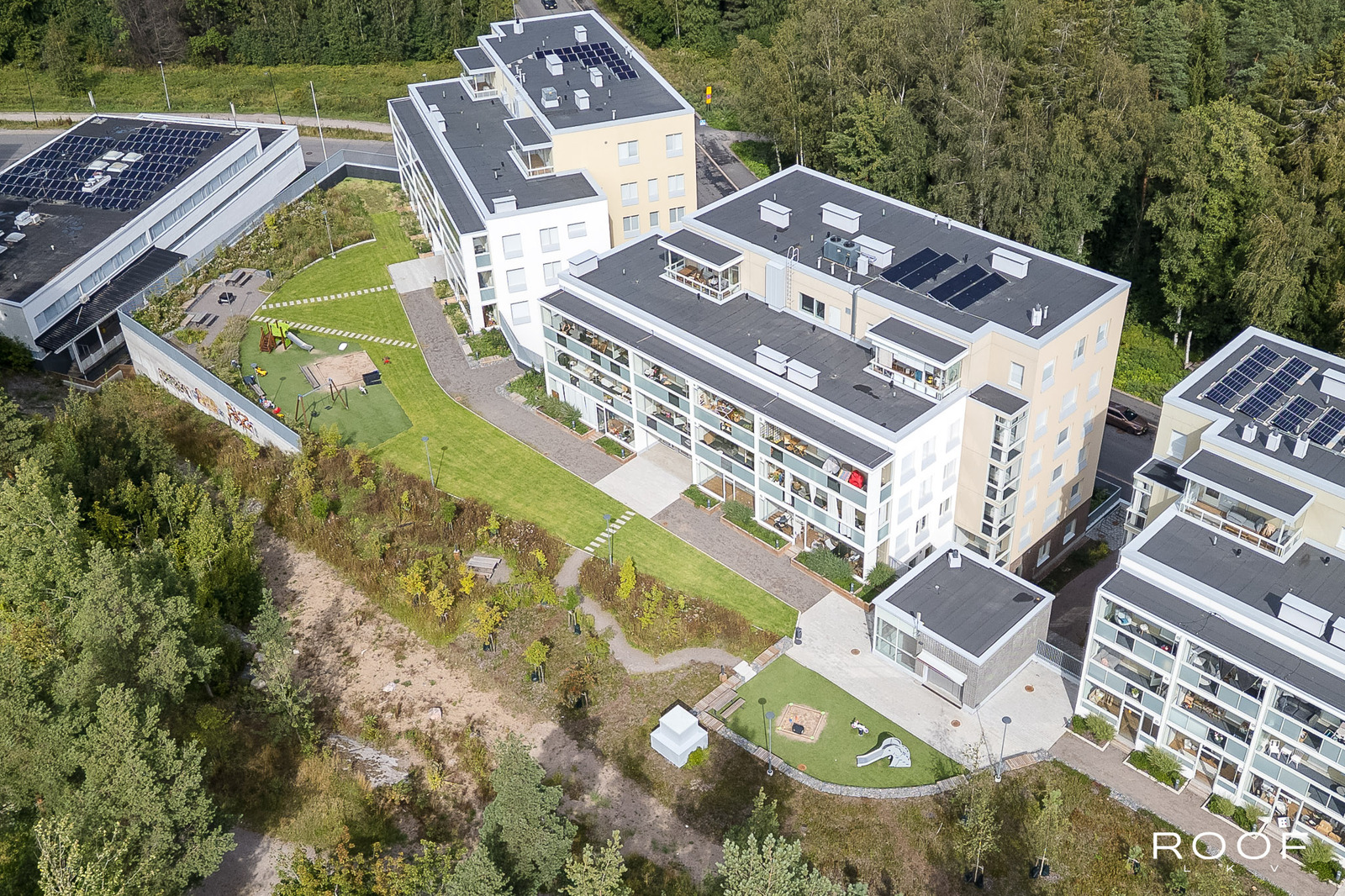 Laadukasta arkea sisäpihan puoleisessa kodissa Alppiruusupuiston laidalla.
