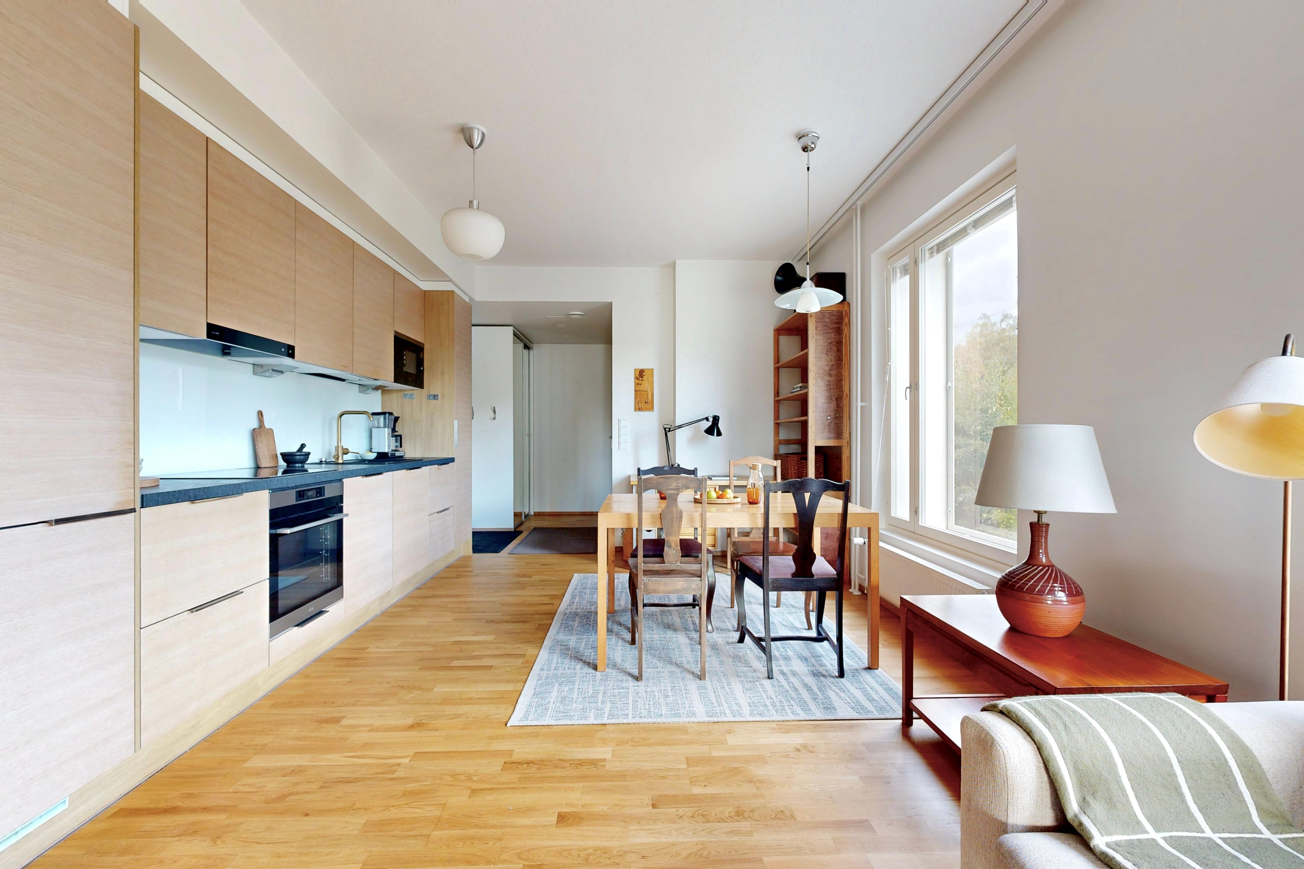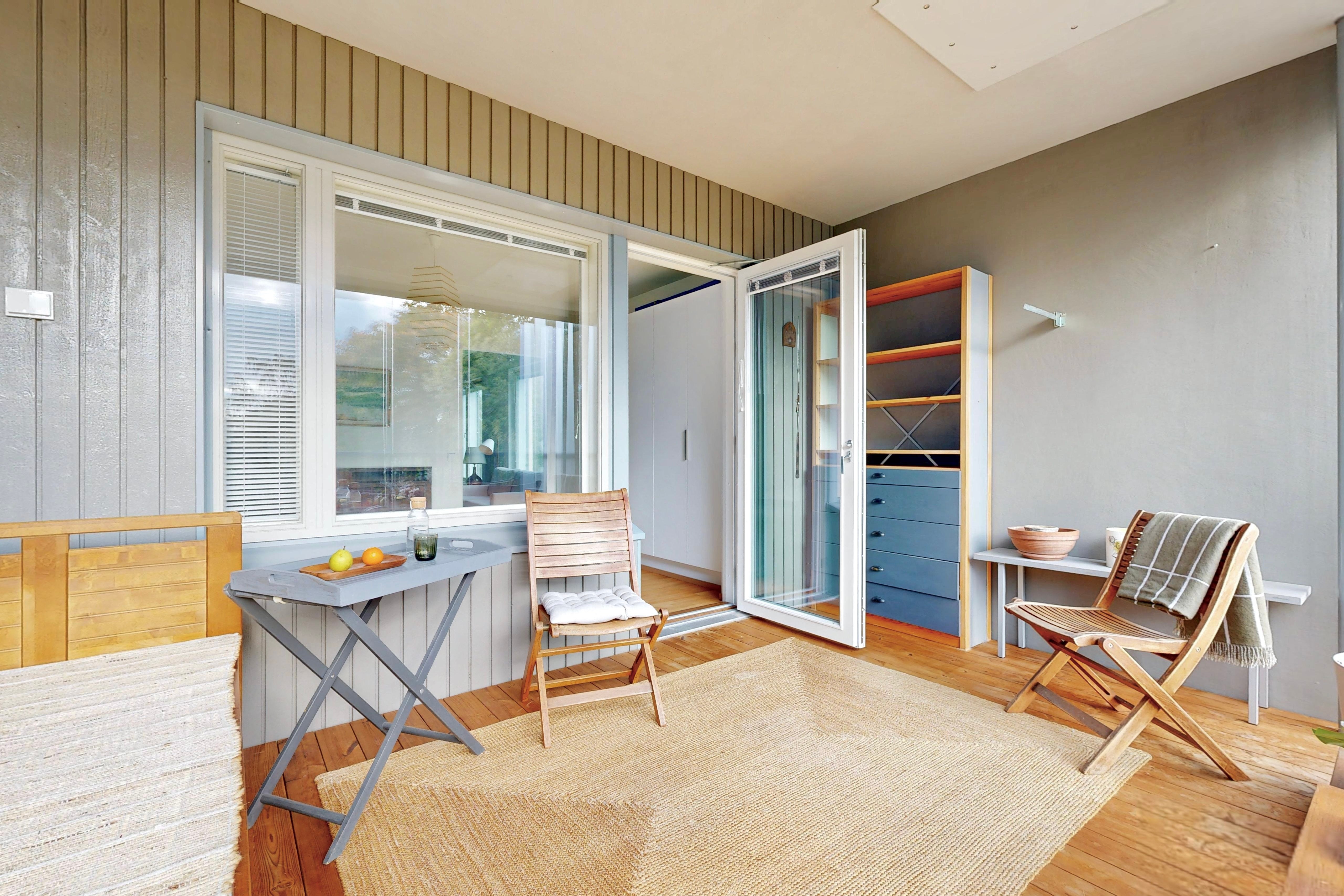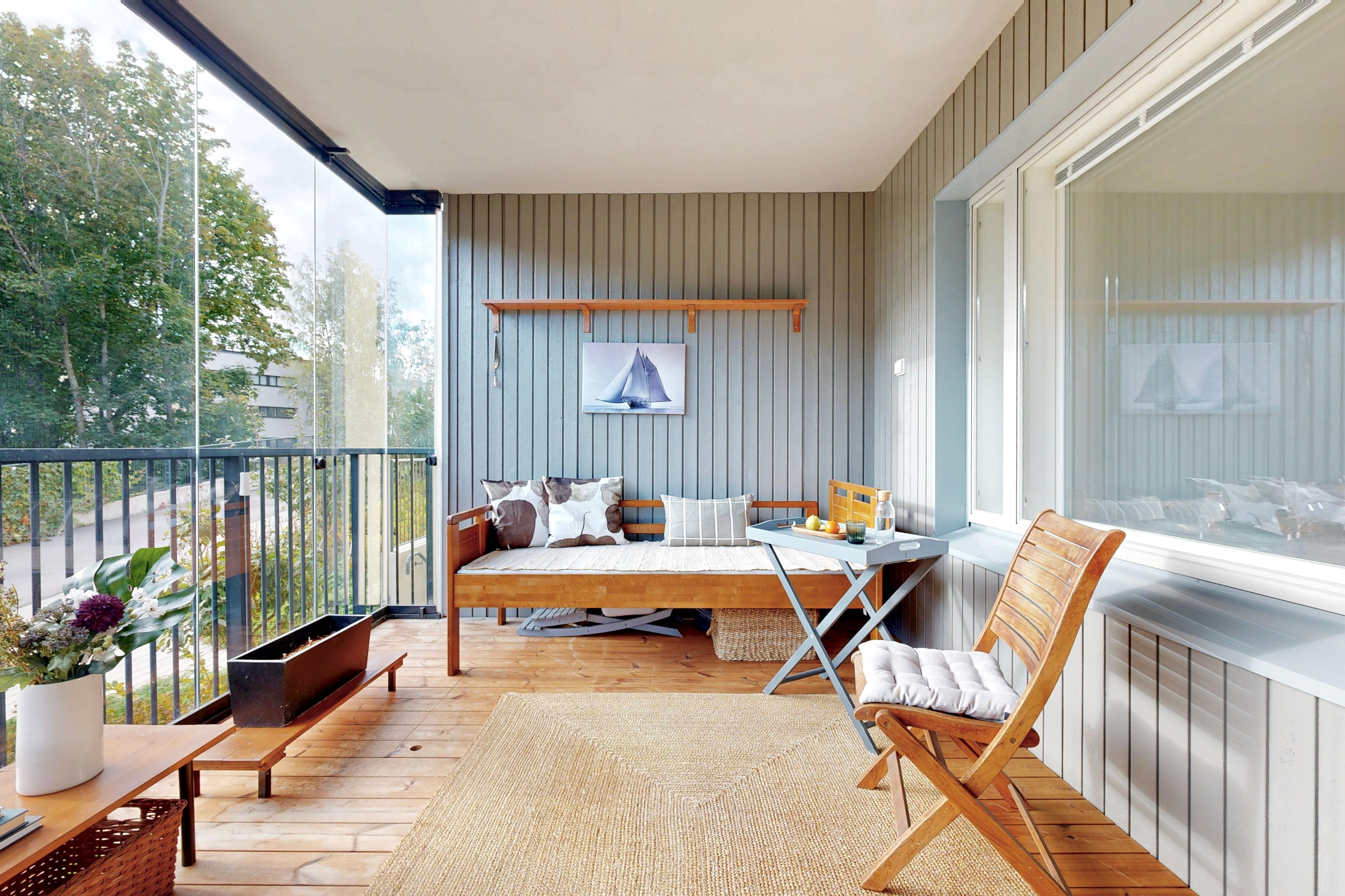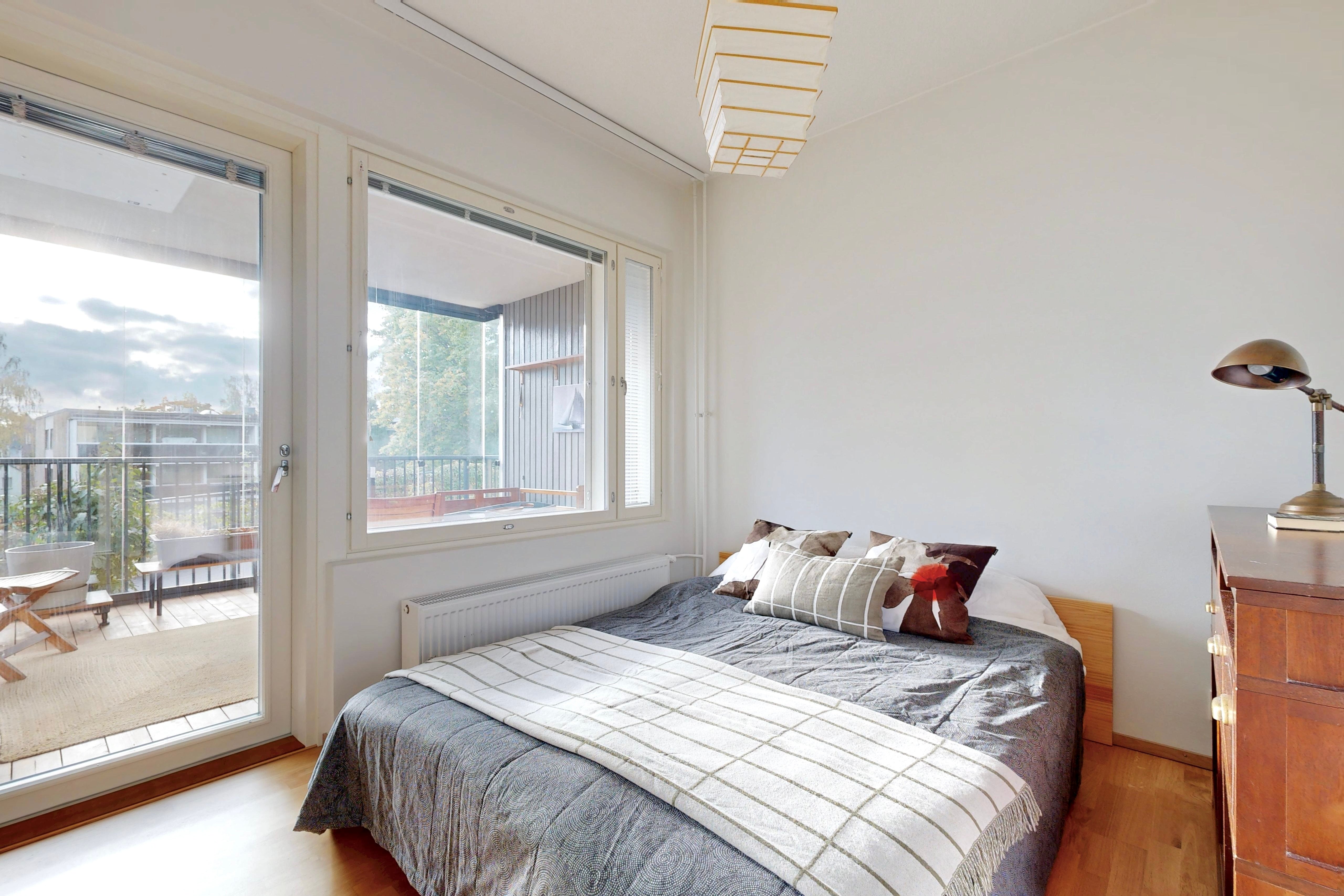 Tässä kulmaahuoneistossa ihastuttaa valoisat oleskelutilat, johon mahtuu niin sohva-kuin ruokaryhmä. Asunnossa on tyylikäs keittiö, jossa on hyvin säilytys-ja laskutilaa. Makuuhuoneesta on käynti lasitetulle parvekkeelle, joka toimii lisähuoneena. Makuuhuoneessa ja eteisessä on lisäksi kaapistot. Tilava kylpyhuone, jossa paikka pyykinpesutornille.