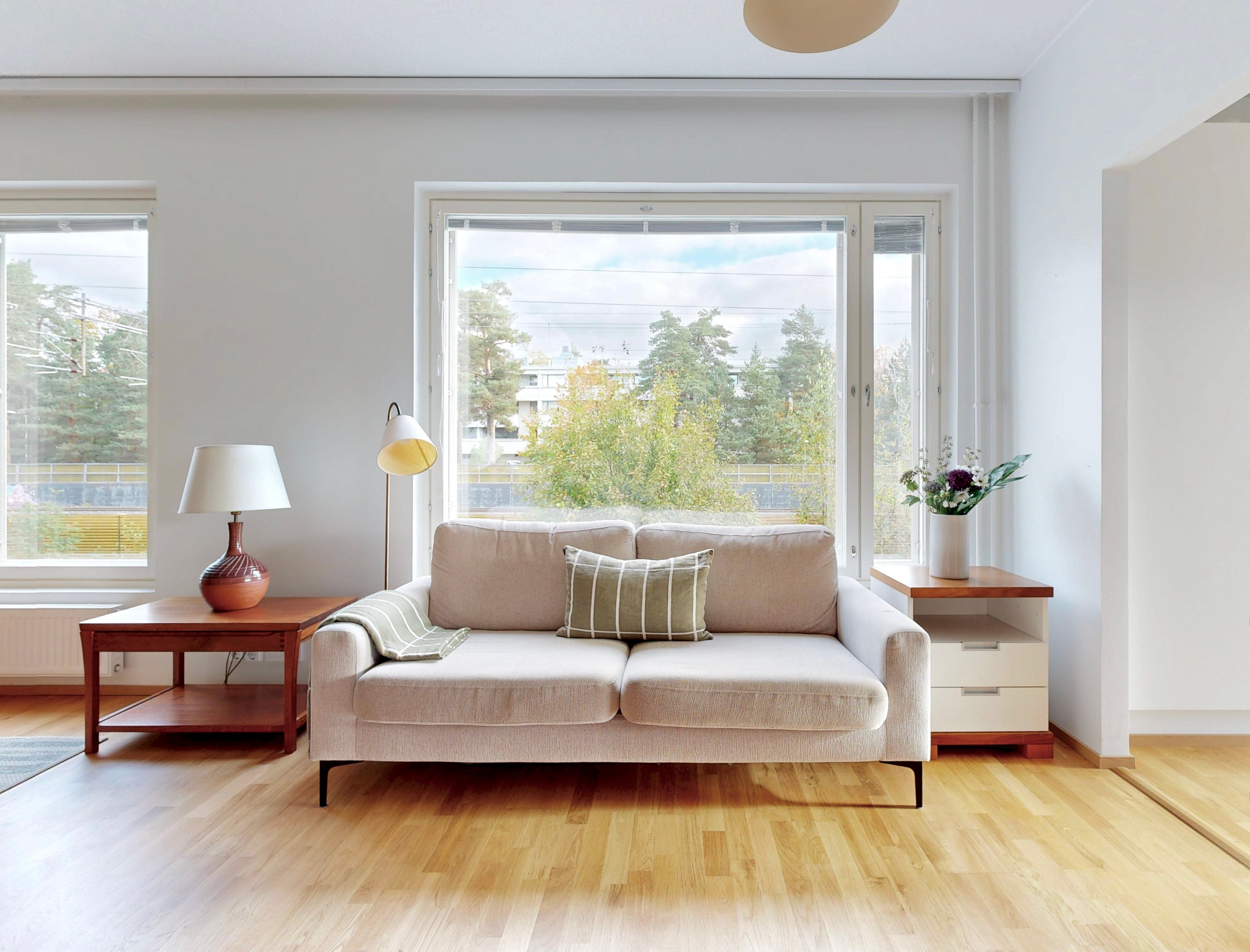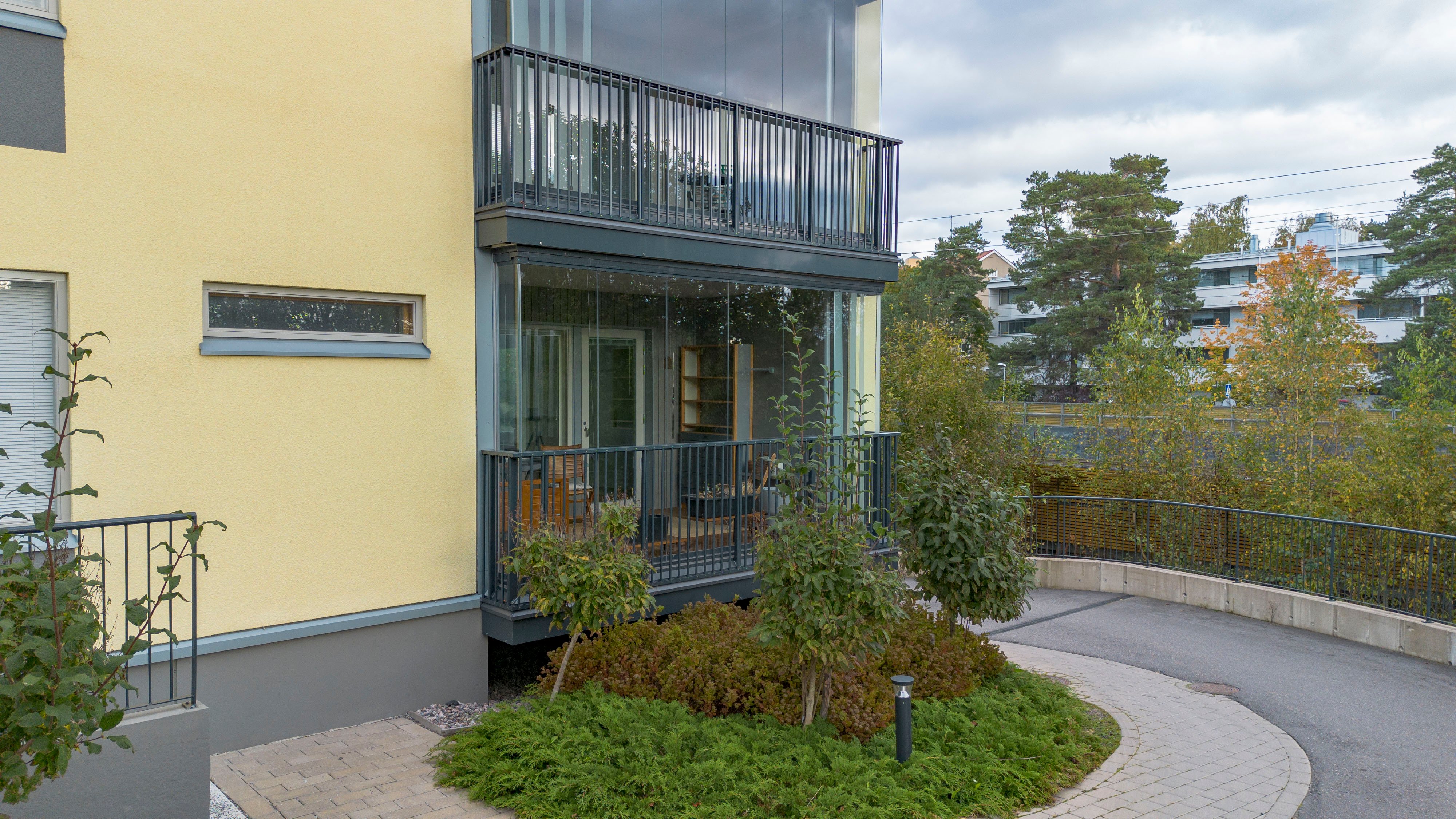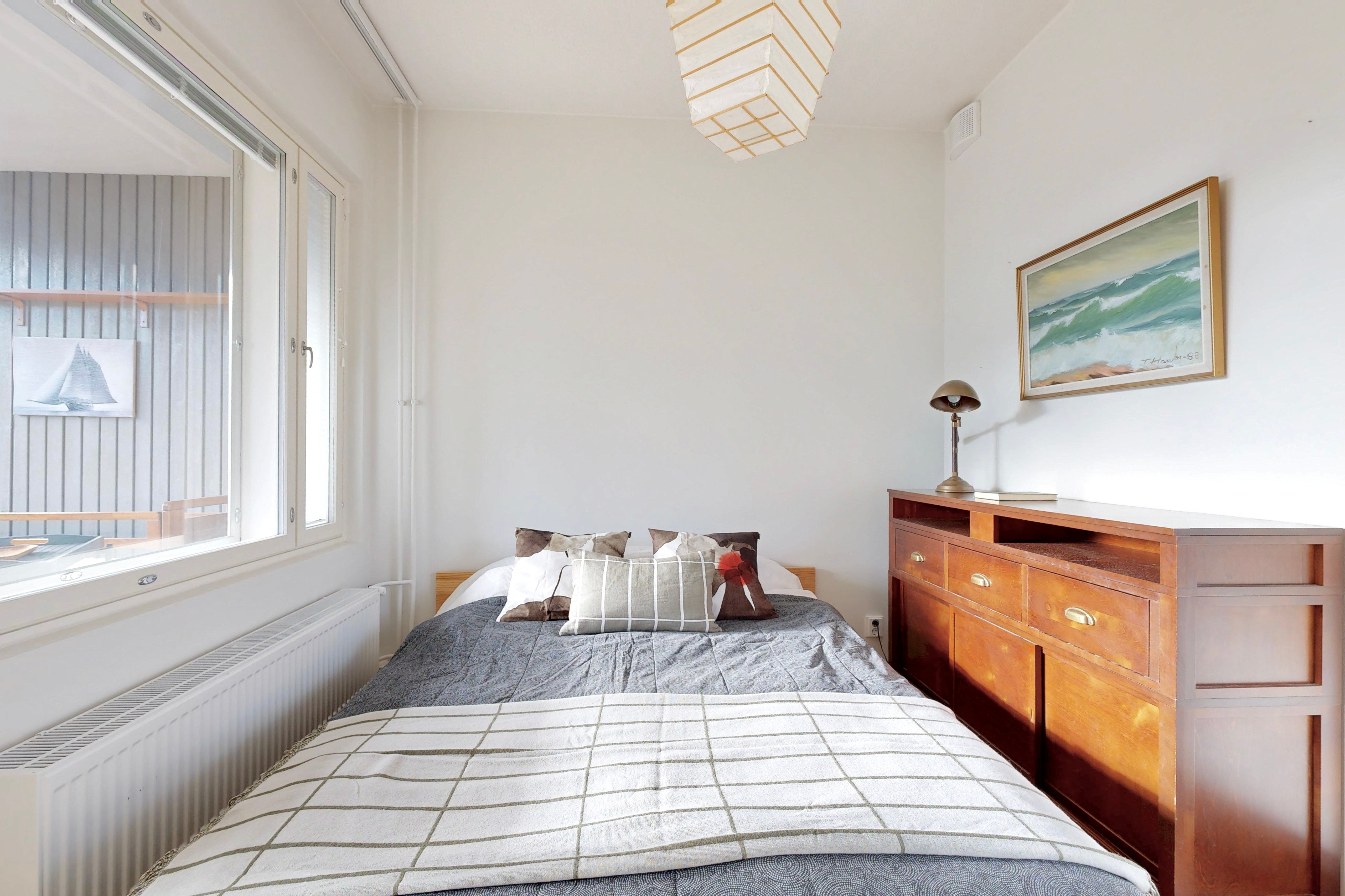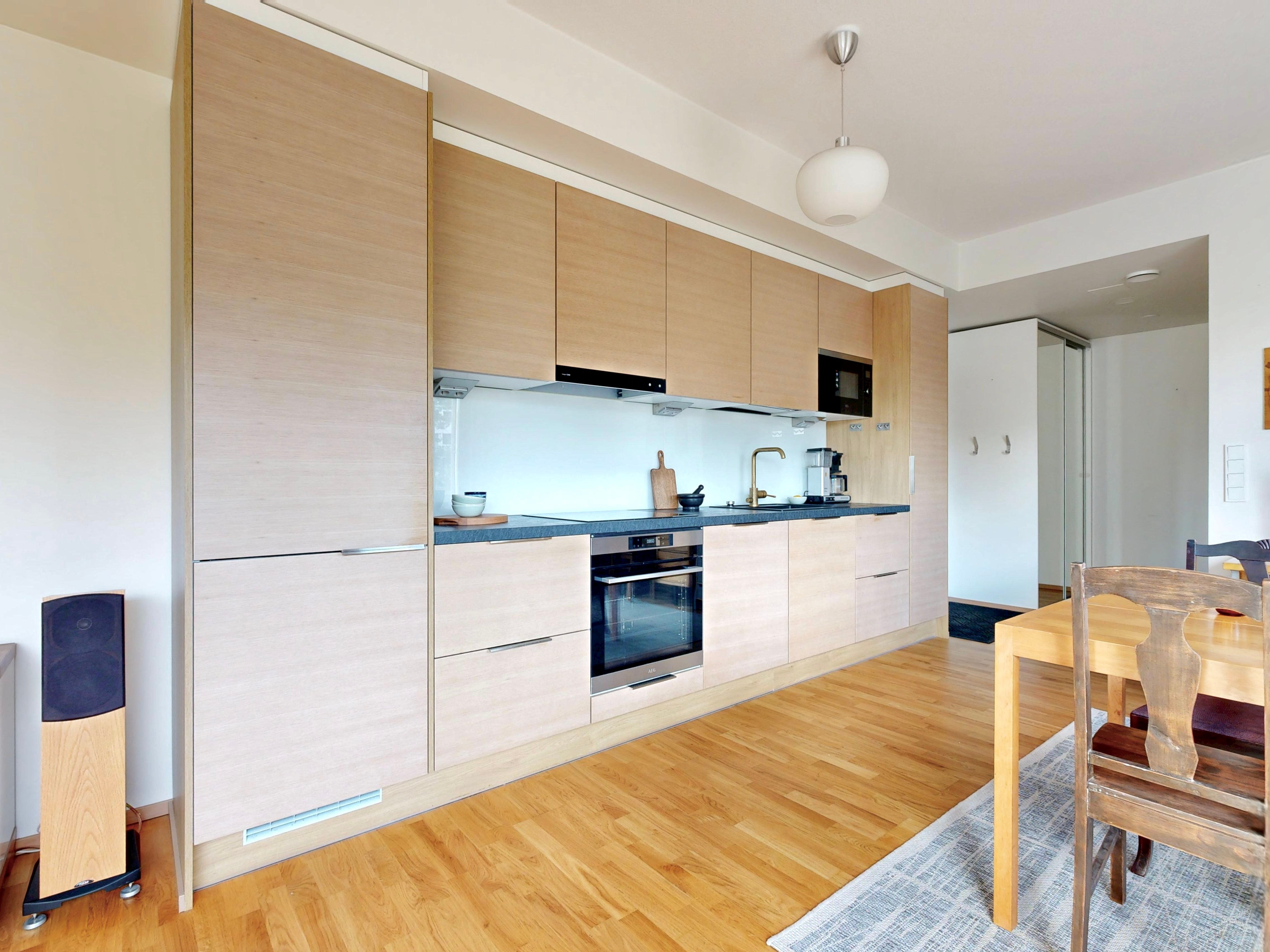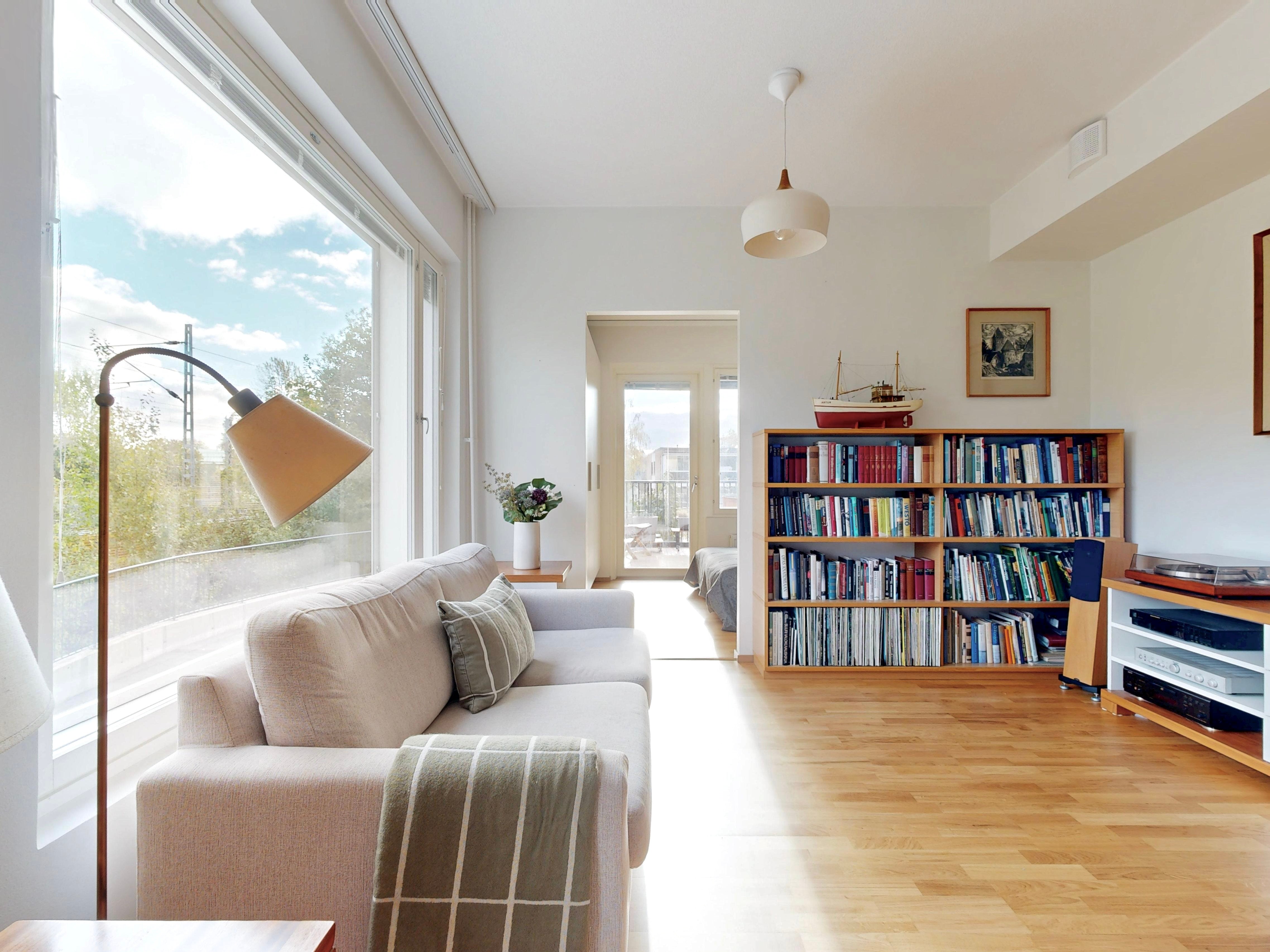 Tässä kulmaahuoneistossa ihastuttaa valoisat oleskelutilat, johon mahtuu niin sohva-kuin ruokaryhmä. Asunnossa on tyylikäs keittiö, jossa on hyvin säilytys-ja laskutilaa. Makuuhuoneesta on käynti lasitetulle parvekkeelle, joka toimii lisähuoneena. Makuuhuoneessa ja eteisessä on lisäksi kaapistot. Tilava kylpyhuone, jossa paikka pyykinpesutornille.