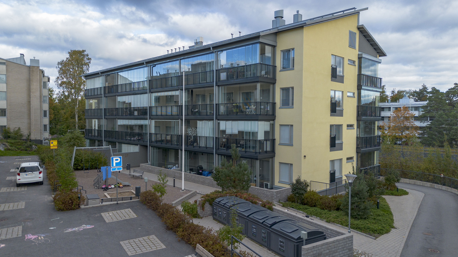 Tässä kulmaahuoneistossa ihastuttaa valoisat oleskelutilat, johon mahtuu niin sohva-kuin ruokaryhmä. Asunnossa on tyylikäs keittiö, jossa on hyvin säilytys-ja laskutilaa. Makuuhuoneesta on käynti lasitetulle parvekkeelle, joka toimii lisähuoneena. Makuuhuoneessa ja eteisessä on lisäksi kaapistot. Tilava kylpyhuone, jossa paikka pyykinpesutornille.