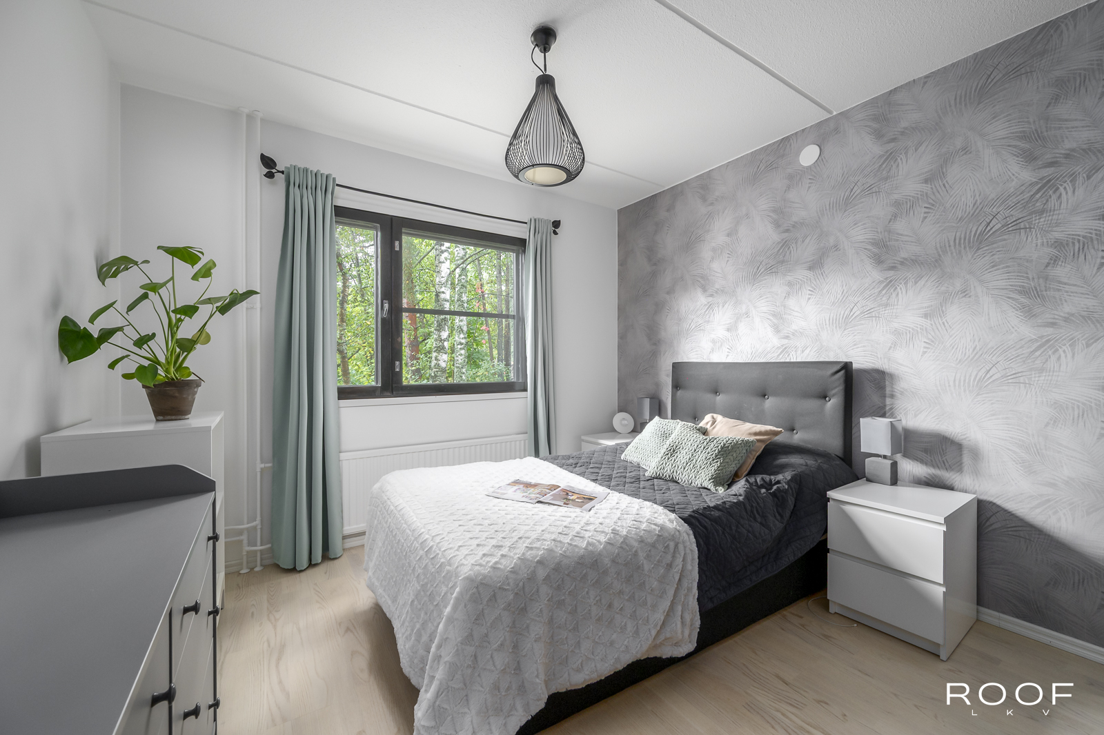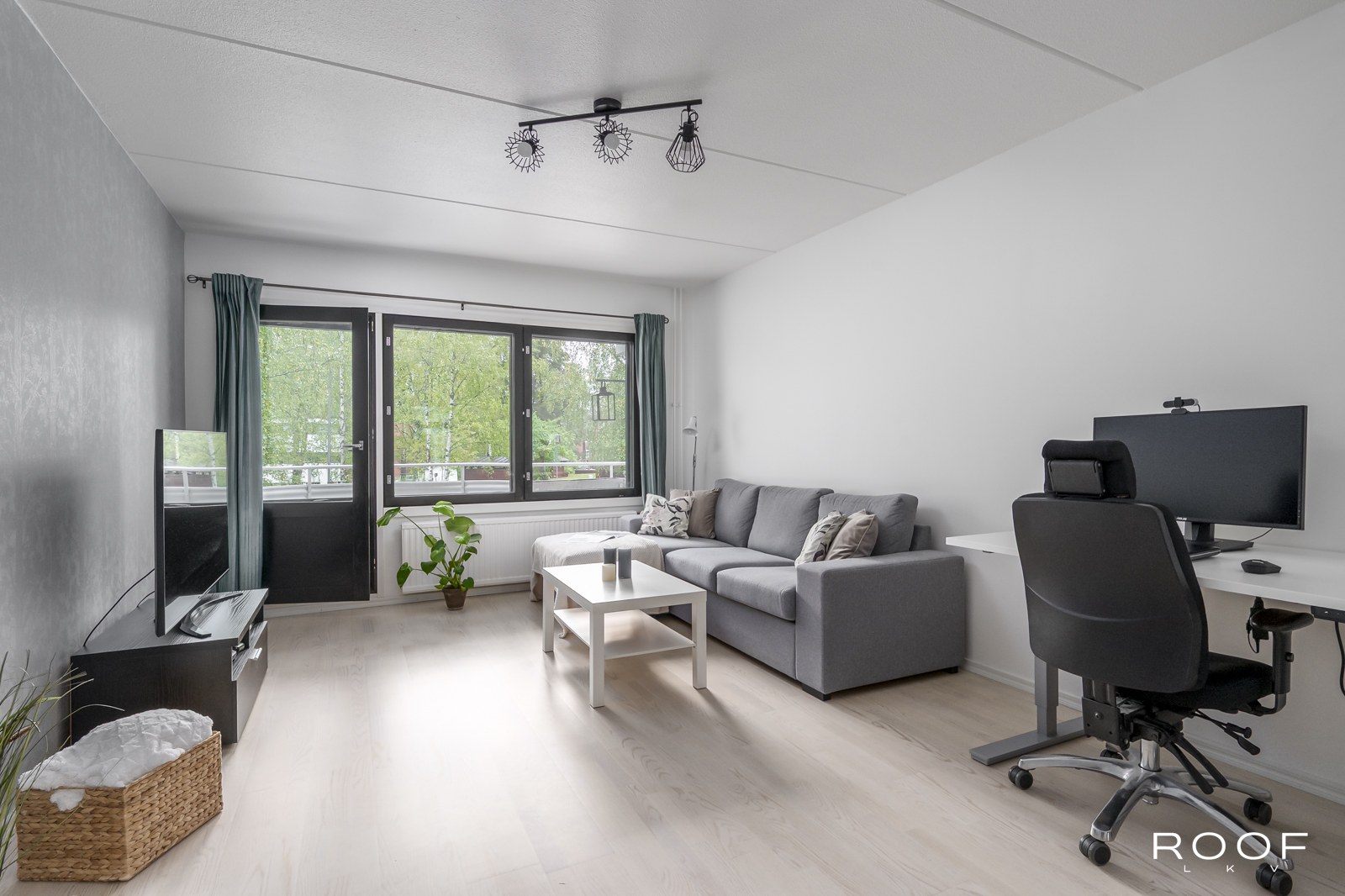 Kattavasti remontoitu koti hurmaa avaruudellaan. Eteisestä avautuu näkymä tilavaan olohuoneeseen, joka sulautuu tyylikkääseen keittiöön ruokailutilan kautta. Suuret ikkunat tuovat luonnonvalon sisään kolmesta suunnasta. Olohuoneesta on lisäksi kulku parvekkeelle, josta on vehreät näkymät pihalle ja rauhalliselle sivukadulle. Vuonna 2021 uusittu keittiö on moderni ja käytännöllinen. Samassa yhteydessä uusittiin myös asunnon pinnat ja makuuhuoneen sekä eteisen kaapistot, joten koti on muuttovalmis ja ajantasainen. Makuuhuone tarjoaa tilaa parisängylle sekä runsaasti säilytystilaa. Kylpyhuoneen yhteydessä oleva oma sauna kruunaa kokonaisuuden.