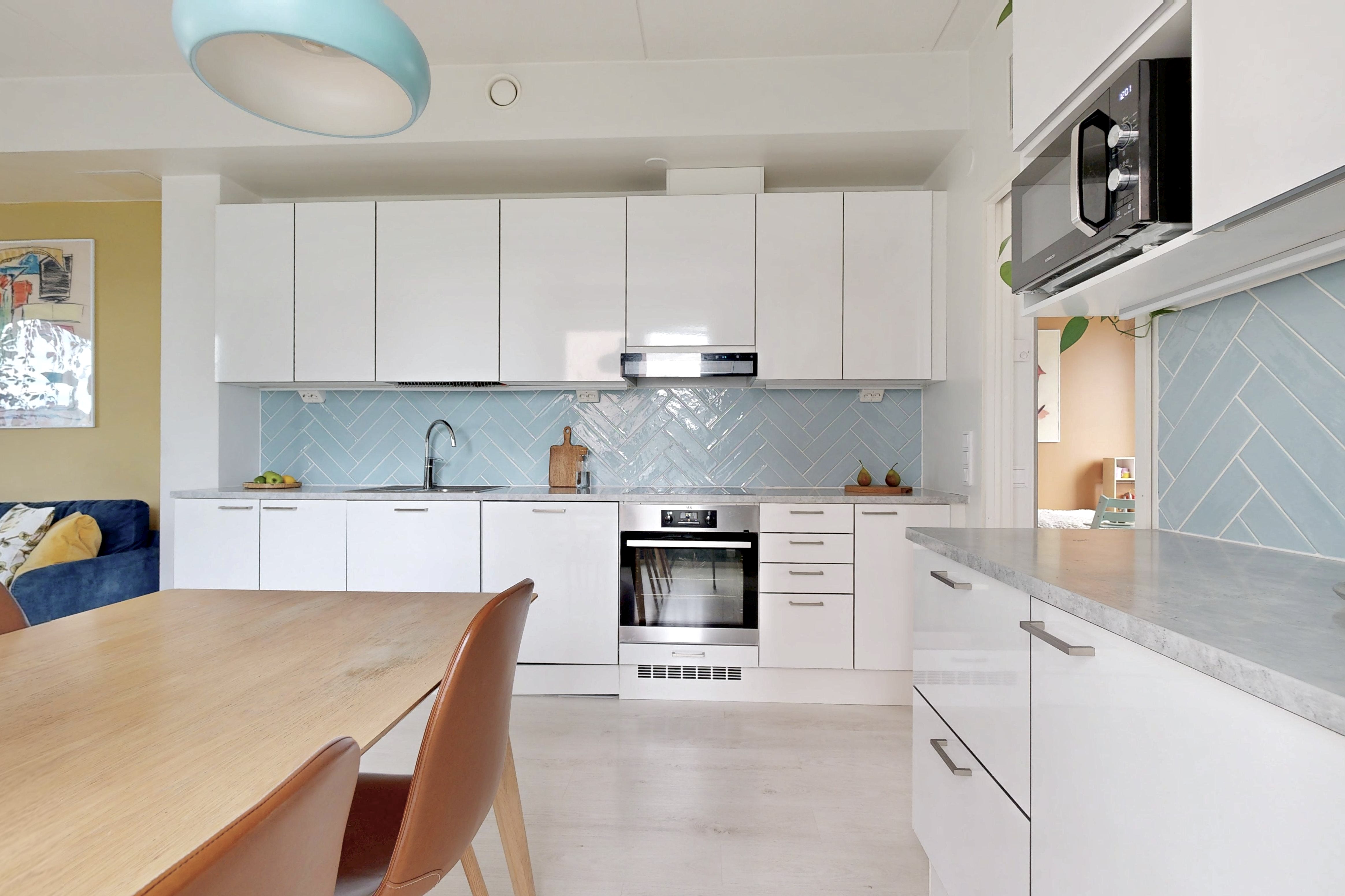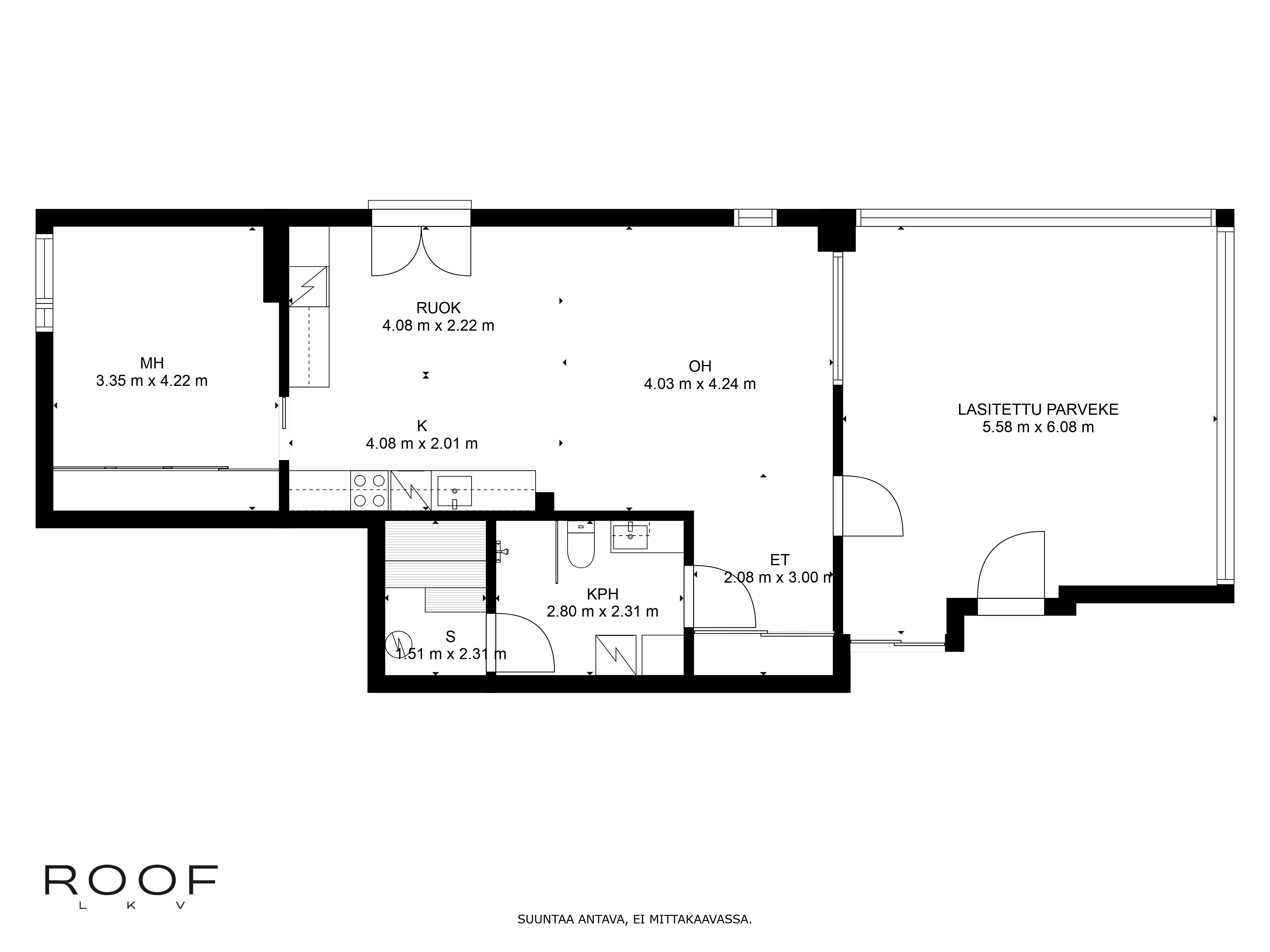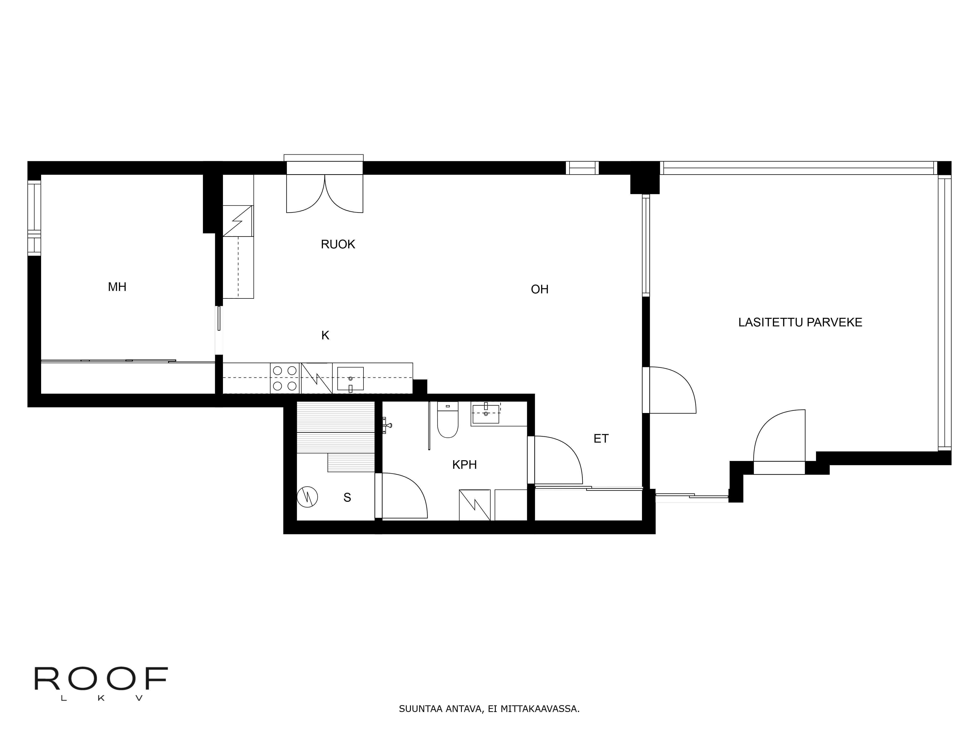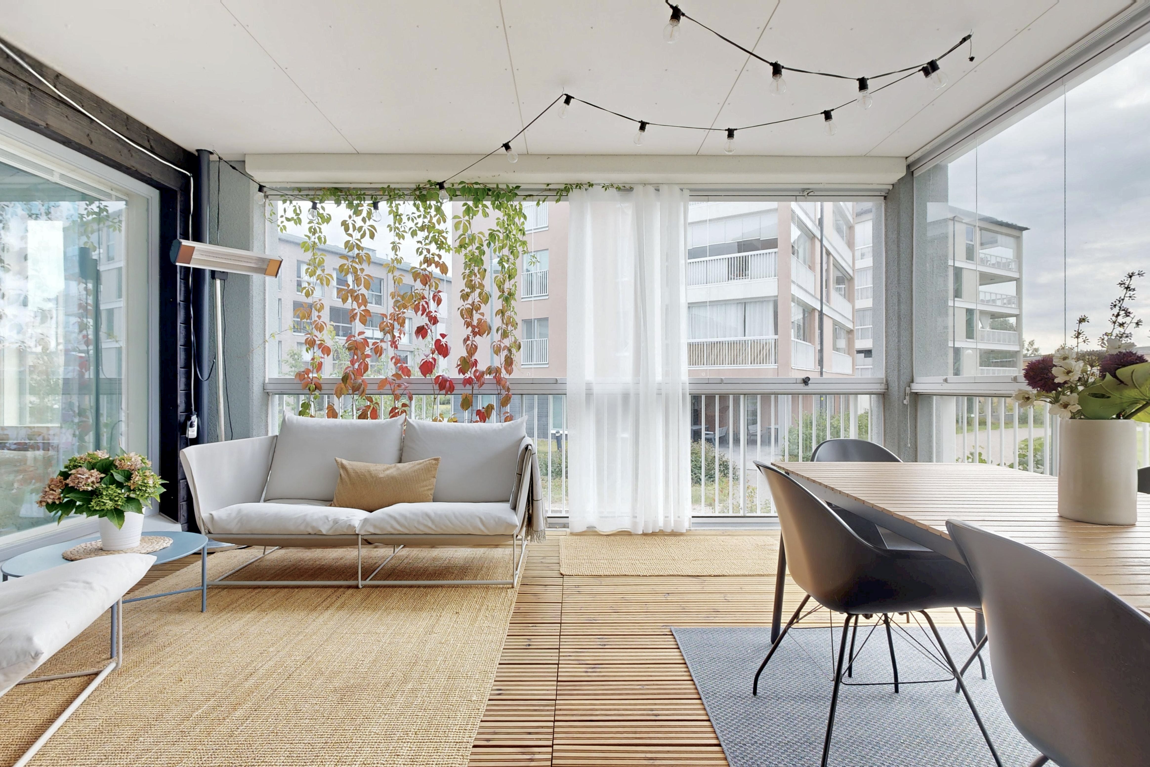 Olohuone ja keittiö muodostavat yhtenäisen tilavan oleskelutilan. Isot ikkunat sekä lasitettu parveke 28m² tuovat valoisuutta kotiin. Keittiössä hyvin kaappi-ja laskutilaa. Makuuhuoneessa liukuovikaapisto. Tilava kylpyhuone saunalla.