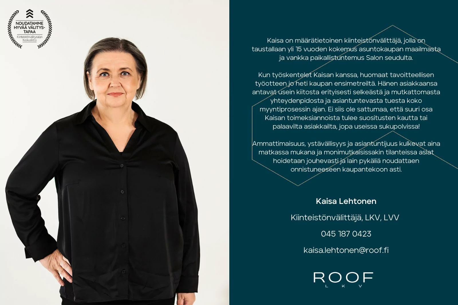 Hyvä sijainti lähellä Salon keskustan palveluita. Liikekeskus Valurin palvelut 1 km päässä. Nopea ja vaivaton tieyhteys E18 moottoritielle. Päivittäistavarakauppa, koulu ja päiväkoti lähellä. Monia metsäpolkuja lähettyvillä.
