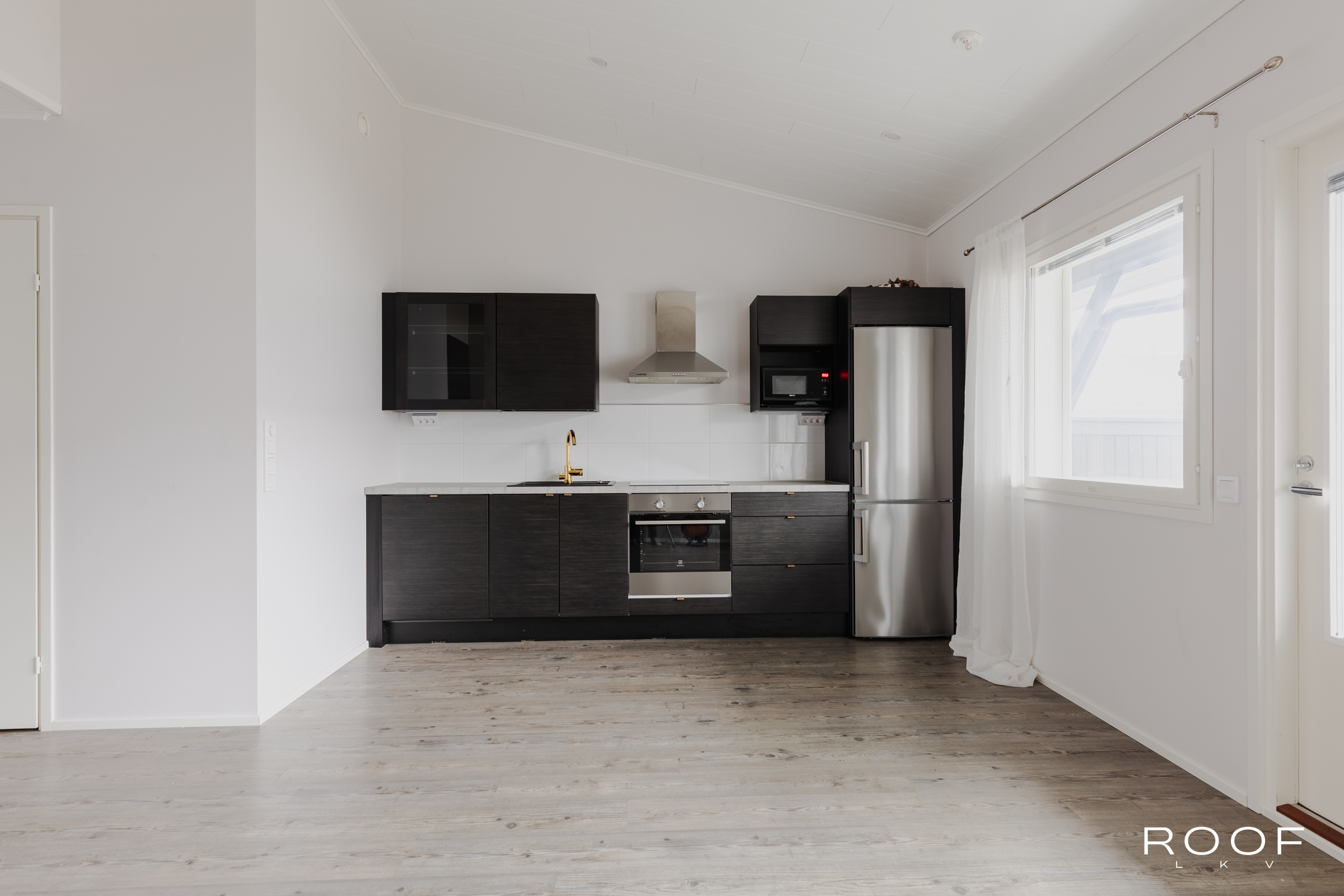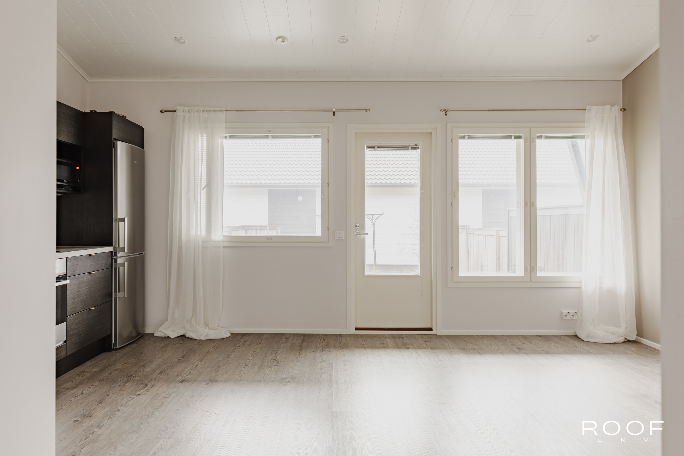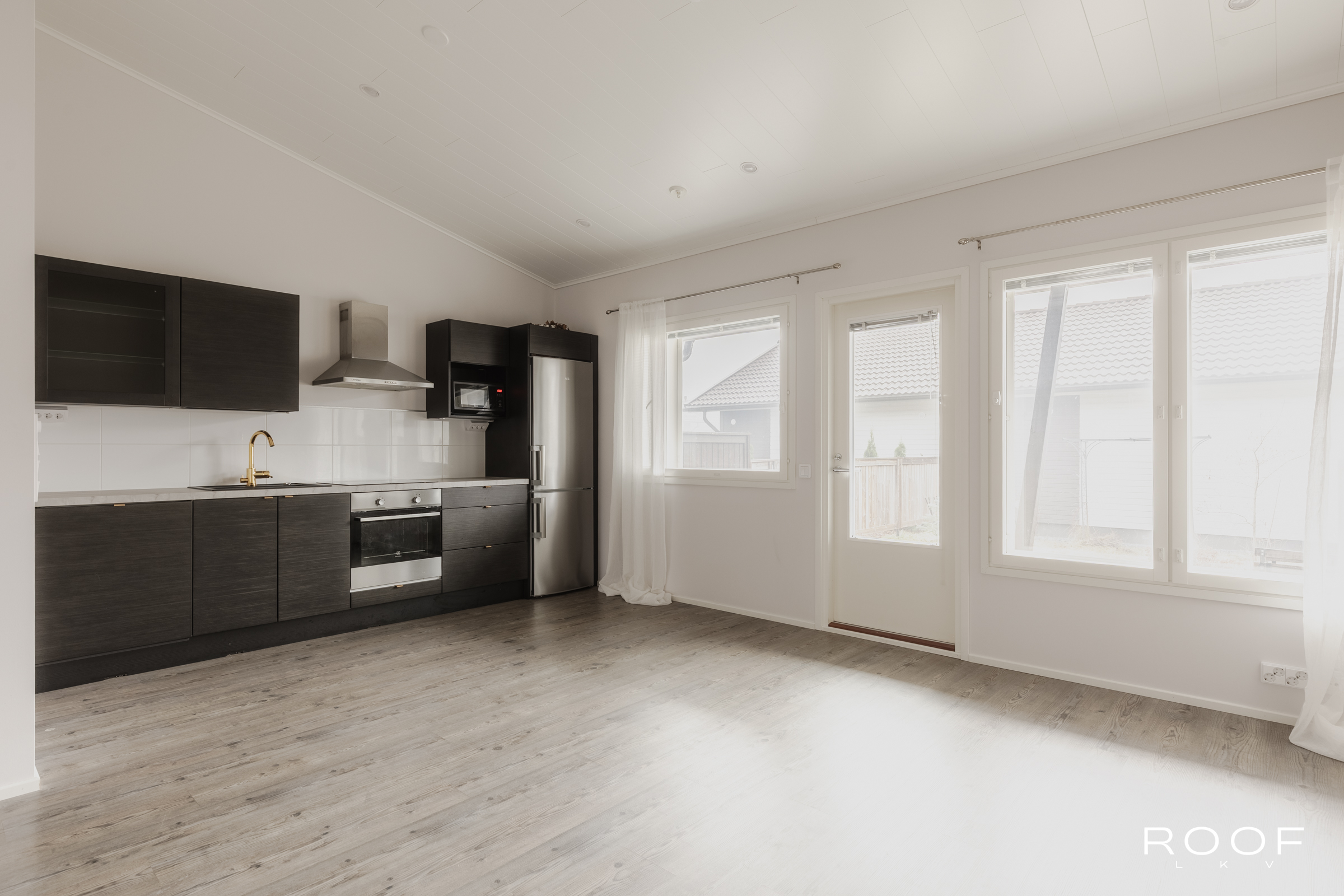 Kaikki on suunniteltu fiksusti ja viihtyisästi – avara olohuone ja keittiö muodostavat kodikkaan kokonaisuuden, jossa on helppo viihtyä ja rentoutua.