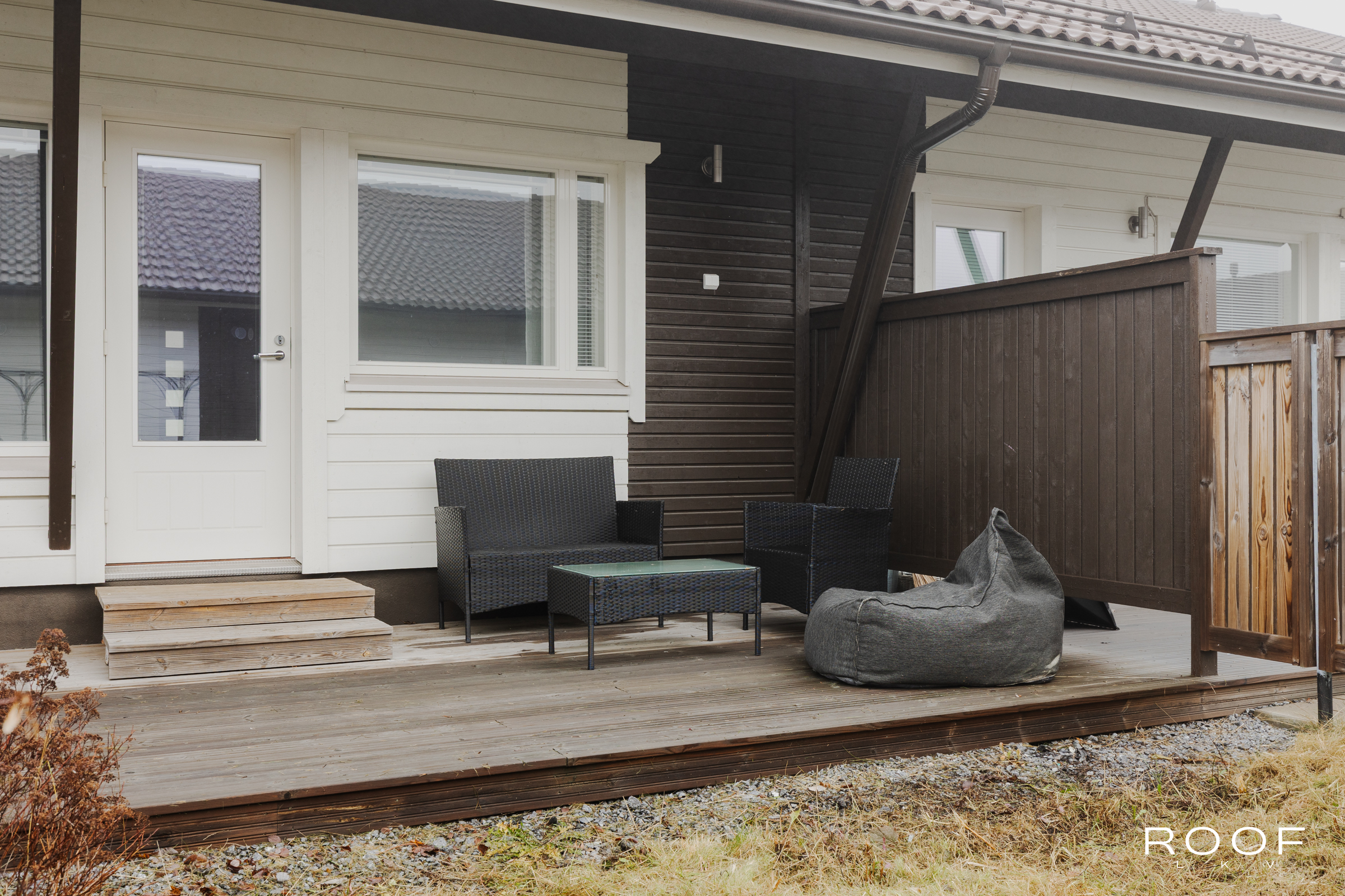Oma aidattu piha ja terassi kutsuvat nauttimaan ulkoilmasta, grillaamaan tai vilvoittelemaan saunan jälkeen – juuri sopiva paikka hengähtää ja nauttia arjen pienistä iloista.