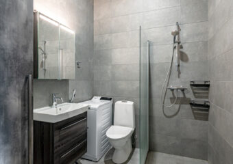 Hyvin varusteltu keittiö tarjoaa kaiken tarvittavan ruoanlaittoon, ja sen moderni ilme sulautuu kauniisti asunnon kokonaisuuteen.