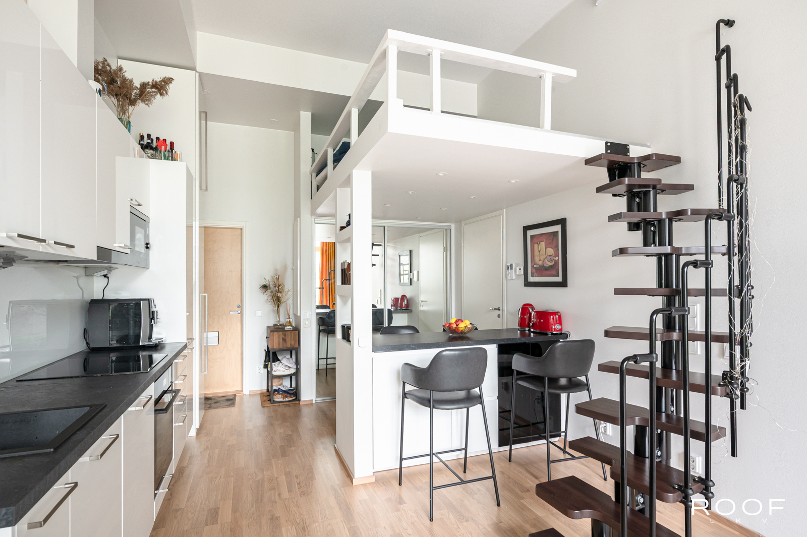 Asunnon avara tila ja korkea huonekorkeus tuovat ilmavuutta ja tilantuntua, jota korostavat tyylikkäät parkettilattiat ja laadukkaat pintamateriaalit. Huoneistoon on rakennettu kaksi parvea, jotka tarjoavat lisää säilytys- ja oleskelutilaa erinomainen ratkaisu esimerkiksi nukkumaparviksi.