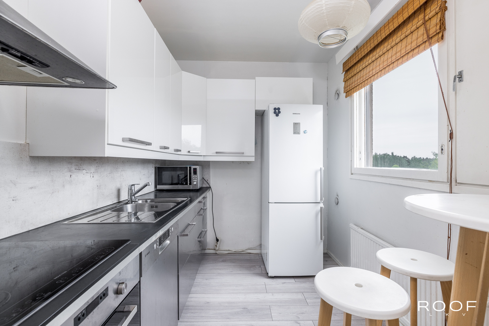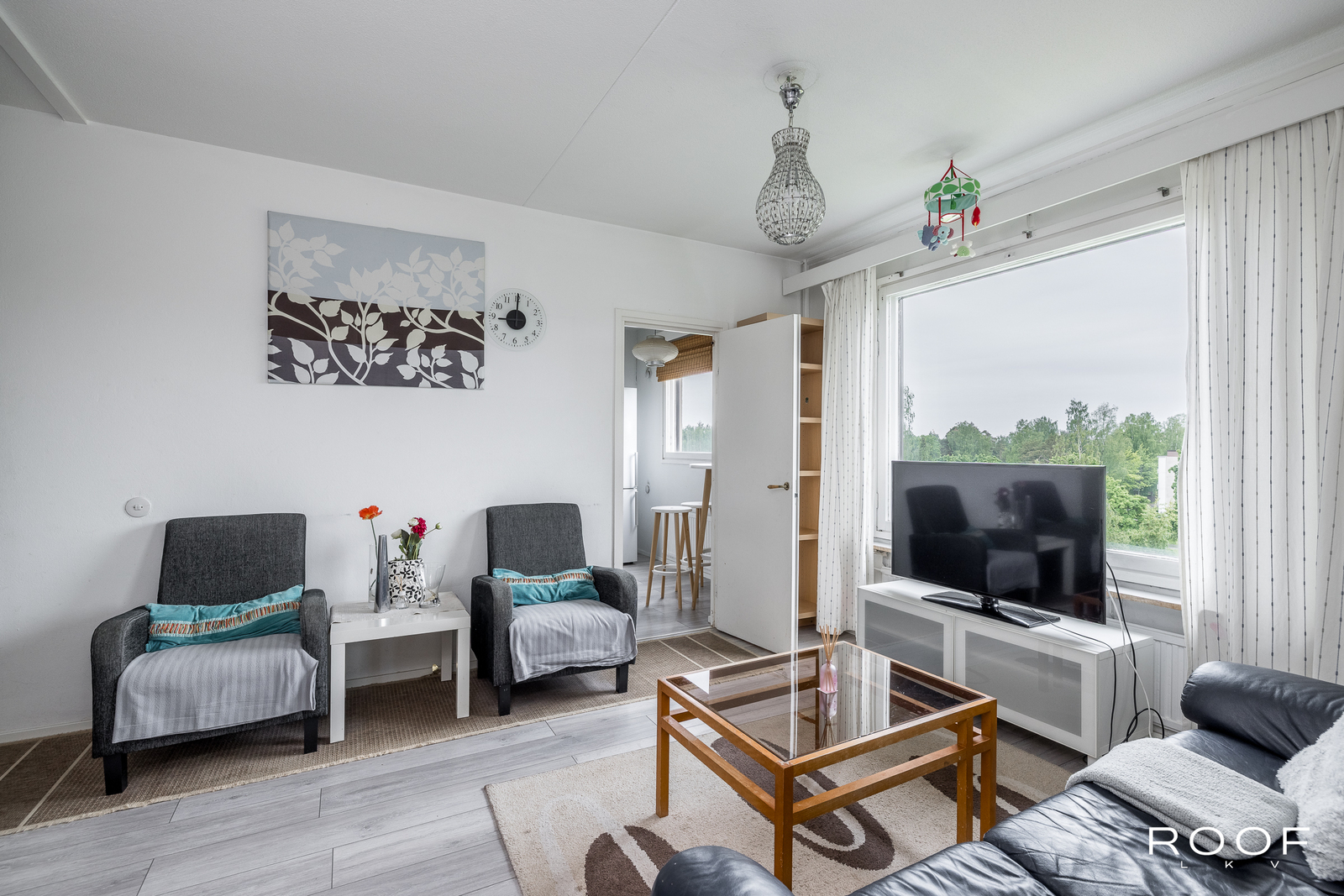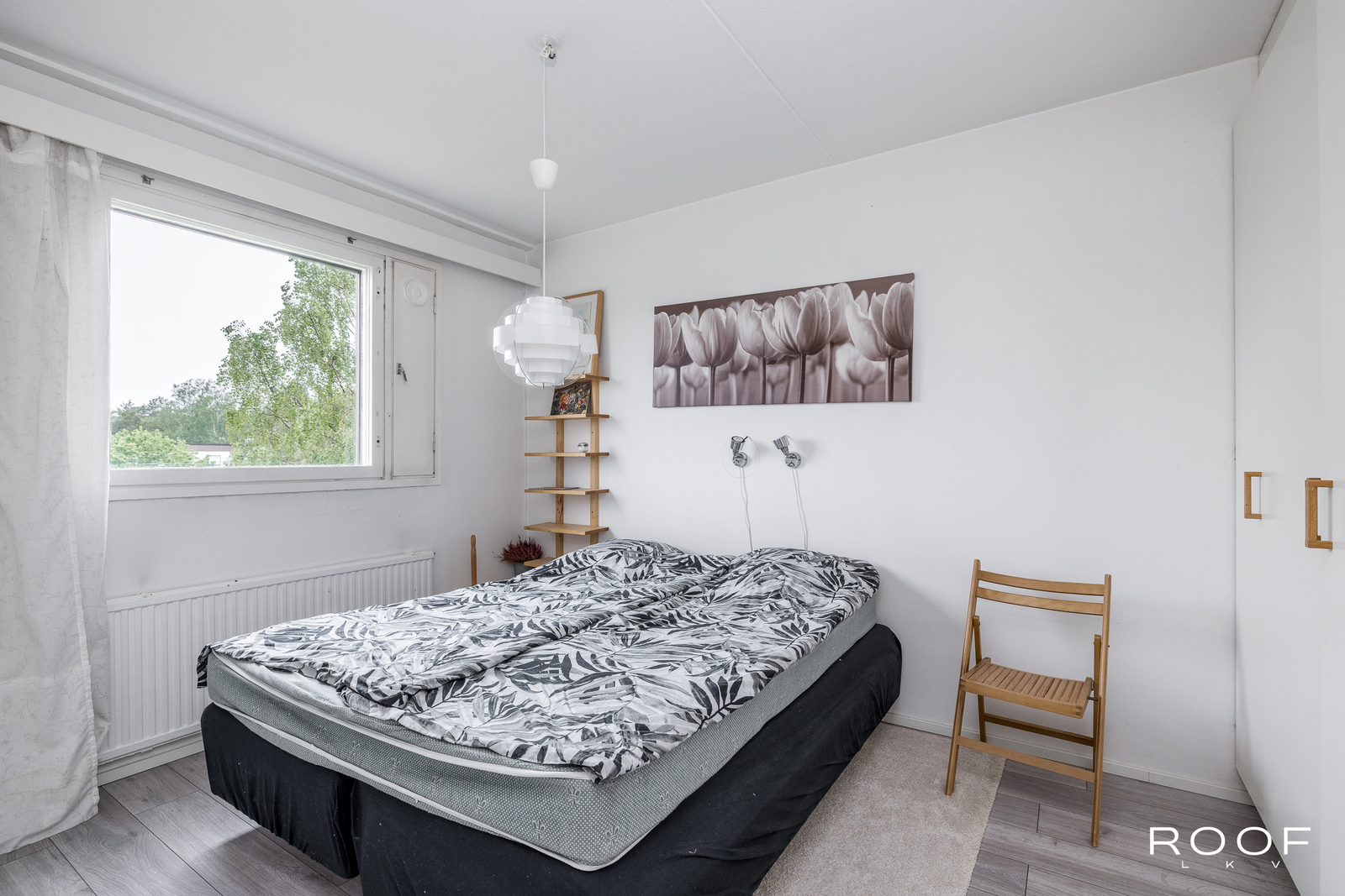 Tässä kaksiossa on järkevä pohja, jonka ansiosta asunto soveltuu hyvin niin yksin asuvalle, kun pariskunnallekin. Makuuhuoneeseen saat hyvin mahtumaan parisängyn ja koko seinän leveydeltä löytyy kaappitilaa. Vaatehuone on rakennettu olohuonetilaan, joten säilytystilaa on hyvinkin runsaasti. Asunnosta aukeaa näyttävät maisemat.