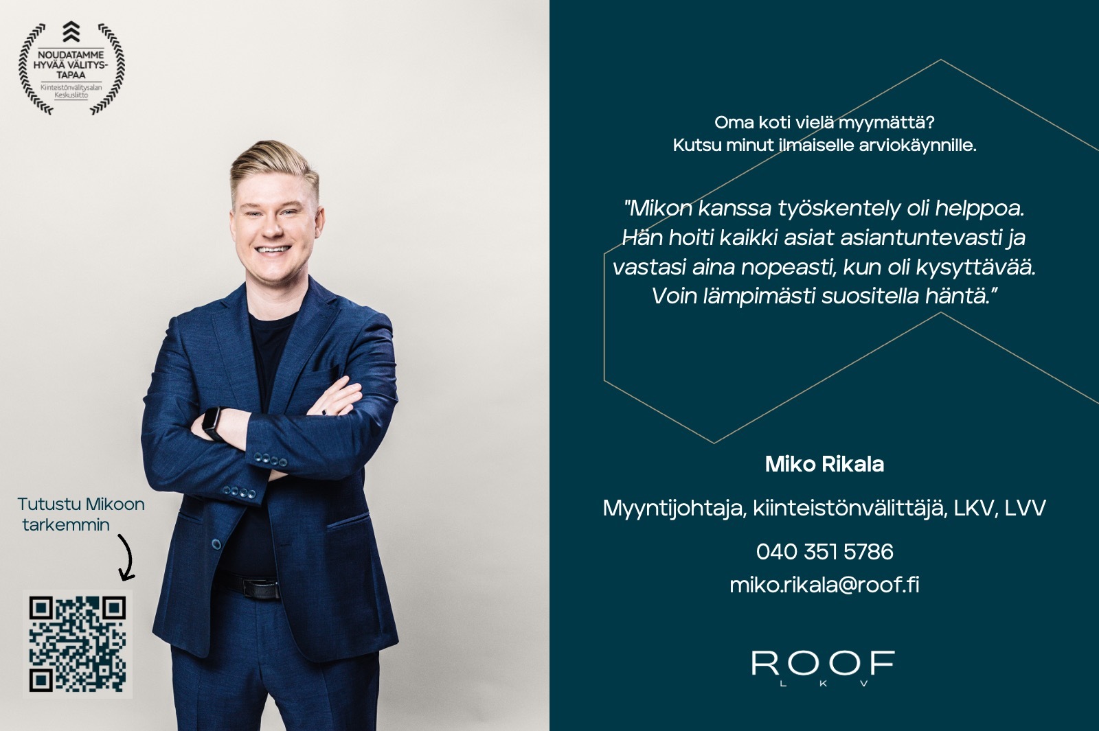 Miko Rikala, Myyntijohtaja, LKV, LVV, KiLAT, 040 351 5786 tai miko.rikala@roof.fi