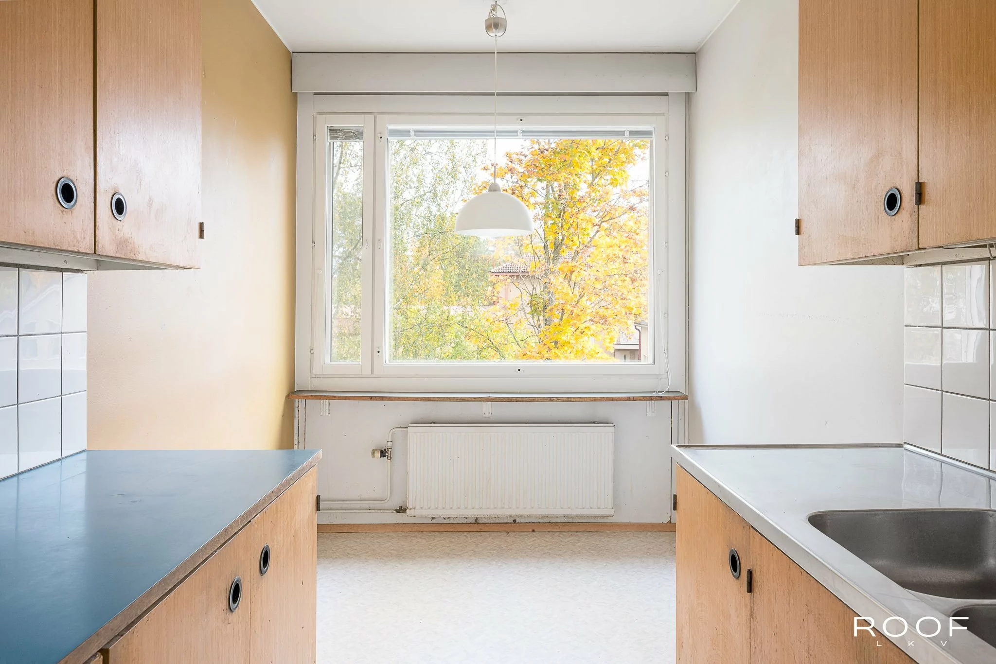 Tässä ensimmäisen kerroksen (ei katutasossa) on tilava ja valoisa olohuone, erillinen makuuhuone sekä lasitettu parveke. Asunto on alkuperäiskuntoinen ja remontoitava. Tässä on erinomainen mahdollisuus luoda juuri omannäköinen koti viihtyisällä alueella.
