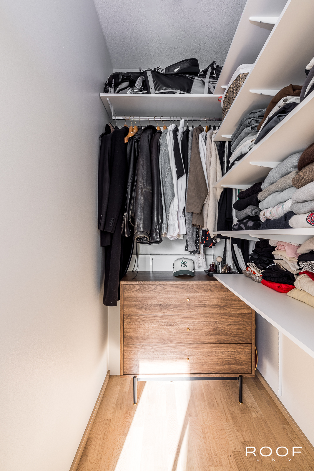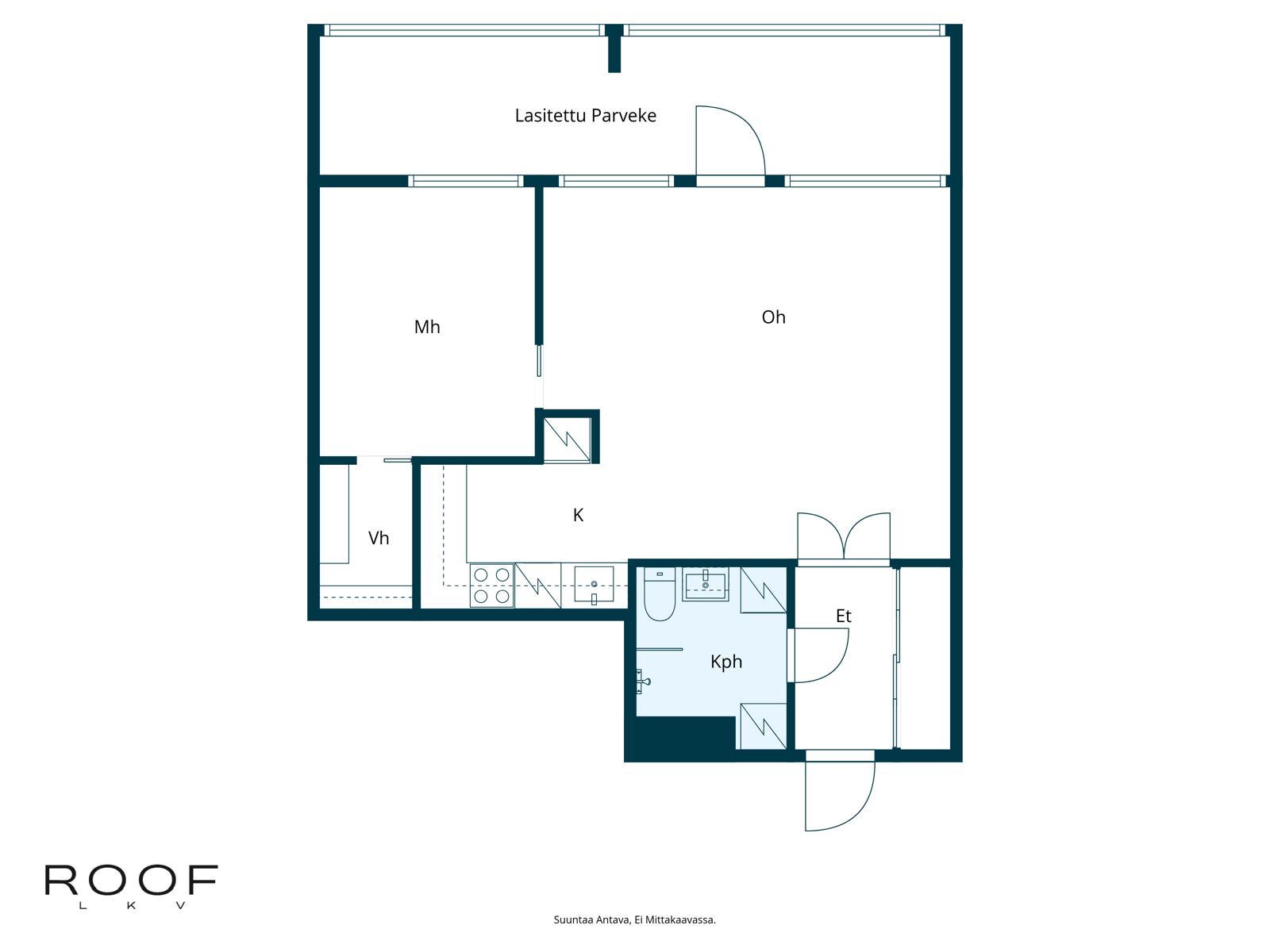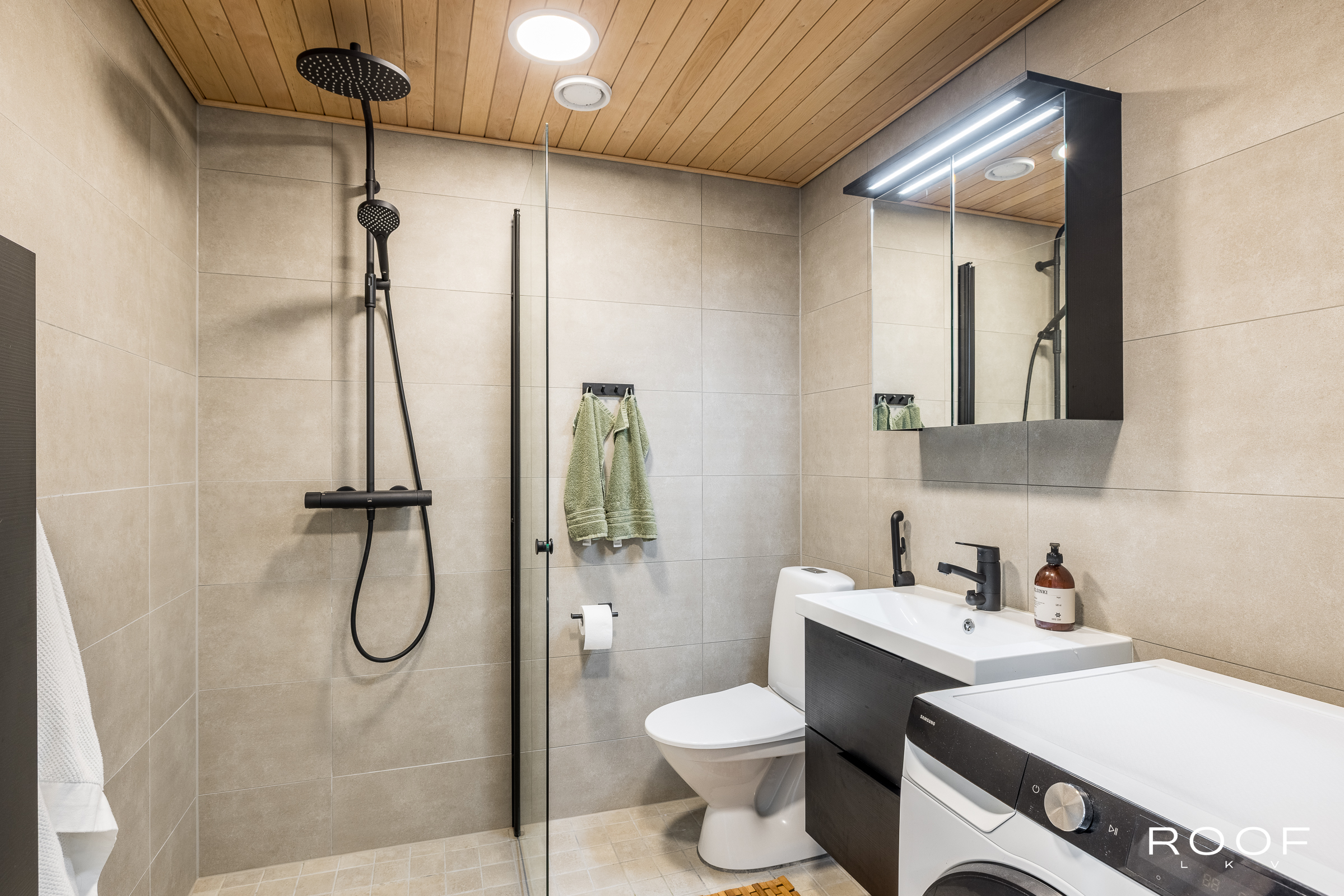 Selkeä pohjaratkaisu tekee arjesta sujuvaa: tilava makuuhuone kätkee sisäänsä oman vaatehuoneen, ja olohuone sekä keittiö muodostavat yhtenäisen, valoisan tilan. Ilmalämpöpumpun ansiosta sisäilma pysyy miellyttävänä myös helteisinä päivinä, ja vesikiertoinen lattialämmitys mahdollistaa vapaan kalustamisen ilman näkyviä pattereita.