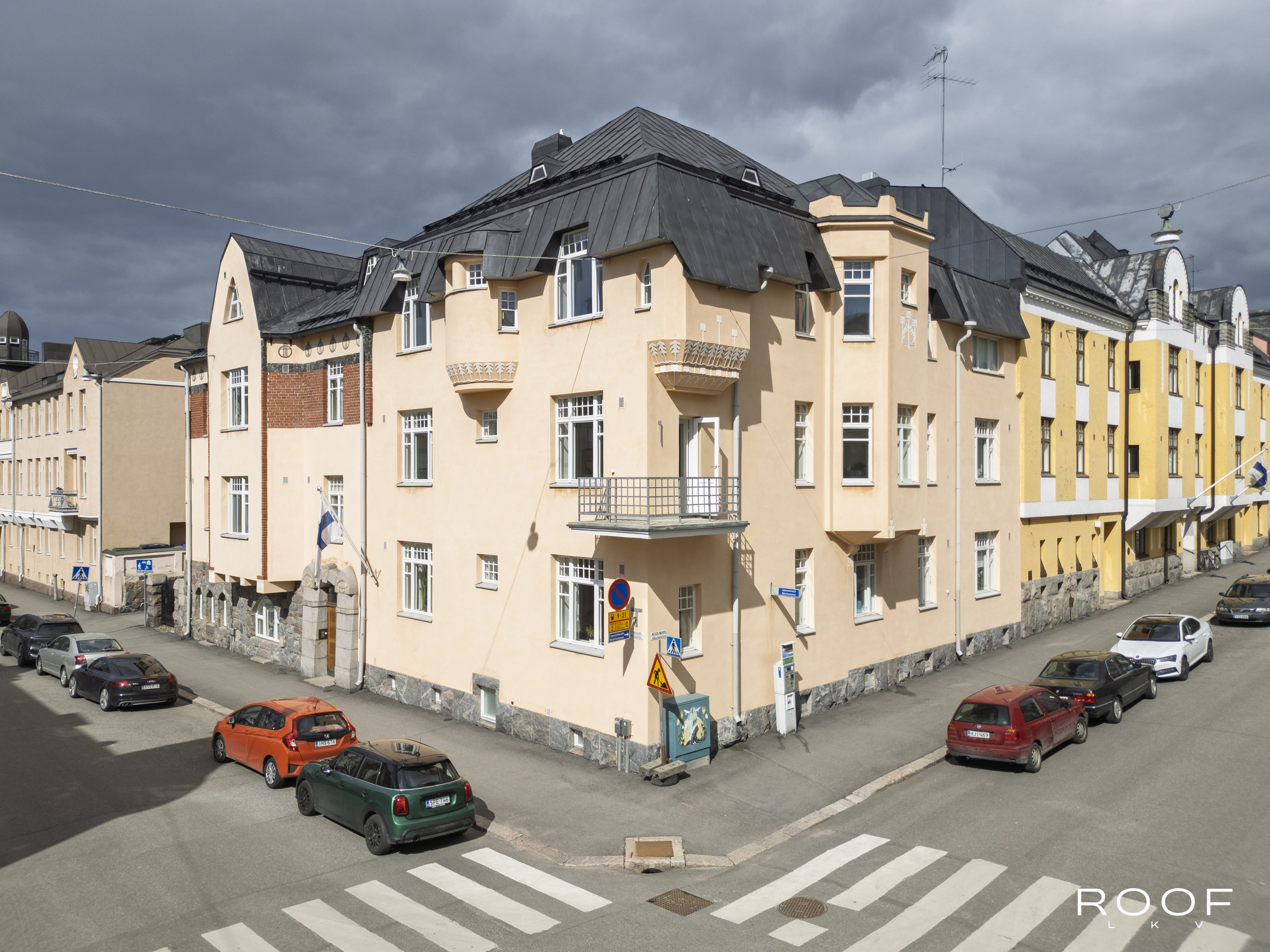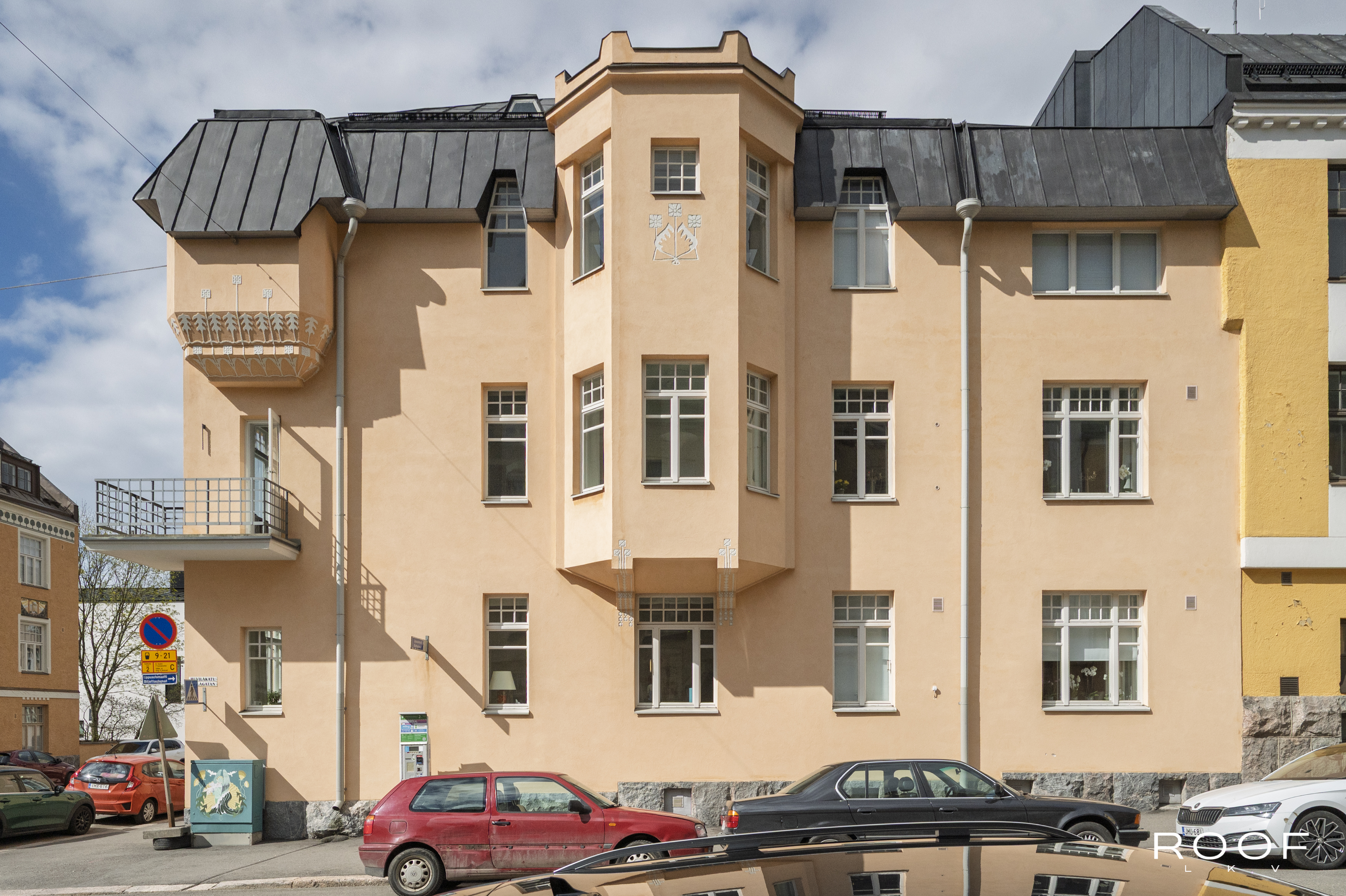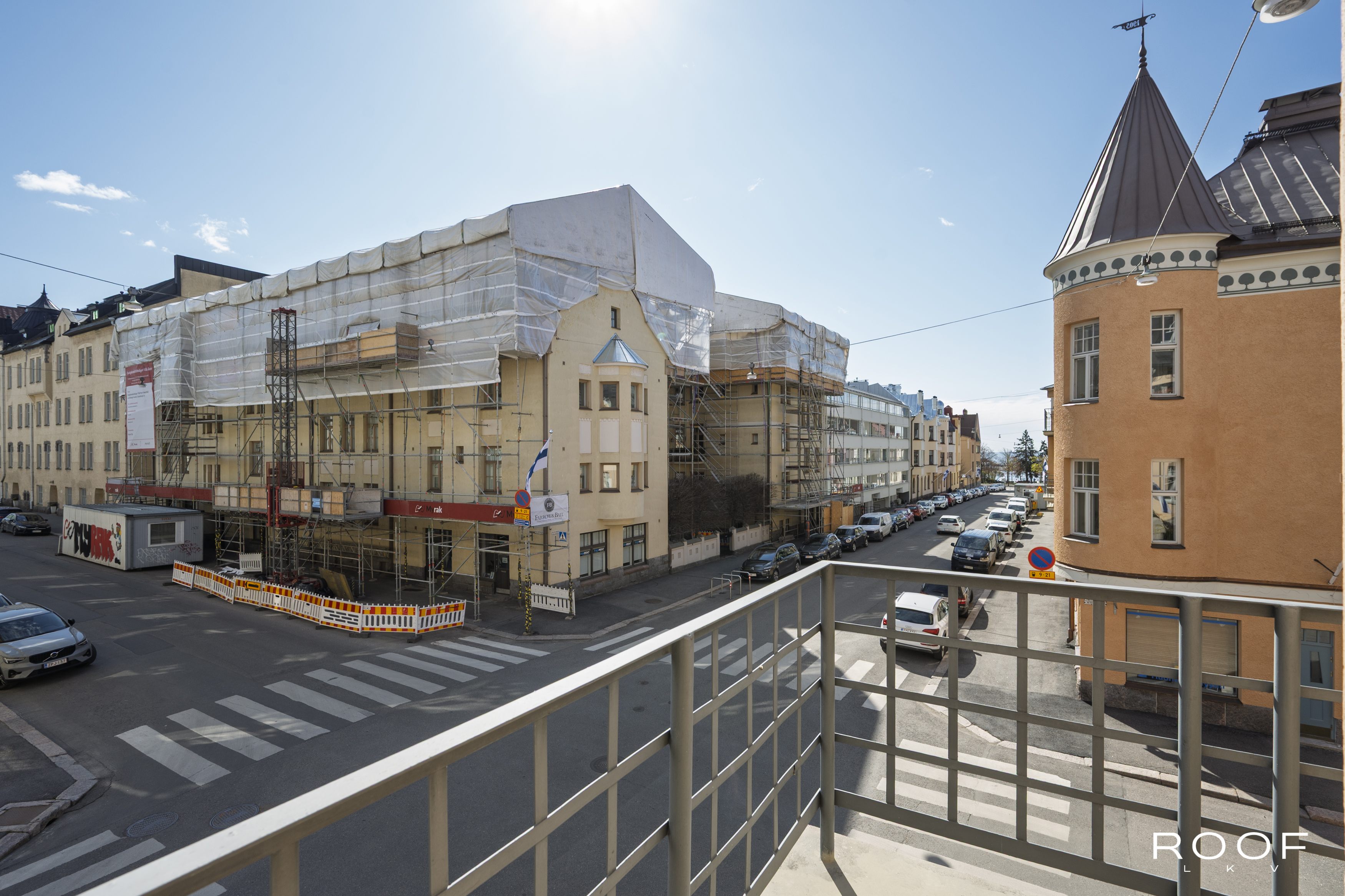 Asunnon eteisessä on hyvin naulakkotilaa. Eteisestä on käynti kylpyhuoneeseen, jossa on amme sekä paikka pesukoneelle. Eteisestä pääsee myös erilliseen wc:hen. Makuuhuone on tilava ja siellä on paljon kaappitilaa säilytykseen. Olohuone on avara ja valoisa. Ikkunoista avautuu hienot näkymät Pietarinkadulle ja Huvilakadulle. Olohuoneesta pääsee parvekkeelle, joka on talon ainoa. Keittiössä on kaikki tarvittava ruuanlaittoon ja säilytykseen. Keittiön ohessa on ruokailutila, jossa aiemmin mainittu erkkeri. Tässä asunnossa voit nauttia kaupunkiasumisesta parhaimmillaan.