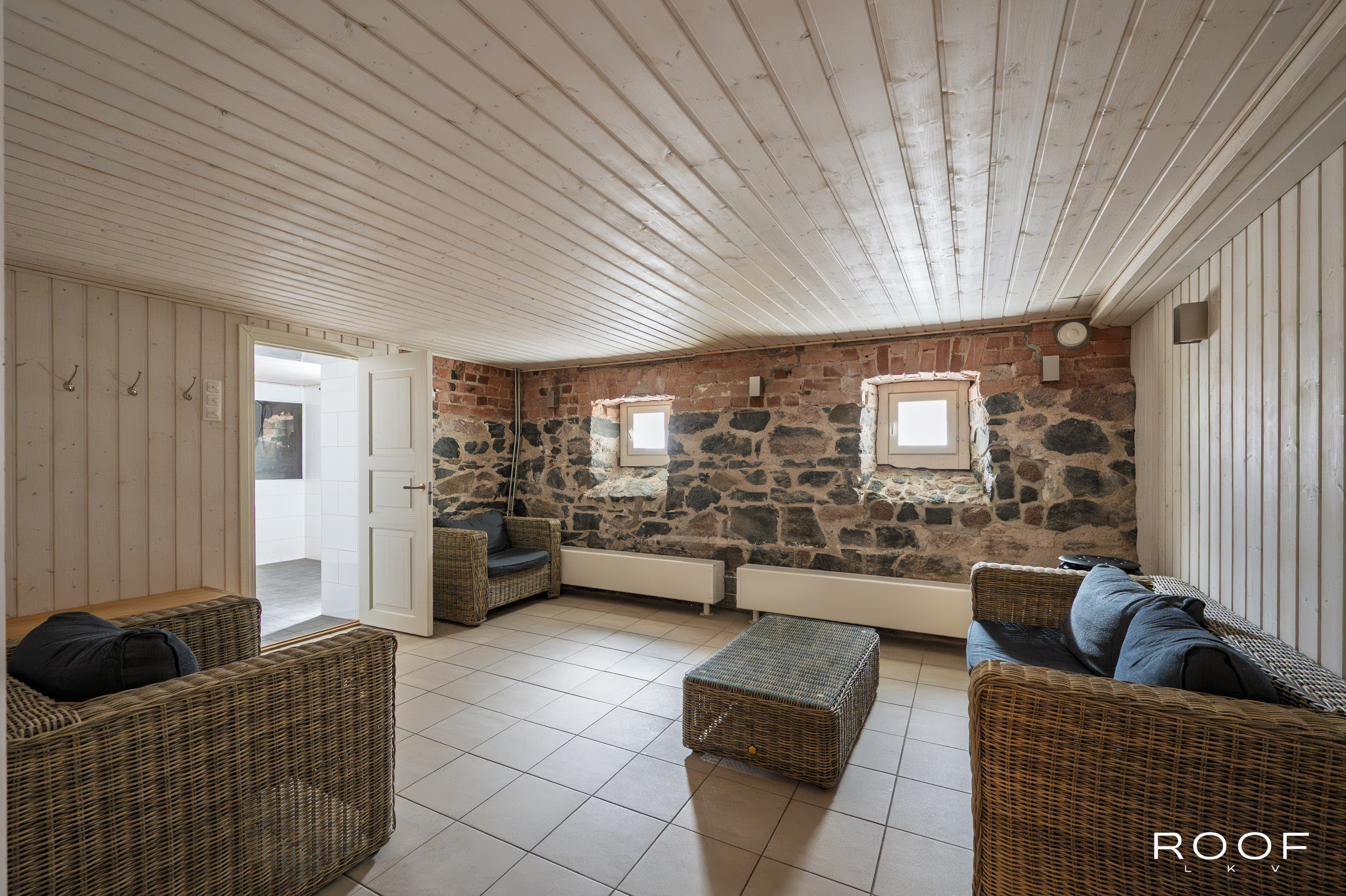 saunan IV-järjestelmän korjaus, seinänvierustan vedeneristys ja salaojitus, portaiden kivimuurin ja kukkapenkin kunnostus, saunaosaston saneeraus