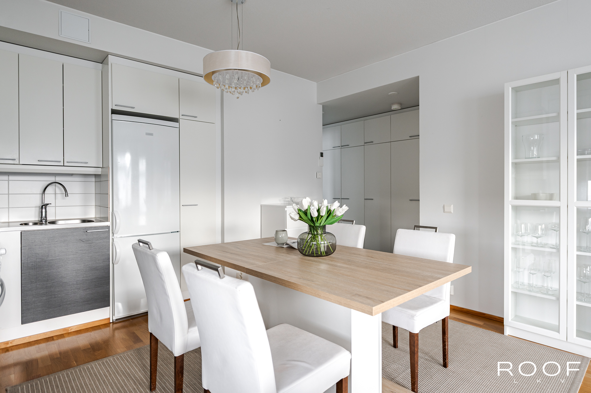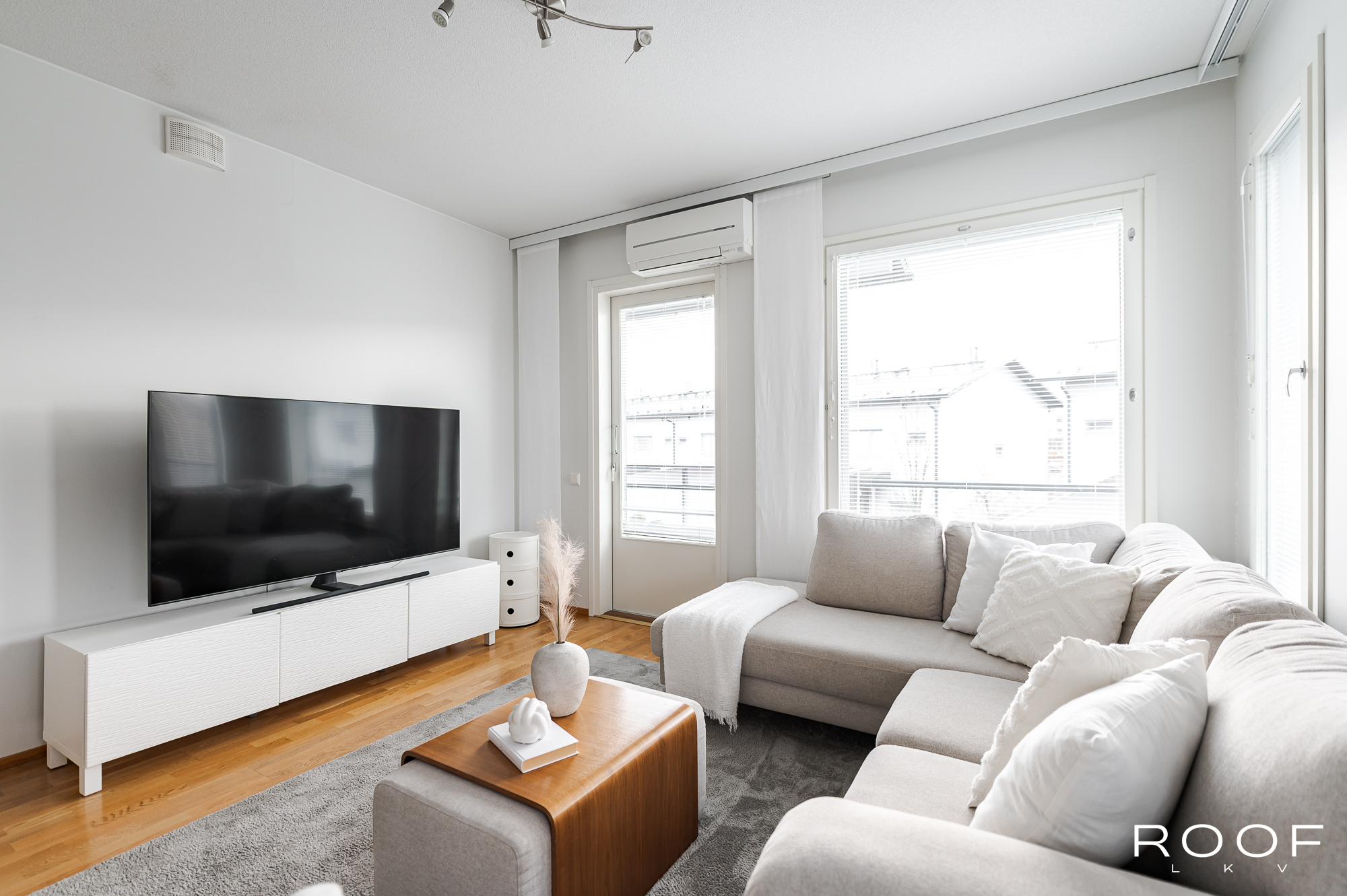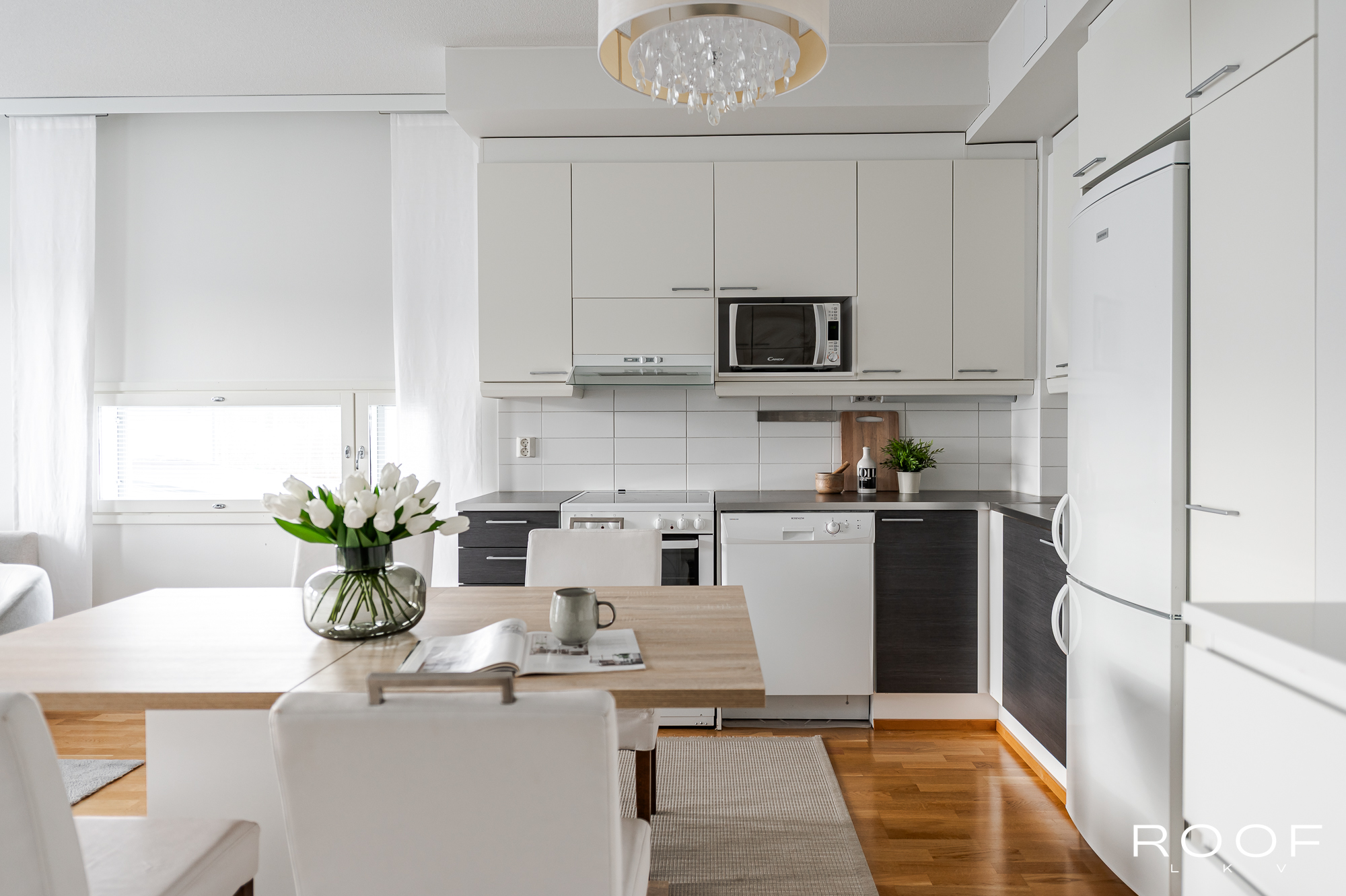 Tässä kodissa on tyyliä. Avara ja valoisa keittiön ja olohuoneen yhdistelmä tarjoavaa viihtyisät puitteet yhdessäoloon. Kulmahuoneistoon tulvii ihanasti valoa kahdesta suunnasta. Makuuhuone on tilava ja liukuovikaapistoon mahtuu hyvin kaikki tarpeellinen.