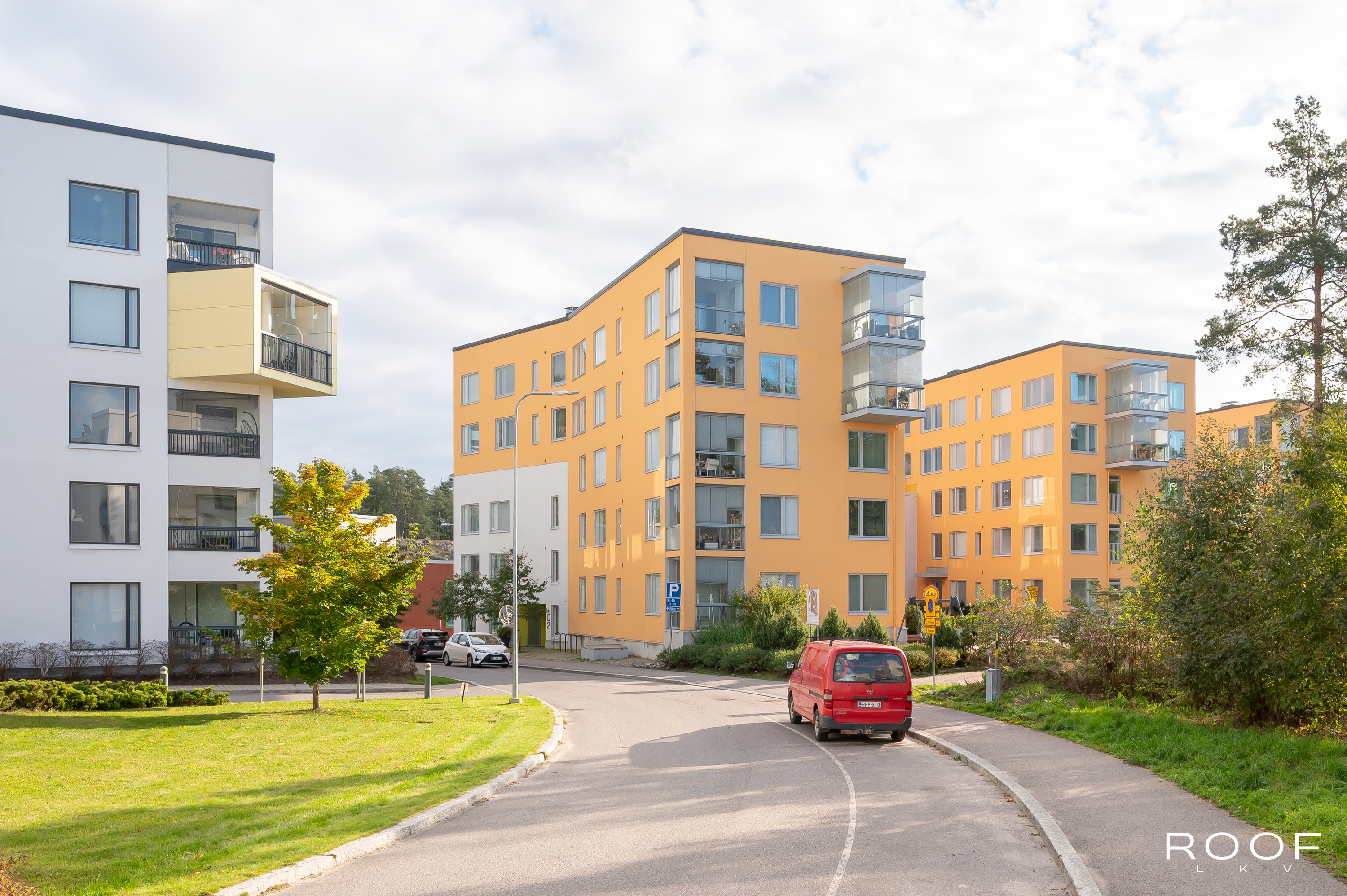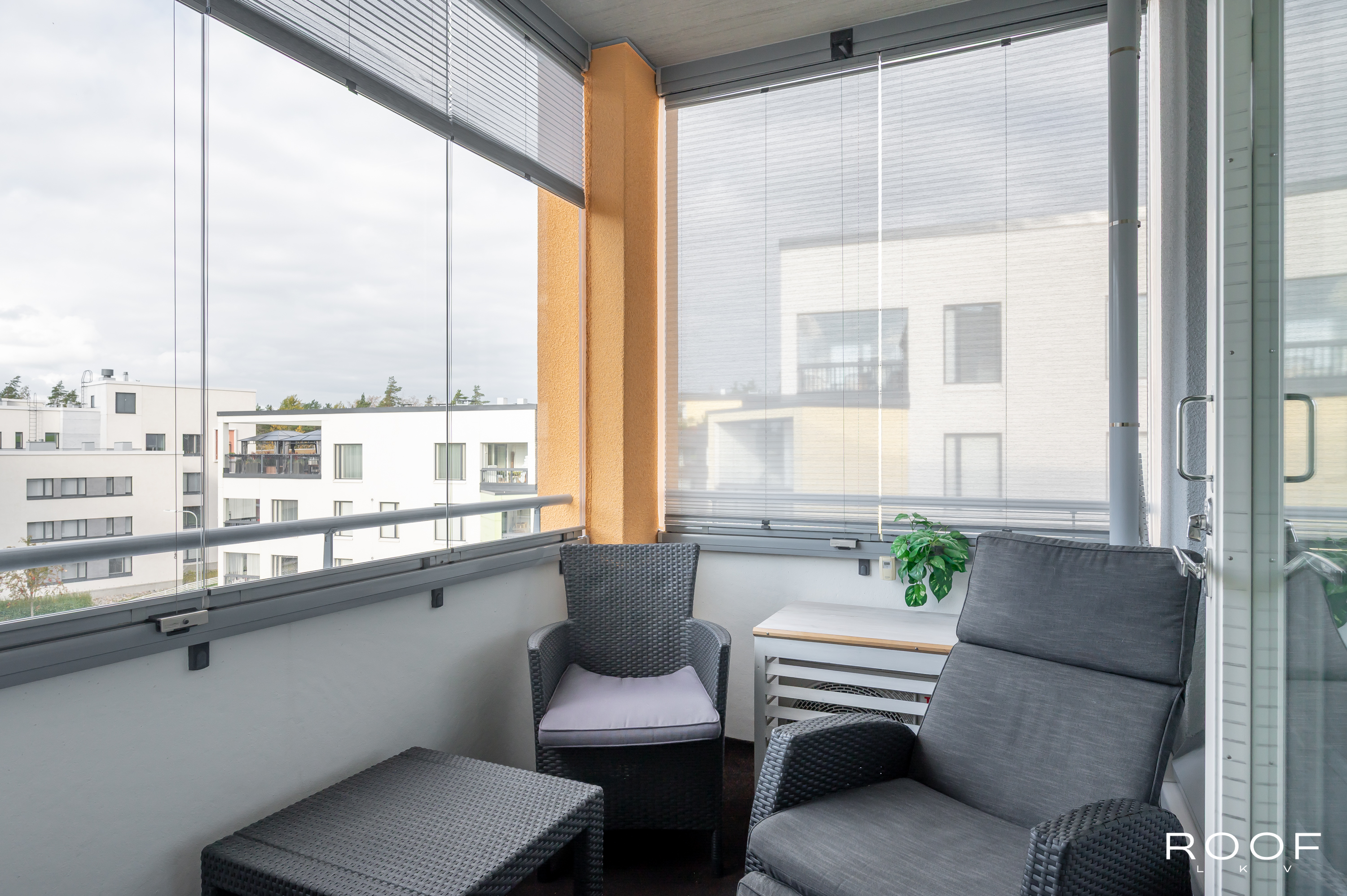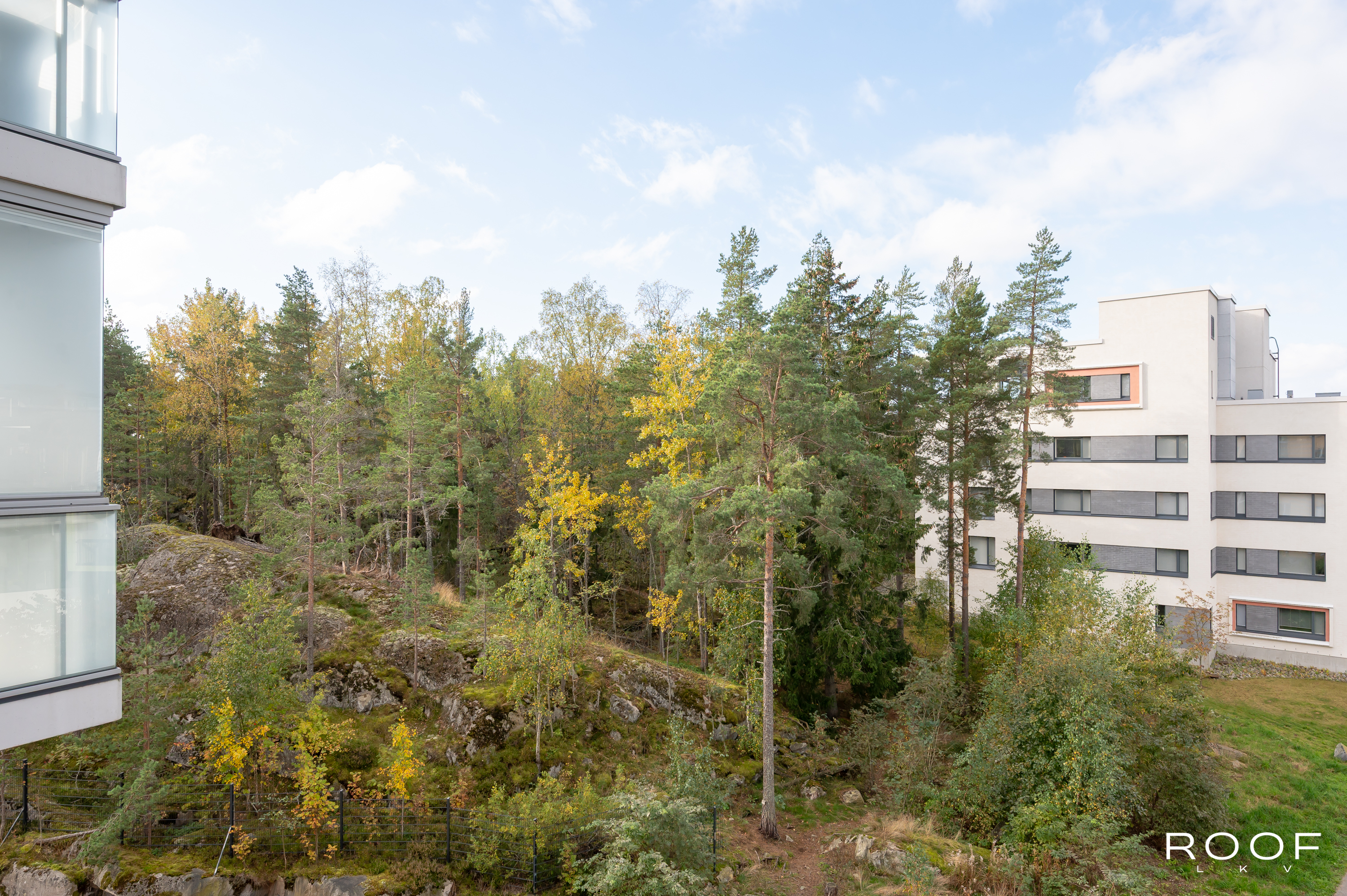 Lasitettu parveke olohuoneen ja ruokailutilan jatkeena palvelee aina kesästä myöhäiseen syksyyn tuoden viihtyisän ja rentouttavan lisähuoneen hienoin näköaloin lähikallioille. Tilavassa kylpyhuoneessa tilaa pesutornille. Asuntoon on asennettu ilmalämpöpumppu.