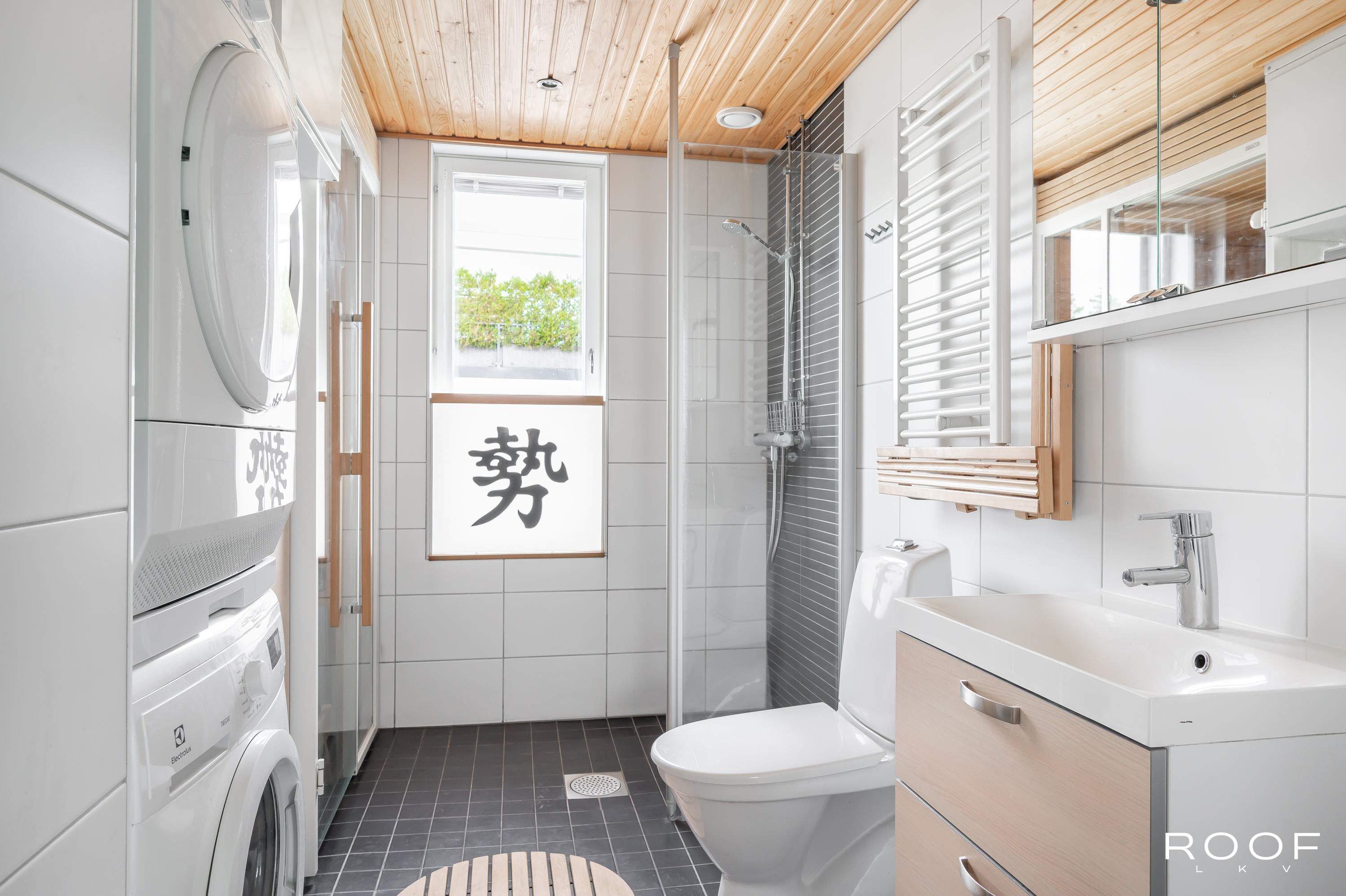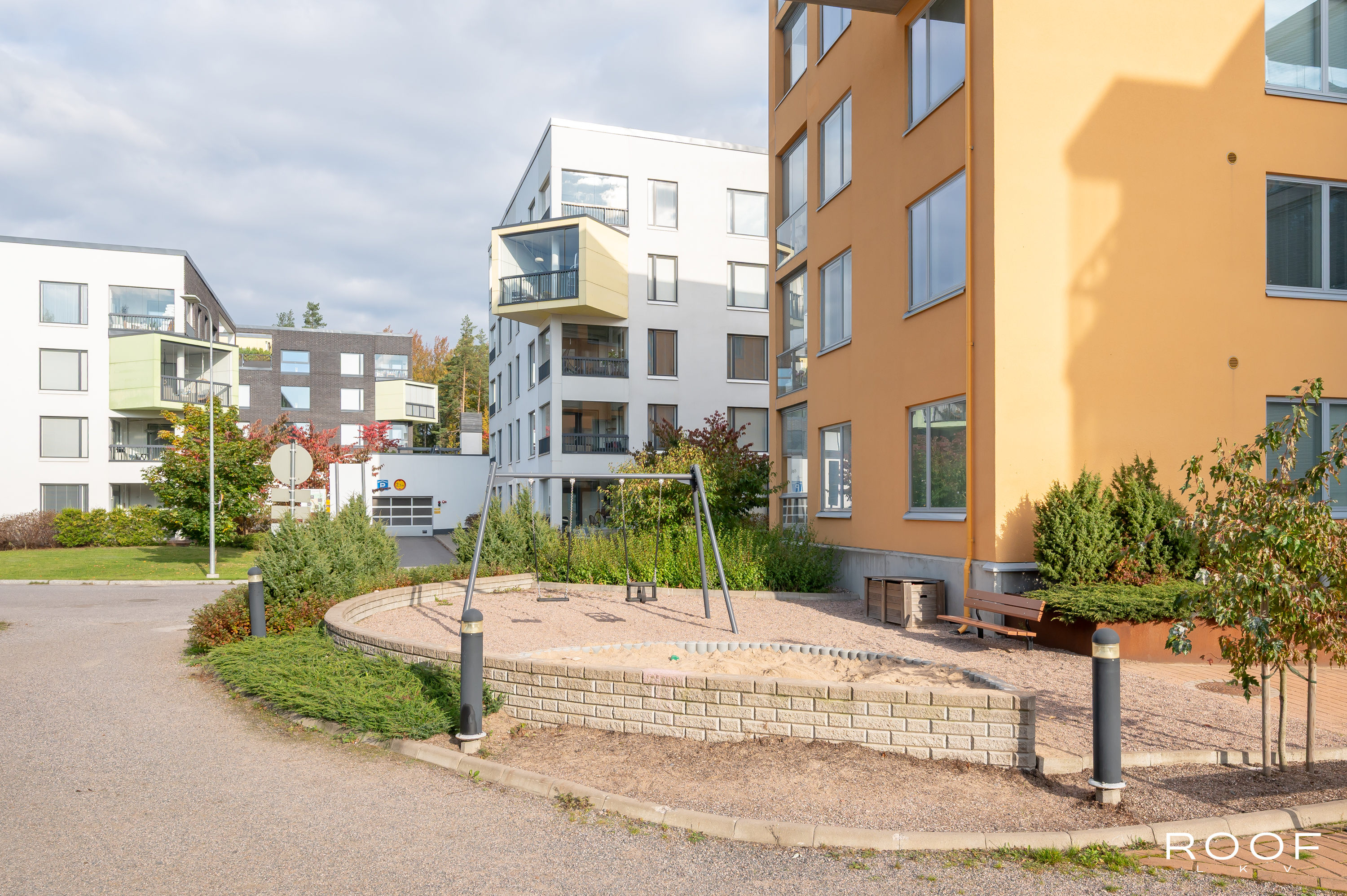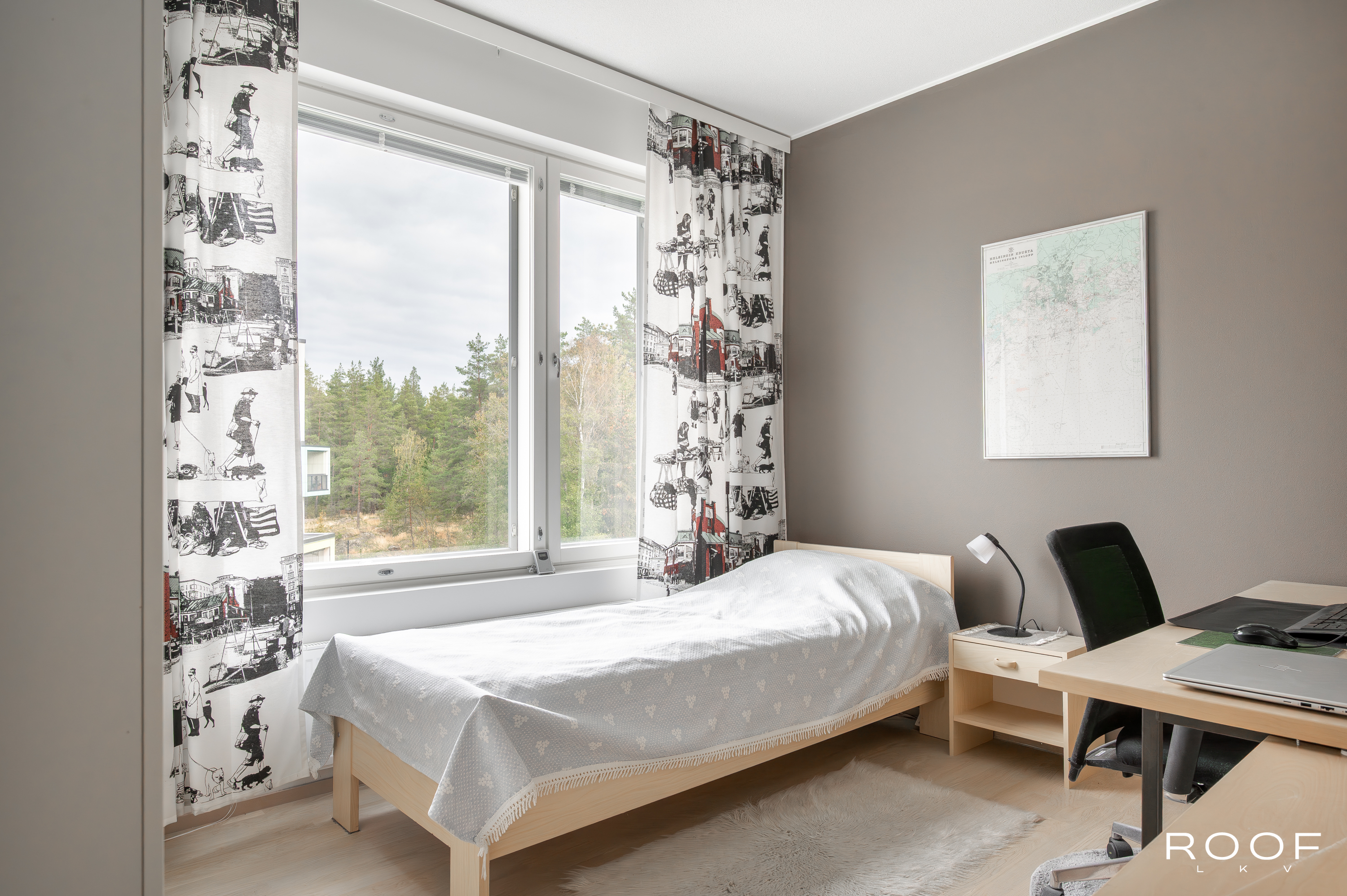 Lasitettu parveke olohuoneen ja ruokailutilan jatkeena palvelee aina kesästä myöhäiseen syksyyn tuoden viihtyisän ja rentouttavan lisähuoneen hienoin näköaloin lähikallioille. Tilavassa kylpyhuoneessa tilaa pesutornille. Asuntoon on asennettu ilmalämpöpumppu.