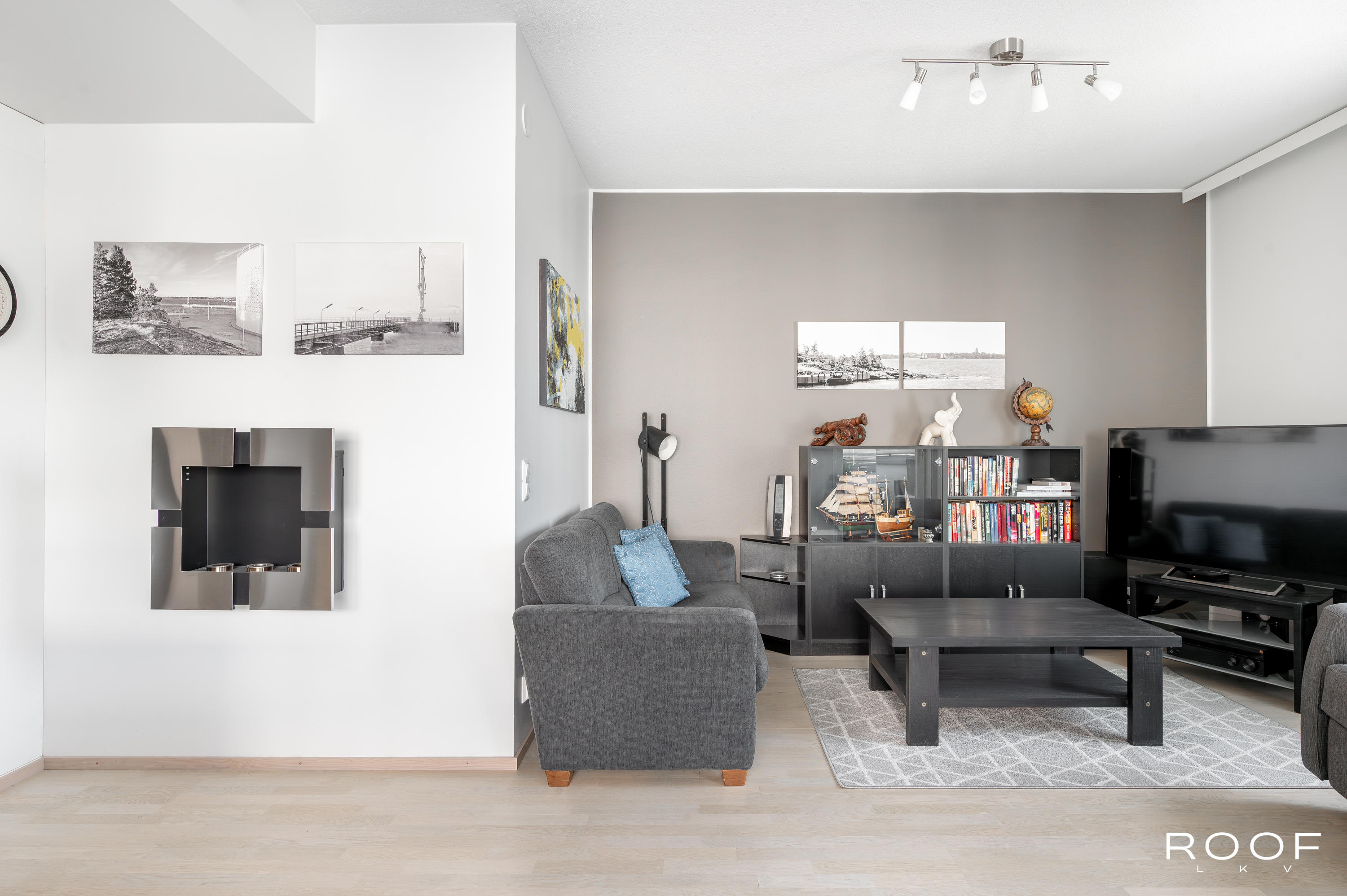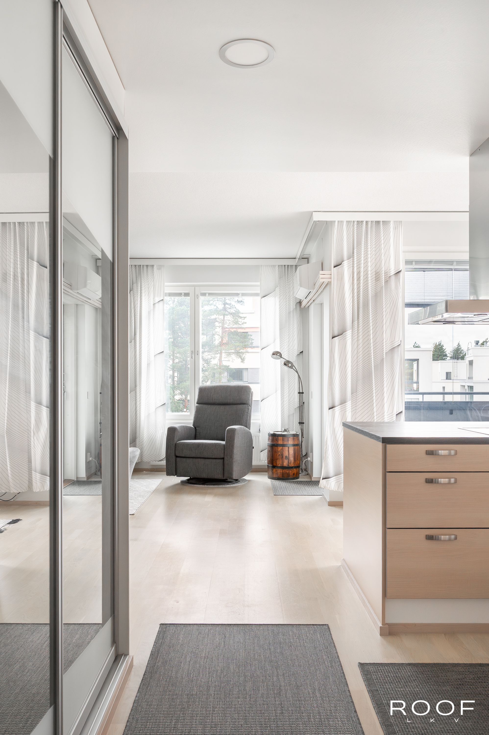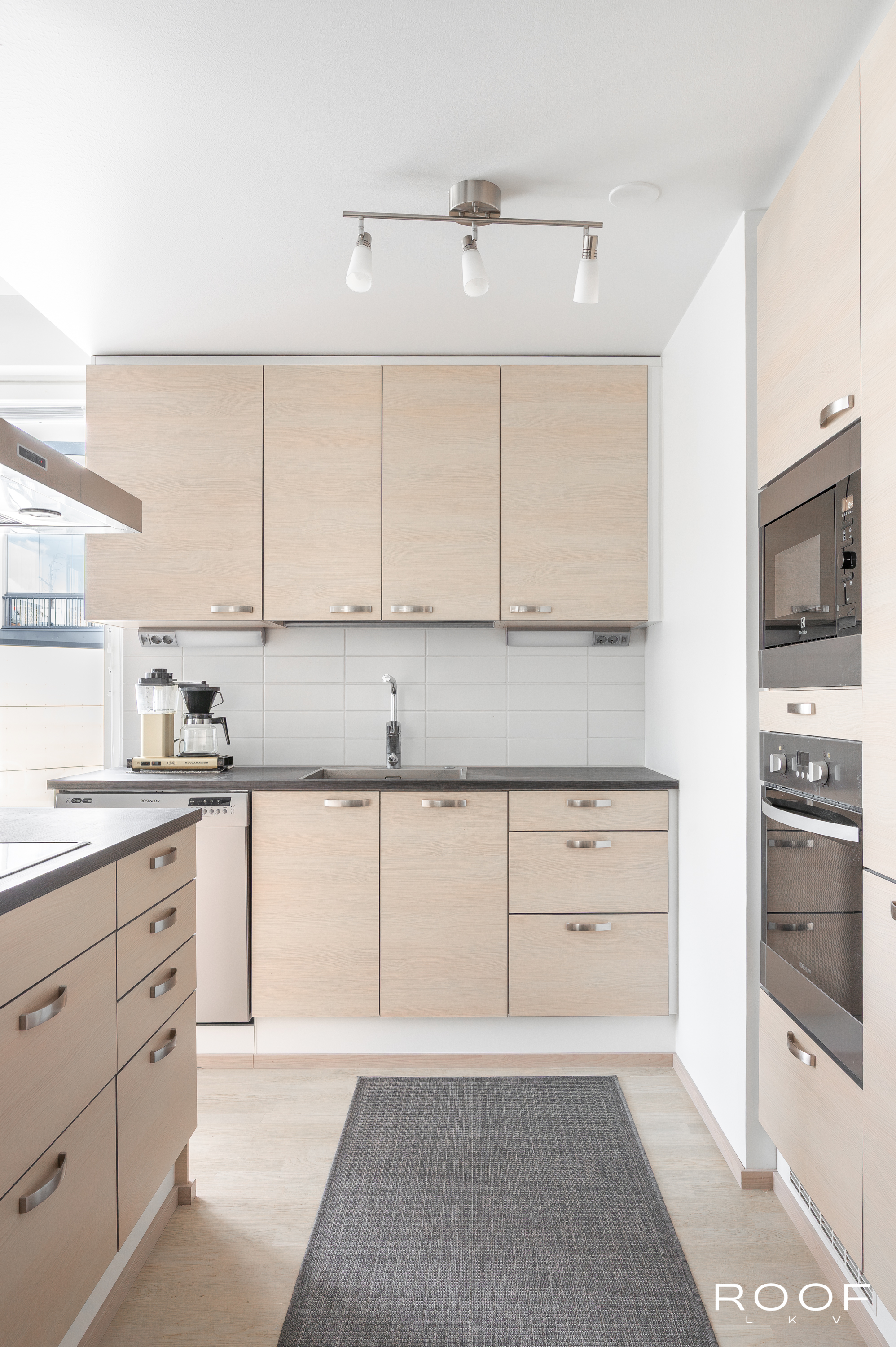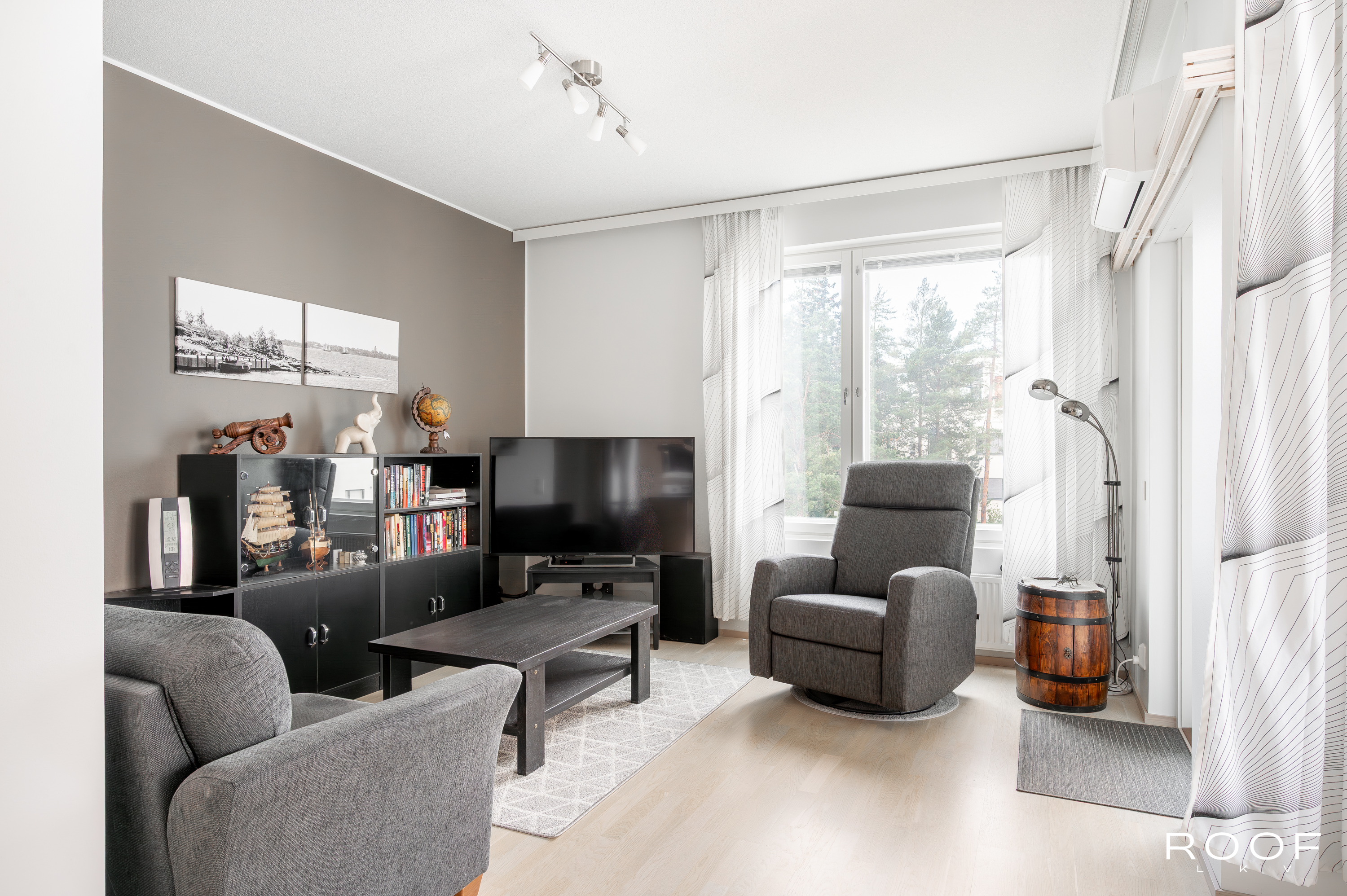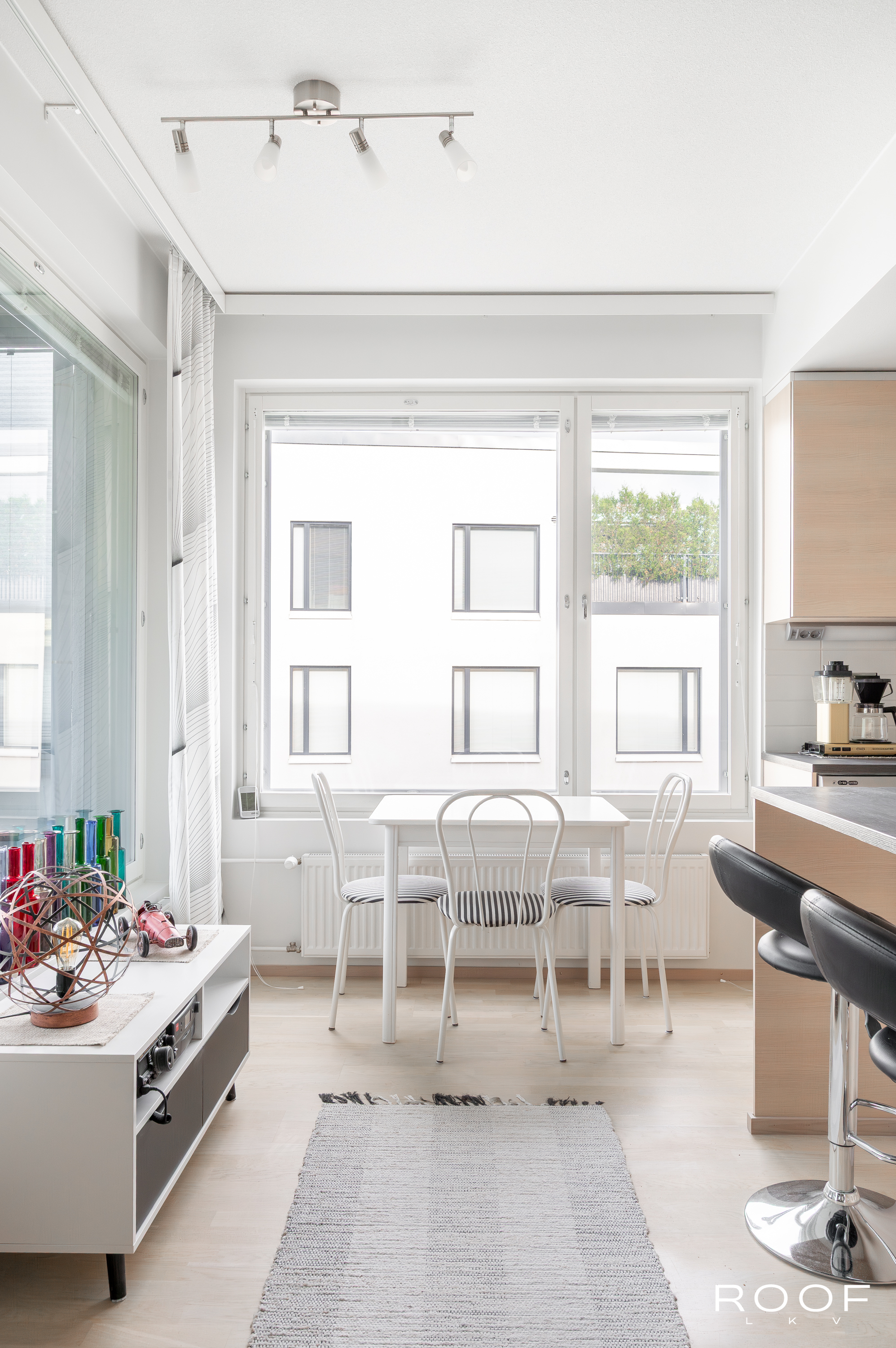 Asumisviihtyvyyden takaavat avara ja valoisa olohuone lähes huoneen levyisine ikkunoineen ja samassa tilassa laadukas keittiö. Keittiössä on mukavasti kaappi-ja laskutiloja saarekkeen ansioista.