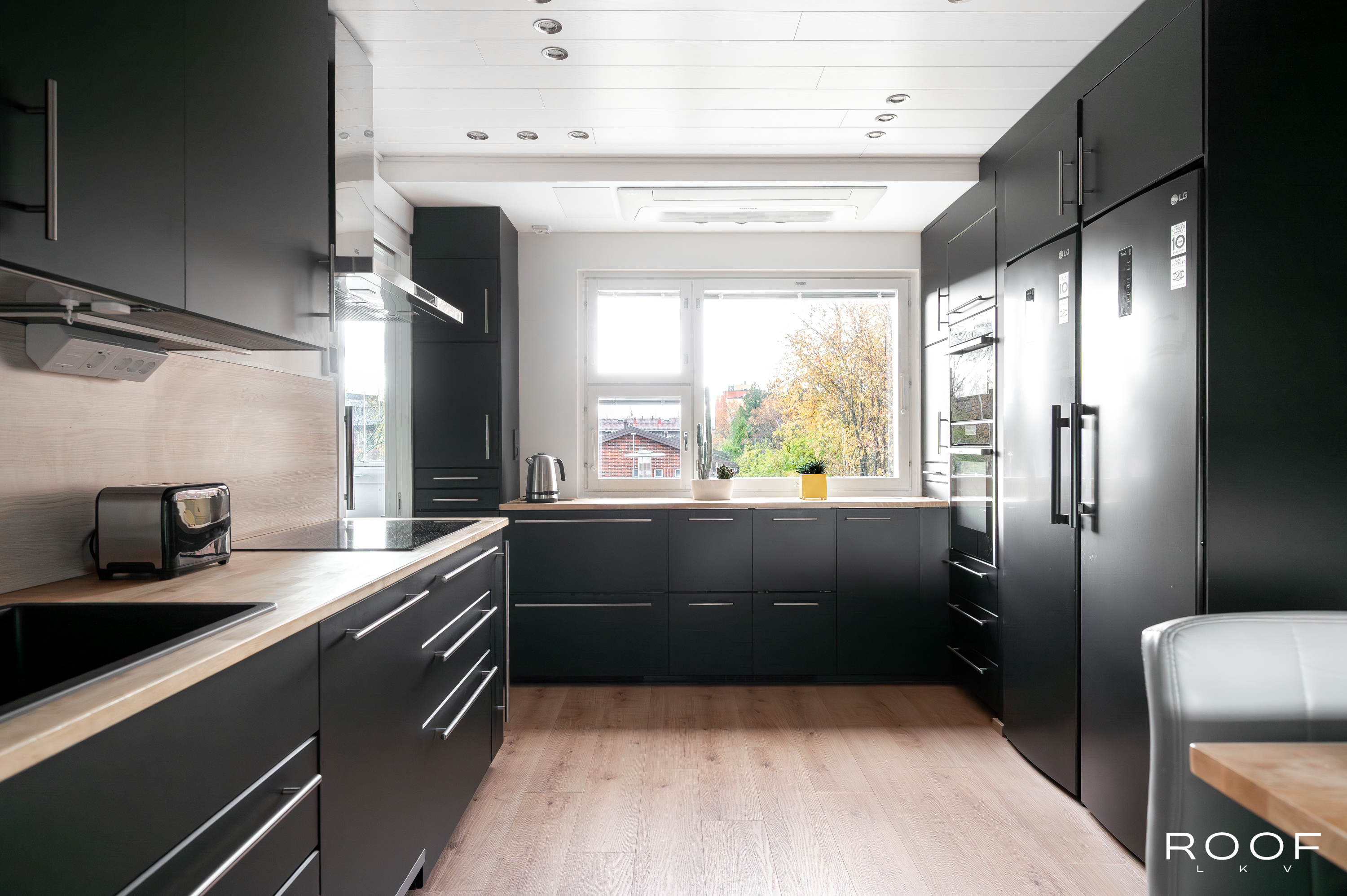 Asuntoon virtaa valoa isojen ikkunoiden ansiosta, jotka aukeavat omalle vehreälle pihalle ja katetulle terassille. Olohuoneen ja avokeittiön kauniit vaaleat puupinnat ja rosteriset kodinkoneet sekä valkoiset kaapistot luovat neutraalin ja pohjoismaisen tyylikkään taustan. Keittiö on varusteltu nykypäivän standardien mukaisesti ja tarjoaa hyvät ruuanlaittopuitteet. Olohuoneeseen sopii hyvin ruokailuryhmä sekä sohvaryhmä. Parkettilattia yhdistää asuntoa. Säilytystilaa on mukavasti makuuhuoneen ja eteisen kaapistojen ansiosta. Nykyaikaiseen tilavaan kylpyhuoneeseen mahtuu pesutorni ja oma ikkunallinen sauna hemmottelee asukkaita.
