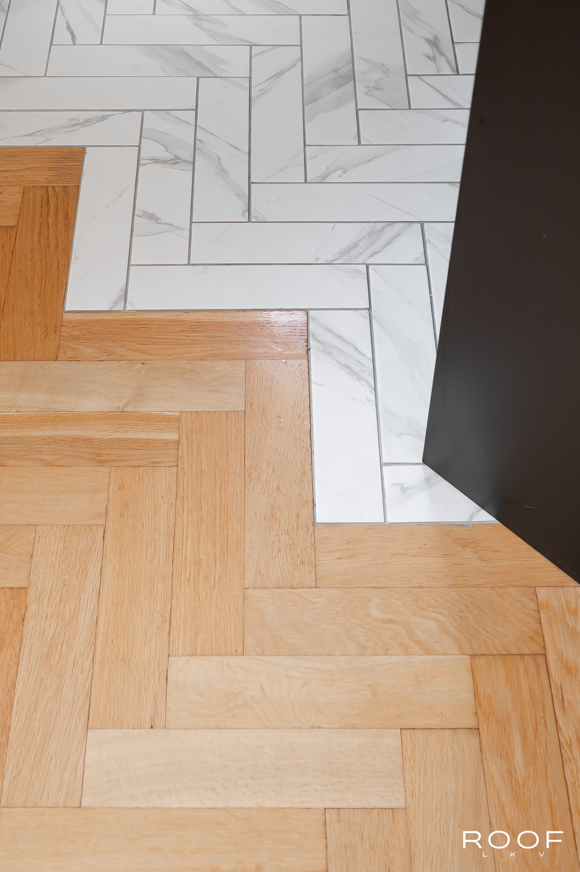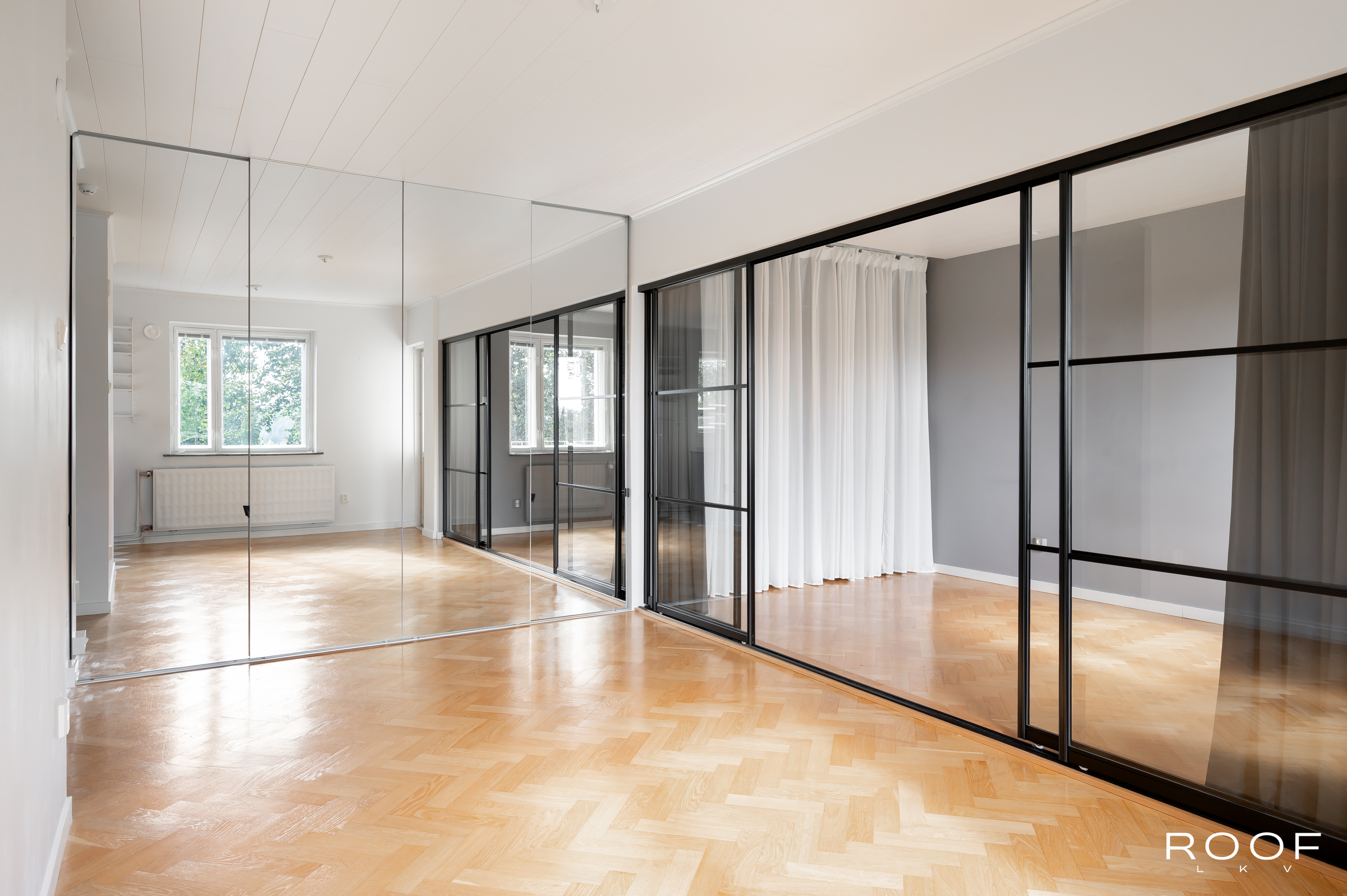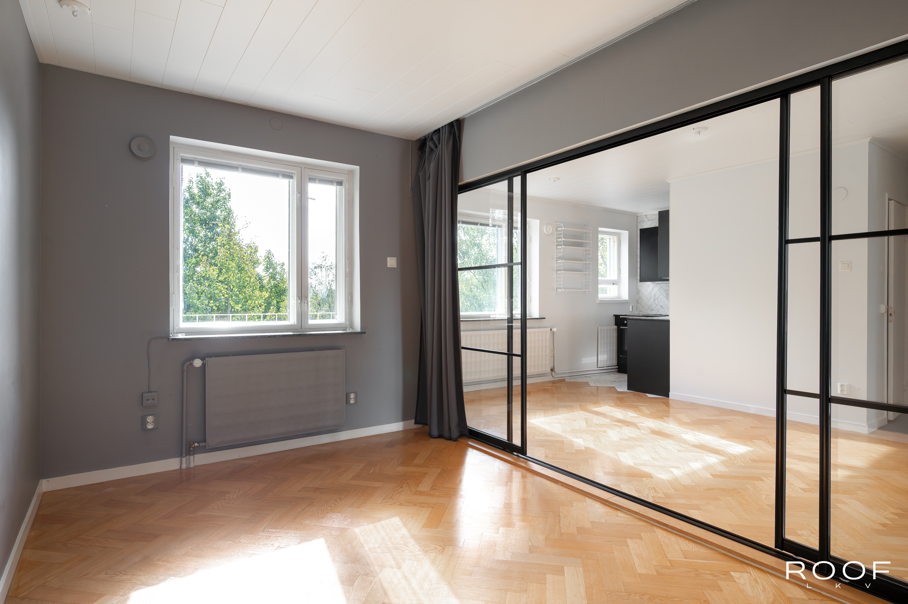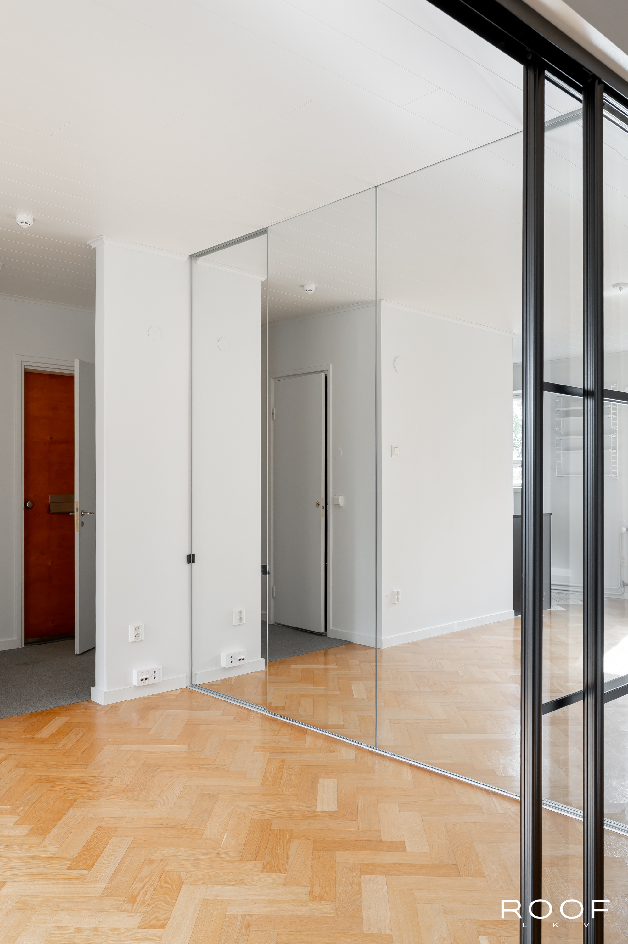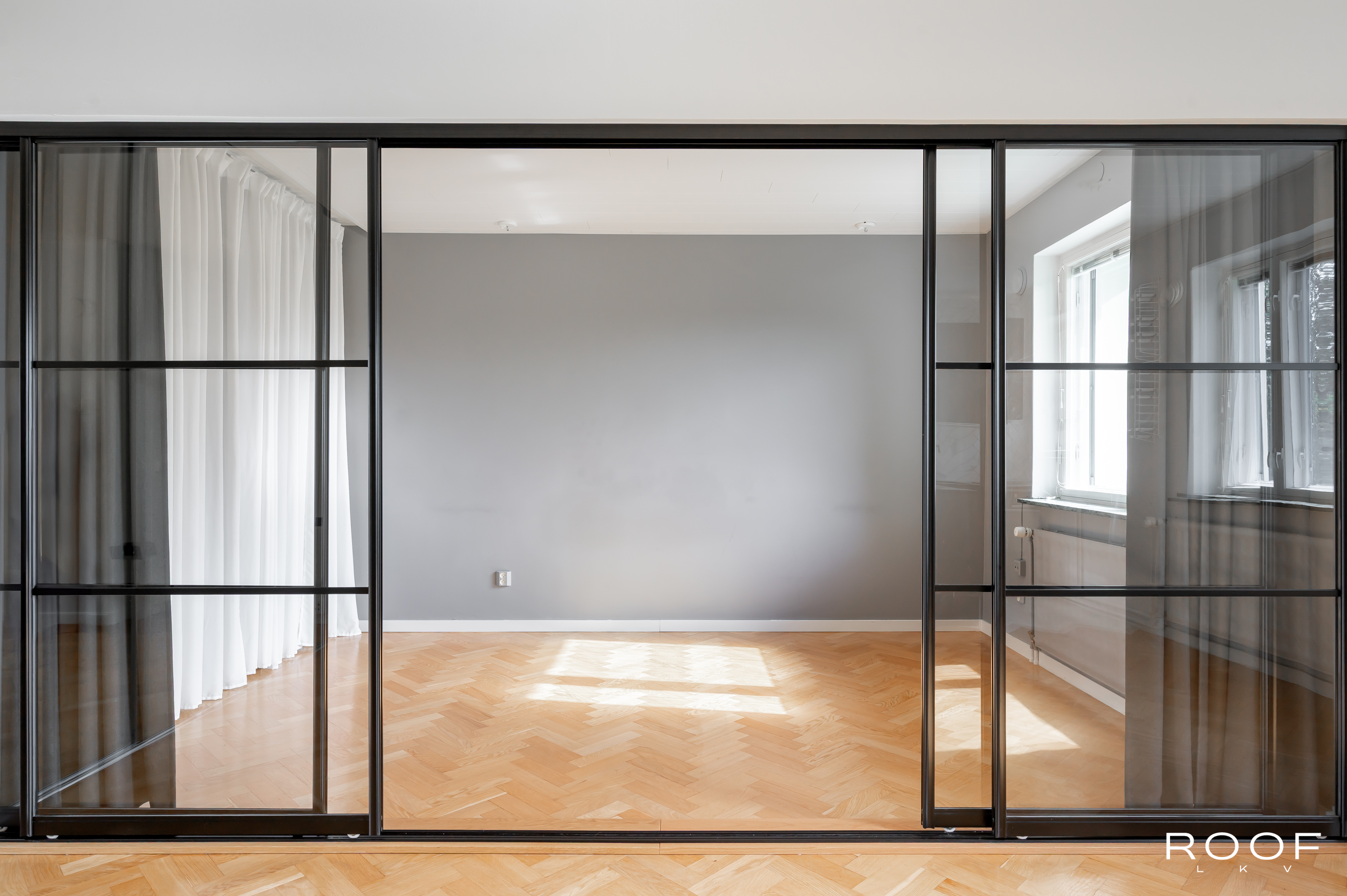 Olohuoneen ja makuuhuoneen lattioissa on klassinen kalanruotoparketti, joka tuo tilaan lämpöä ja arvokkuutta. Makuuhuoneen ja olohuoneen välissä on tyylikkäät lasiruutuovet tummilla kehyksillä, jotka tuovat tilaan loft-henkisyyttä ja avaruuden tuntua.