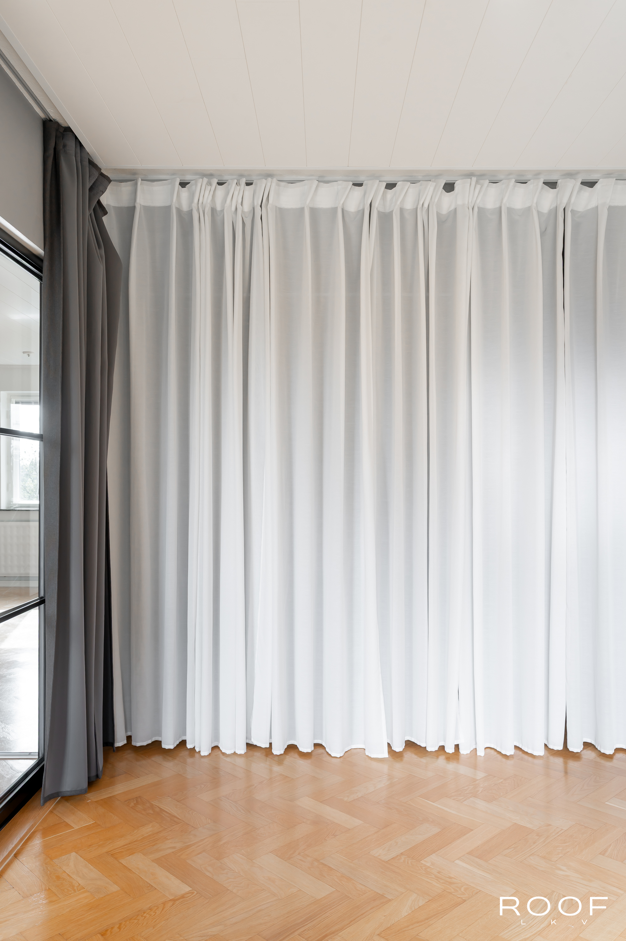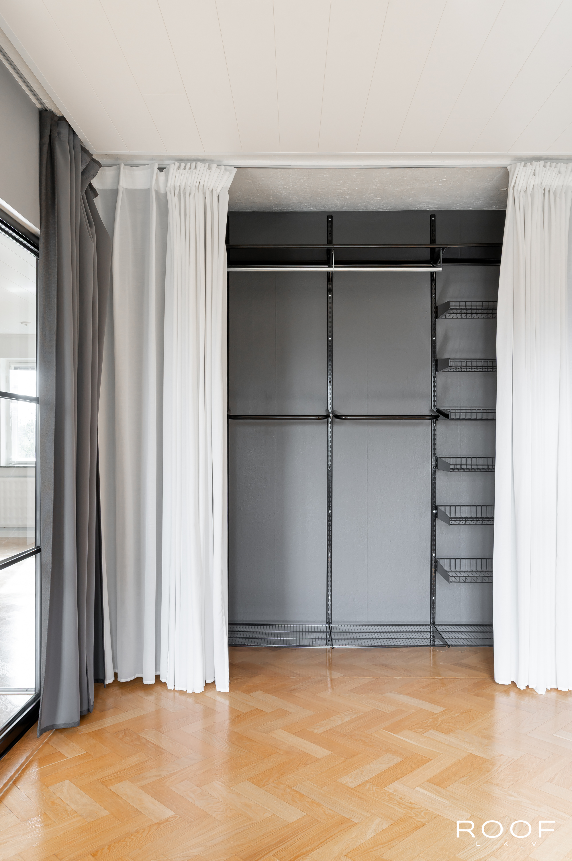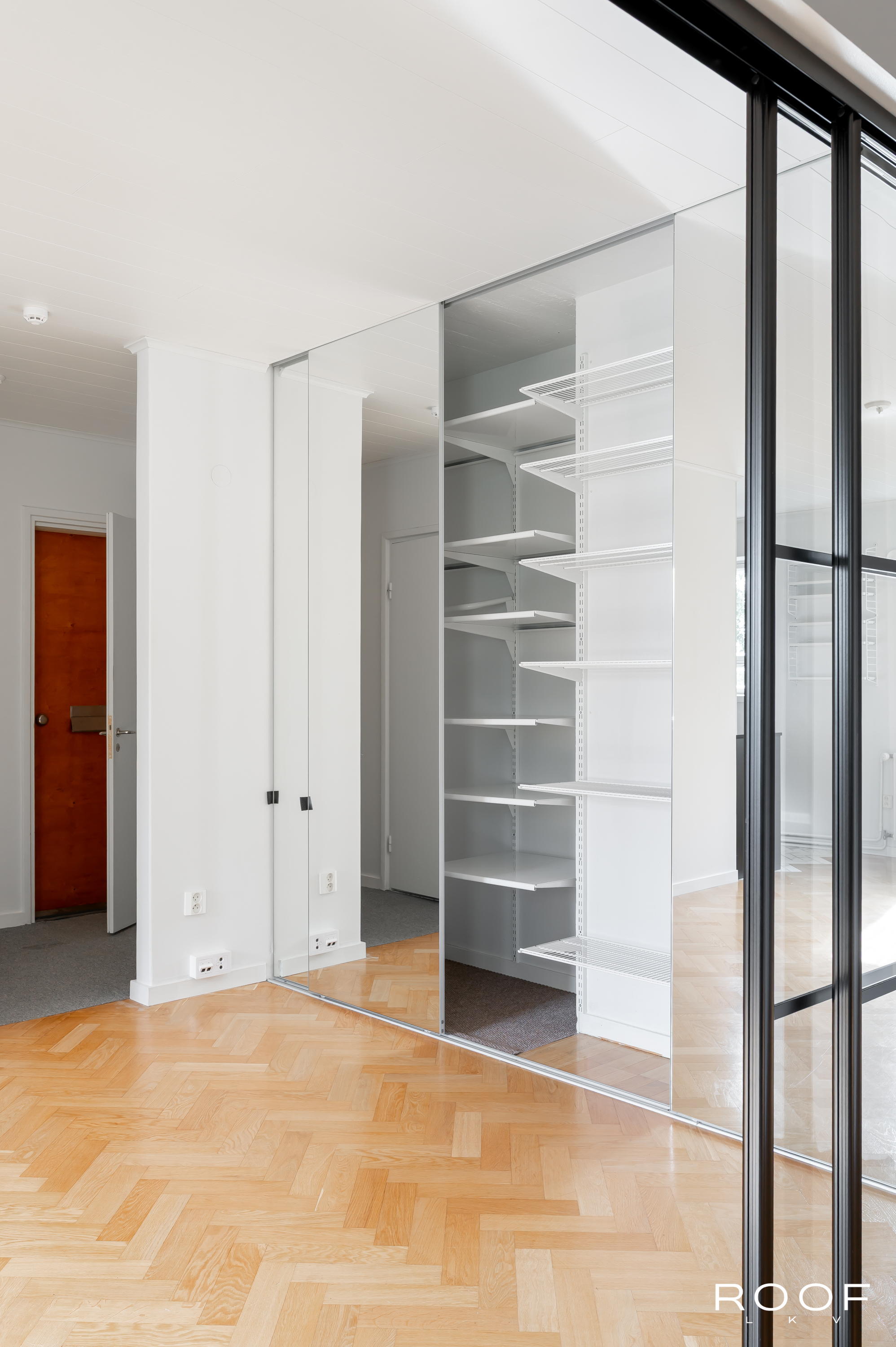 Säilytysratkaisut on toteutettu laadukkailla Sovella-järjestelmillä: olohuoneessa peililiukuovilla ja makuuhuoneessa verhoin viimeistellyillä ratkaisuilla.